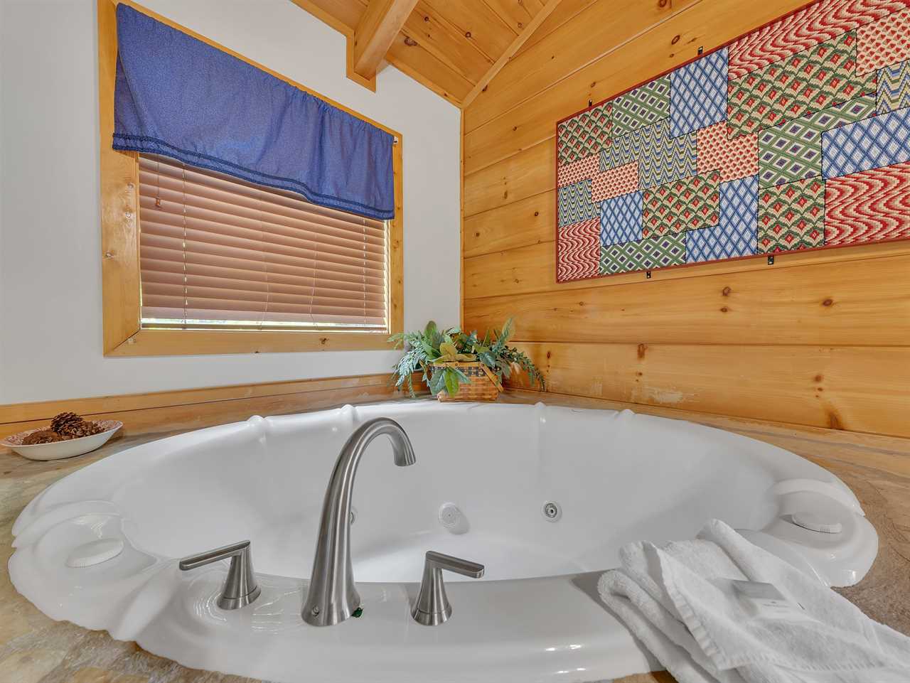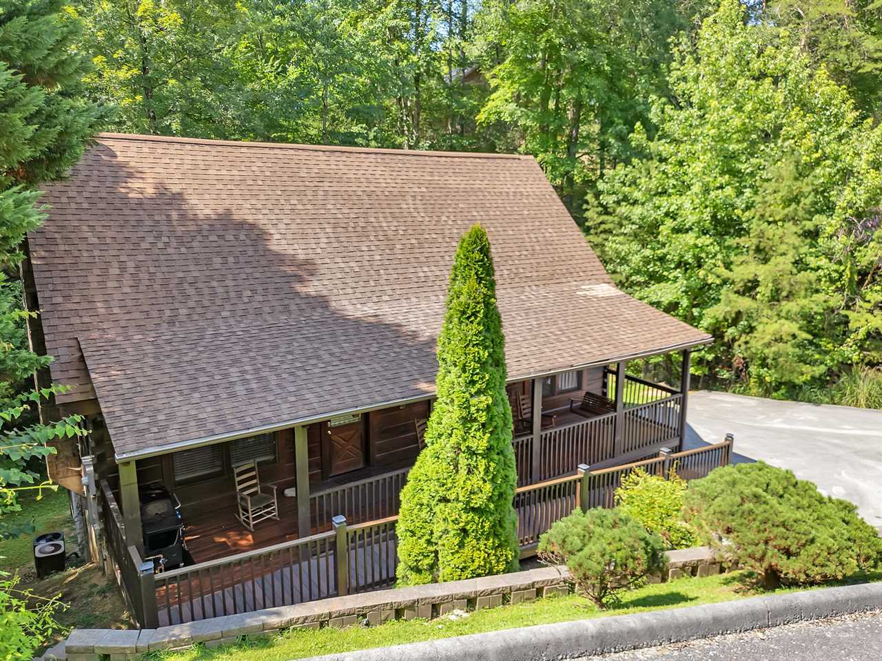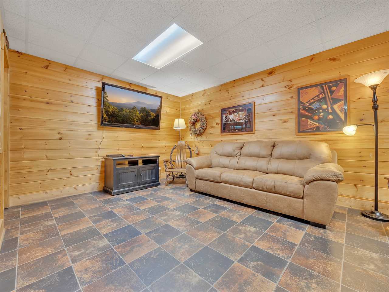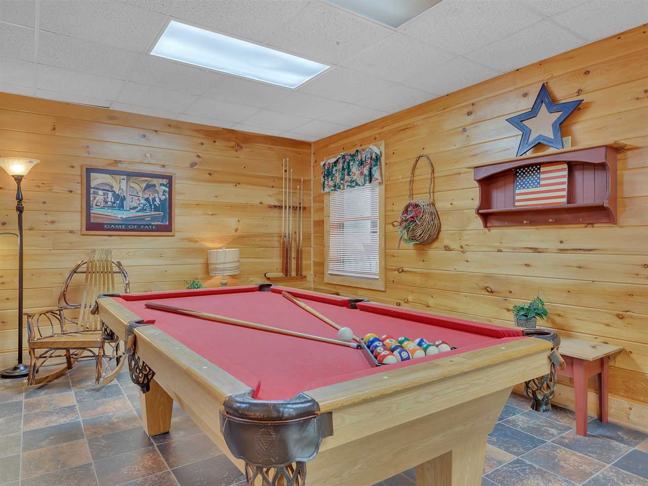 ER309, George's – 5-Bedroom Log Cabin in Pigeon Forge with Game Room, Hot Tub & More! Escape to the Smokies at George's, a spacious three-level log cabin tucked in a charming log cabin community with swimming pool access. Offering 5 bedrooms, 4 bathrooms, a private hot tub, game room, and Jacuzzi, this beautifully designed cabin is perfect for families, couples, or group getaways. Located just minutes from Pigeon Forge, Gatlinburg, and the Great Smoky Mountains National Park, you'll enjoy the best of both worlds—peaceful seclusion with easy access to all the action. Main Level Step into a cozy living area with a stacked stone gas fireplace, queen sleeper sofa, recliner, and plush seating. Enjoy entertainment on the 85" TV , all under a soaring vaulted ceiling with warm wood accents. The fully equipped kitchen features granite countertops, tile floors, 2 coffeemakers, and a Keurig (pods not included), along with a dining area that seats up to 10 guests comfortably. Two queen bedrooms with TVs are on this level, along with a full bathroom featuring a stand-up shower with grab bars for added convenience. Upper Level Retreat to the master suite with a king bed, private Jacuzzi tub, TV, and private en-suite with stand-up shower. Lower Level Get ready for fun in the game room with pool table, wet bar, complete with a TV, queen sleeper sofa, and a variety of seating options. Two additional queen bedrooms each have private bathrooms with a tub/shower combo, and there's a stacked washer/dryer for your convenience. Outdoor Amenities Front deck: Gas Grill - 4 wooden rockers, porch swing, and ceiling fans Back deck: picnic table, and private hot tub with privacy louvers Lower deck: Hammock Sitting area with 4 chairs, table and peaceful woodland views