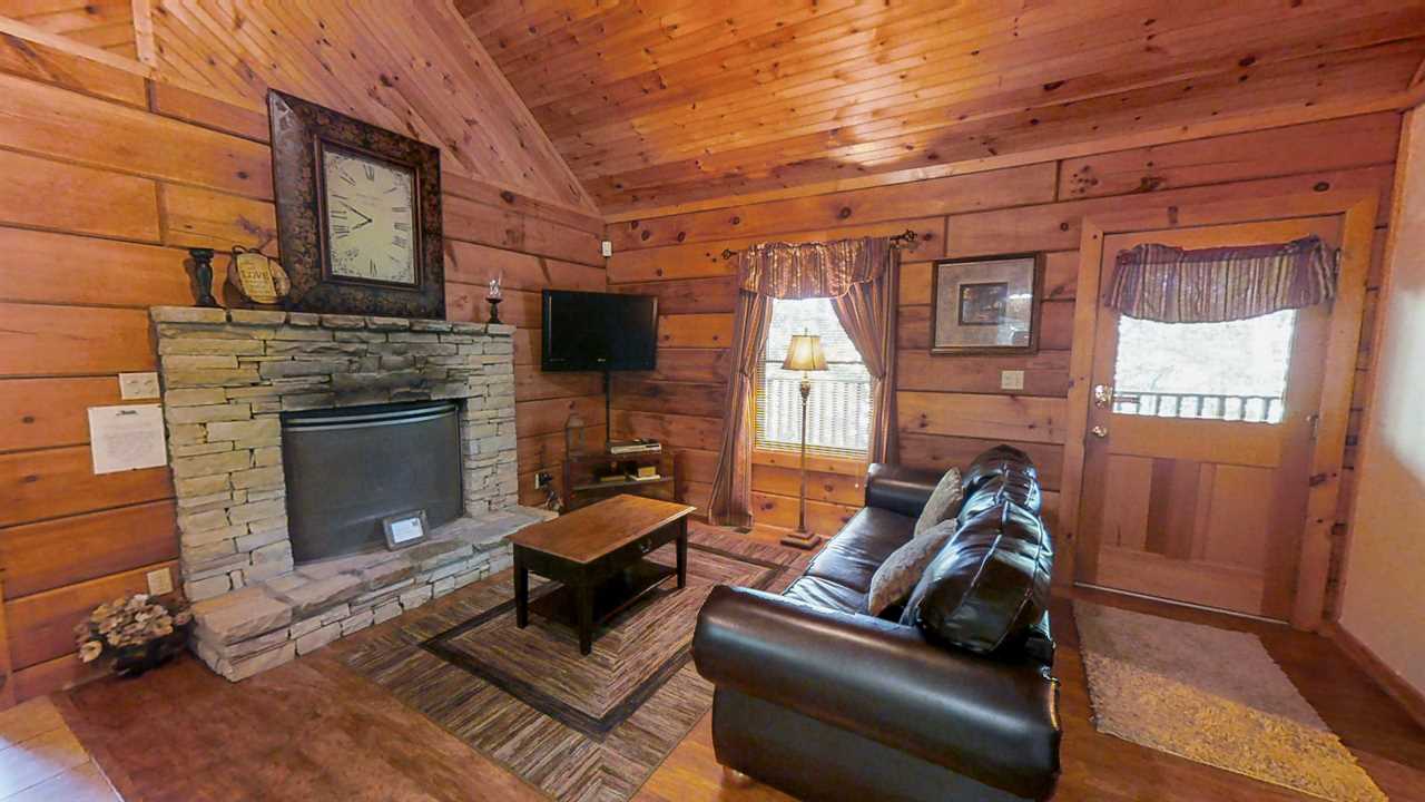 Cozy up by the fire and get ready to relax in the inviting living room! This charming space is the perfect spot to unwind after a day of exploring the great outdoors. The room's focal point is the wood-burning fireplace, where you can snuggle up with a good book or a warm cup of coffee as the flames crackle and pop. And with the queen-sized sofa sleeper, you'll have plenty of comfortable seating for a cozy night. Enjoy the flat-screen TV for endless entertainment options. Or, connect your device to the built-in USB ports and enjoy your own streaming services. Soft rugs and rustic wooden accents complete the warm and welcoming atmosphere, making this room the perfect retreat from the stresses of everyday life. Whether you're looking for a romantic getaway or a fun family vacation, the living room is the perfect spot to gather and make memories that will last a lifetime.