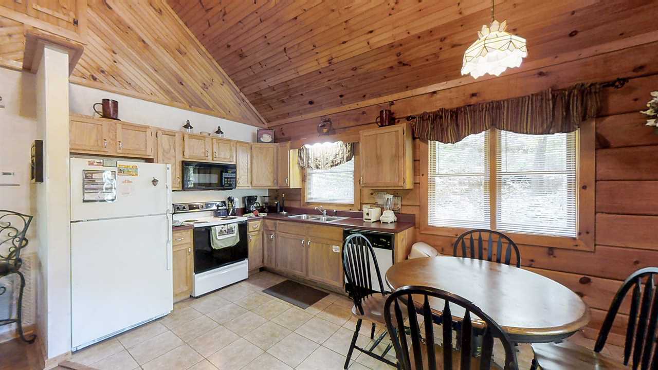 Get cooking in our fully equipped kitchen, where you'll find everything you need to whip up a delicious meal in this cozy cabin. The kitchen has all the essentials, including a refrigerator to keep your groceries fresh, a microwave for quick reheating, and a stove. And don't worry about doing dishes - our cabin's dishwasher makes cleanup a breeze! But it's not just about cooking - it's about savoring every moment around the table with loved ones. The dining room table seats four comfortably, perfect for family dinners or gatherings with friends. And to start your day right, there's a coffee maker to brew the perfect cup. From breakfast to dinner and everything in between, our kitchen is the heart of this charming cabin. And with its rustic charm and cozy atmosphere, you'll feel like dining in your home.