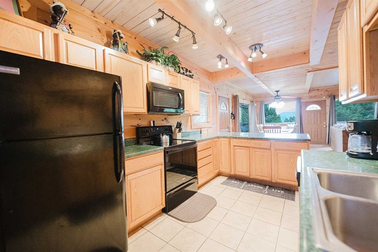 Create delicious meals and gather around the table to share in the flavors of the Smoky Mountains in our fully equipped kitchen, including a refrigerator, electric stove, and microwave; you'll have everything you need to whip up a family feast or a romantic dinner for two. But it's not just about cooking - it's about gathering and sharing memories. That's why we've designed the kitchen to be the heart of the home. There is ample counter space for food preparations, while the nearby breakfast bar seats four and is perfect for casual dining or enjoying a morning coffee. Just off the kitchen, the dining room table seats eight, providing a spacious and comfortable gathering spot for family and friends. With plenty of elbow room and a beautiful view of the surrounding mountains, this is the perfect spot to share stories of your day's adventures or enjoy a leisurely breakfast. With the additional seating at the breakfast bar, you can easily accommodate larger groups and make memories that will last a lifetime. Dish towels, starter dish soap, and starter dishwasher pods are provided.