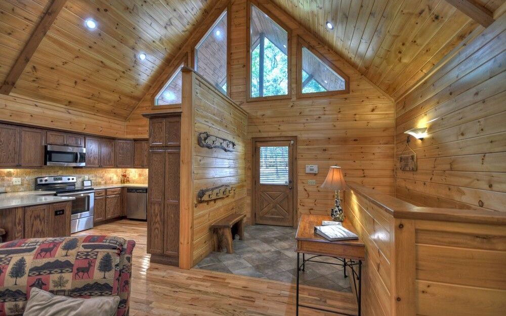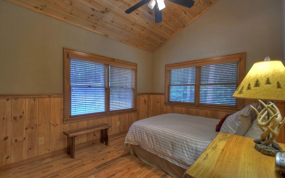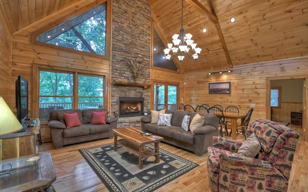 DOGWOOD RETREAT - **Spacious Cabin** Surrounded by beautiful oak trees with dogwoods scattered in, this 6-bedroom 3-bath cabin will accommodate up to 13 guests. The main level of the cabin offers 3 bedrooms one with a King which we call the Master and has a King bed with adjoining bathroom with Shower and Jacuzzi Tub, the other 2 offers Queen beds with a bathroom to share. The downstairs area will give you a large family room with another gas log fireplace and a Flat screen TV with a Pool Table for enjoying your family time. There are 3 more bedrooms with one room containing 2 double full beds another with a Queen and the 6th bedroom has a Bunk Bed which has a full bed on the bottom with the bunk above. There is a bathroom there to be shared with these bedrooms. Dogwood it a fantastic place for church retreat groups or for your summer rafting trips. The Ocoee River is located only minutes away from the cabin where you can enjoy a day on the river with Whitewater Rafting. The easy access paved community offers beautiful mountain views around. When you enter the front door, you are welcomed by the beautiful stone fireplace with gas burning logs. There is seating for 8 at the dining room table with extra seating at the bar stools. The fully furnished kitchen is stocked with everything you need to prepare your family meals. Park Style Charcoal Grill located in the Firepit area is provided, where you can grill your hamburgers or Steaks. Bring your own Charcoal. The large decks on the back of the cabin offer a peaceful place, you can also enjoy the Beautiful Fire Pit Area where your family can roast Hot Dogs or make s'mores' as you enjoy family time around a roaring fire. Enjoy reading in the quietness of the surrounding woods or just watching and listening to nature at this peaceful cabin. Call to today for total quotes for your groups and let us help you plan your family retreat at Dogwood Retreat.