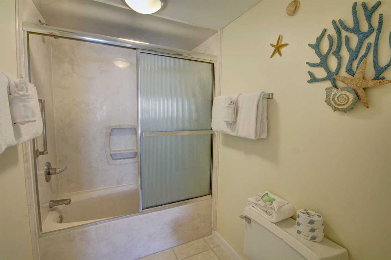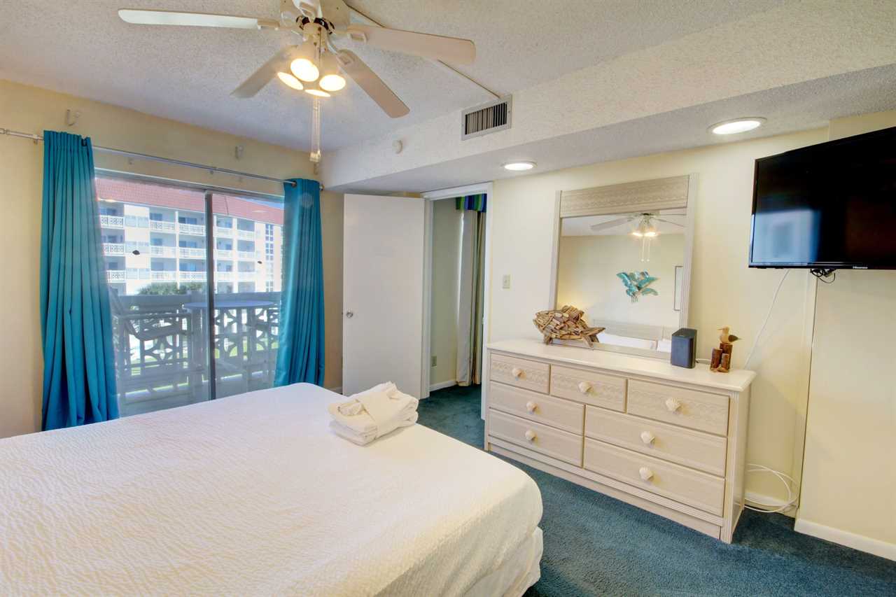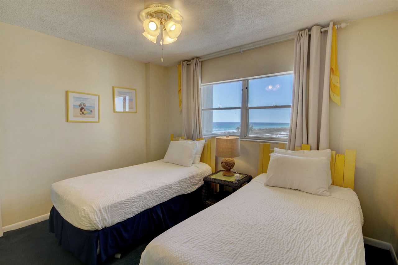 This 2 bedroom, 2 bathroom unit is located in building 4 on the 4th floor. Enjoy views from the kitchen, living room and master bedroom. The kitchen is fully furnished so you can enjoy eating in on days when you want to avoid the crowds. The dining area accommodates 6 people with 4 at the table and 2 at the bar area. The living room has a sofa sleeper and a large smart TV with access to the balcony. The master bedroom has a king size bed and also has private balcony access. The guest bedroom has two twin size beds and a great view of Okaloosa Island. Both bedrooms have smart TV's and USB chargers. The guest bathroom has a LED shower-head.