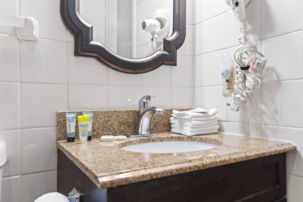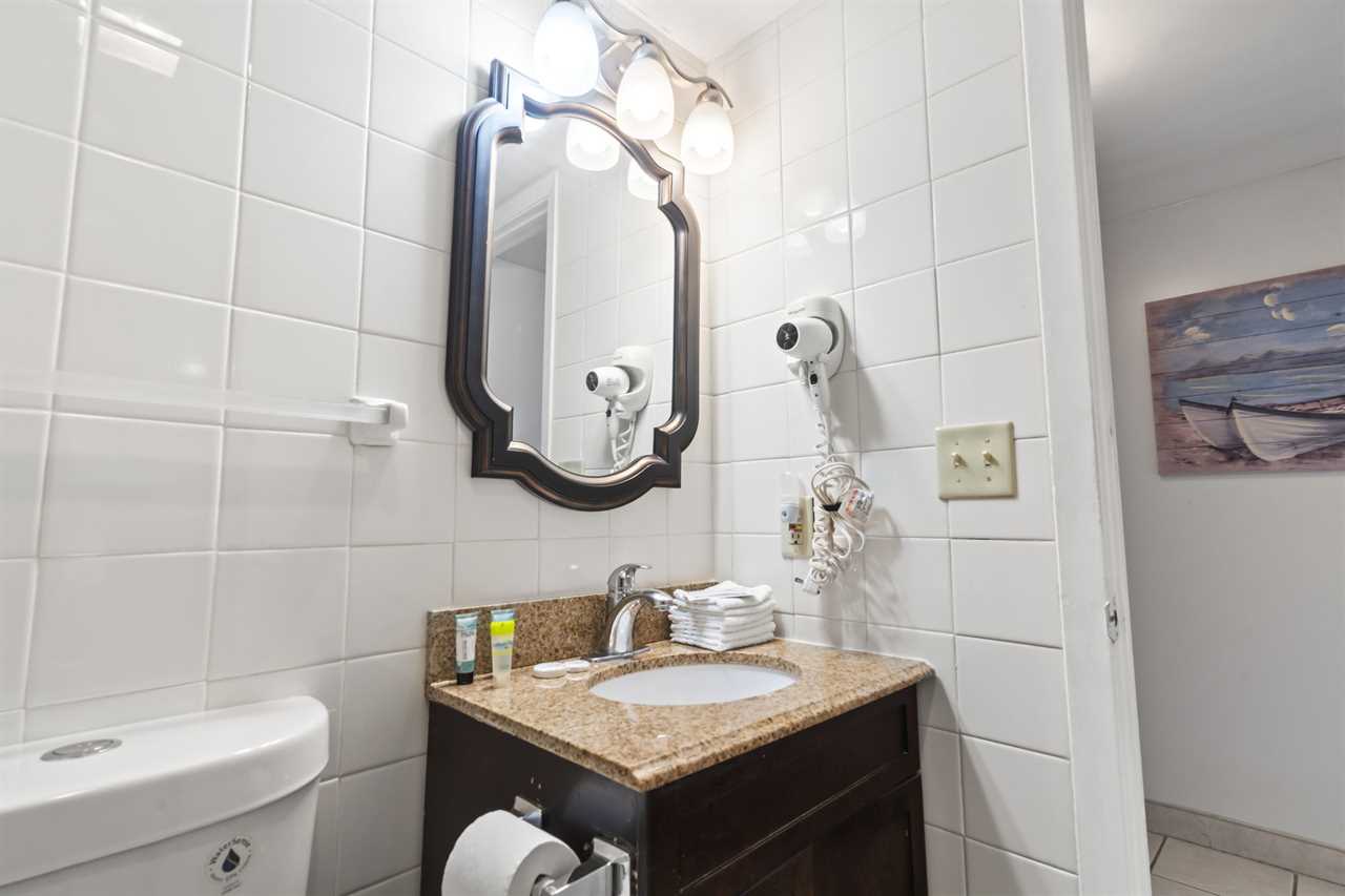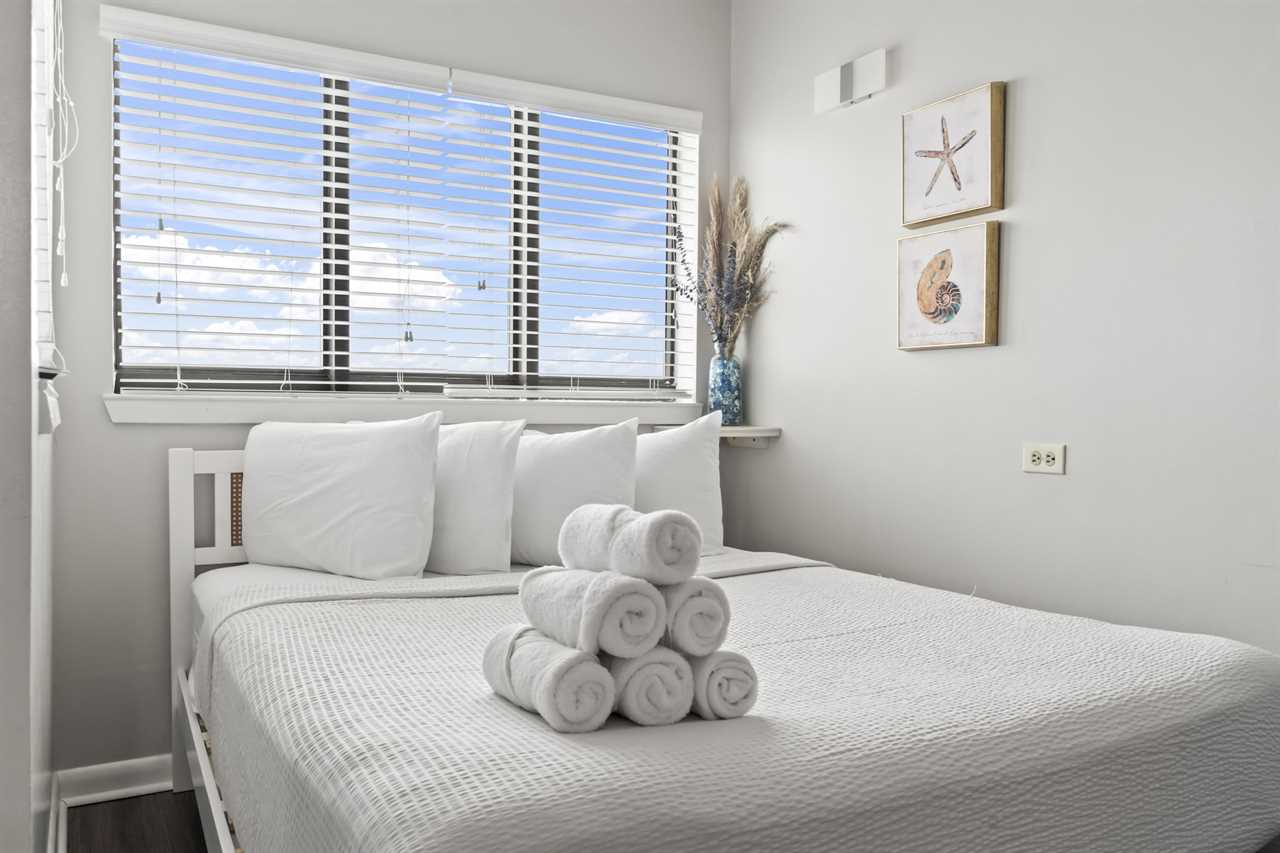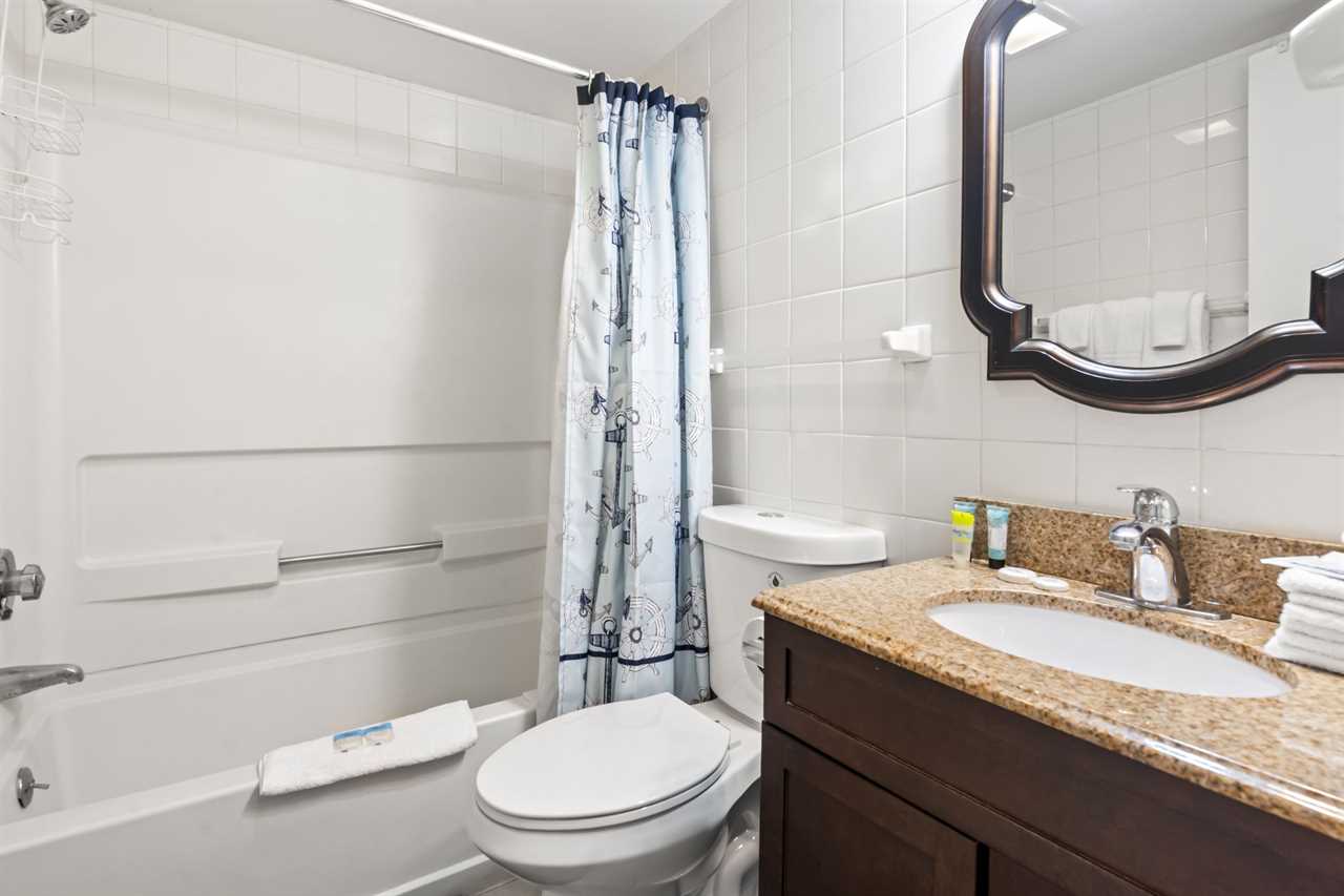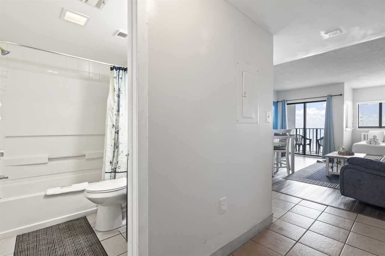 Guests will enter into the condo and find the bathroom to their left. The stunning white tile throughout makes for a bright and clean experience. The bathroom features a shower/tub combo, full vanity sink with underneath storage, toilet, and mirror. Our guests appreciate the convenience of a provided hair dryer, a full set of towels, and starter toiletries.