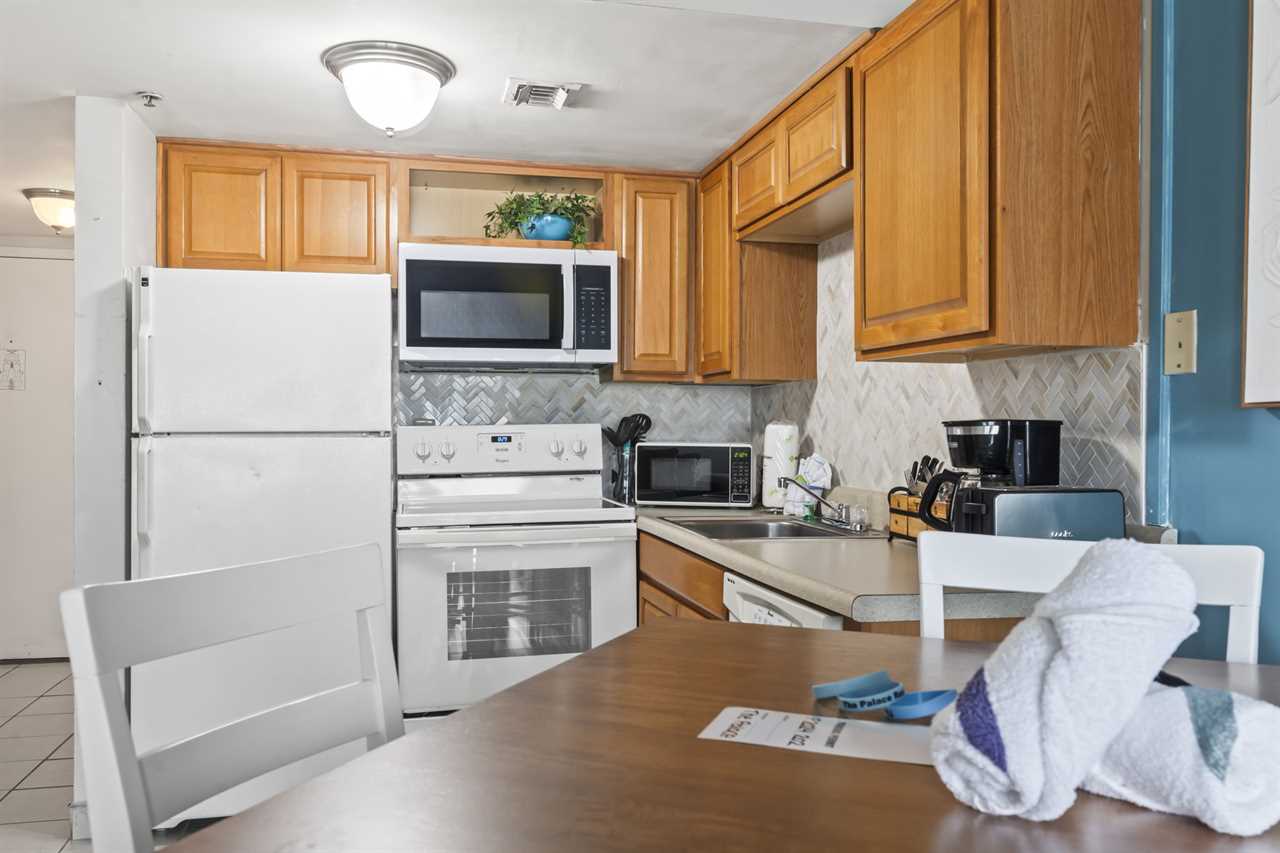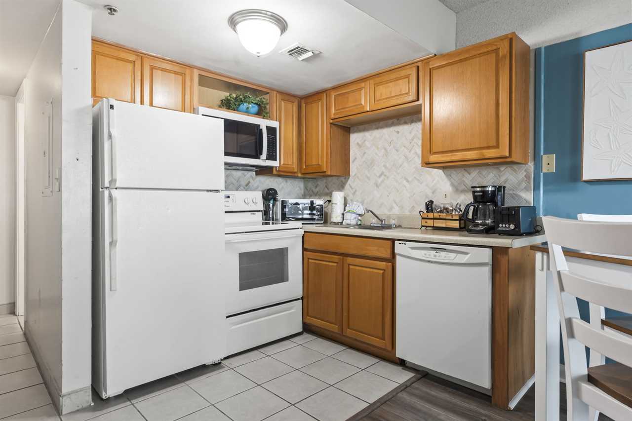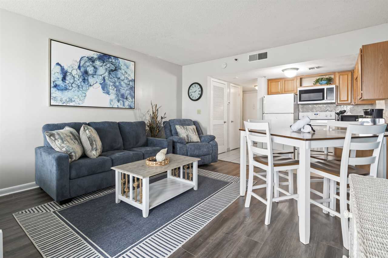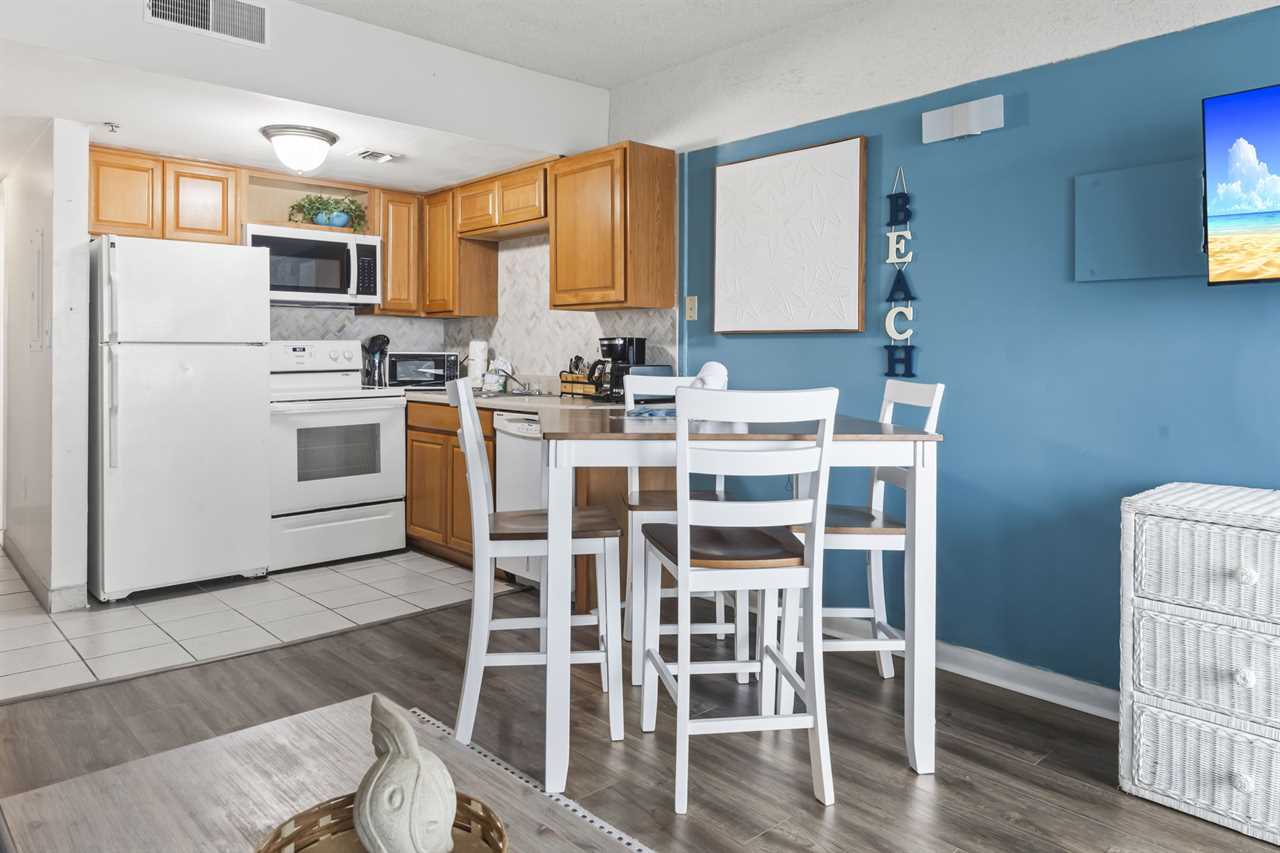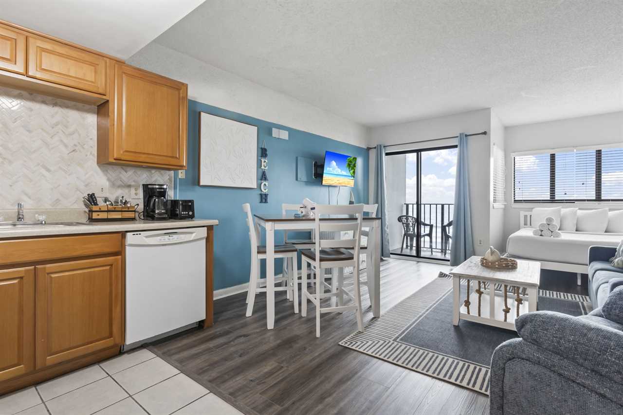 The rest of the condo includes the living and sleeping space, as well as the kitchen. The kitchen was recently remodeled, showcasing a beautiful backsplash that makes the space feel inviting. With plenty of counter space, cabinet space, and full sized appliances including a refrigerator, mounted microwave, stove and oven, plus a dishwasher, cooking a meal will not be an issue! All of our properties have fully stocked kitchens, meaning we provide all pots and pans, cookware, dinnerware, and silverware. This listing also features a full-size dishwasher, fridge, freezer, stove, oven, as well as small appliances like a coffee maker. For guests who prefer to dine out, Myrtle Beach offers hundreds of dining options; many of which are within walking distance or a short ride from The Palace. Many of these restaurants offer delivery, and food delivery options such as Uber Eats and DoorDash are very popular in the area as well.