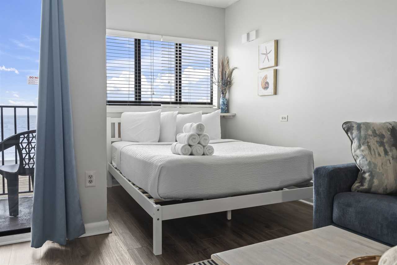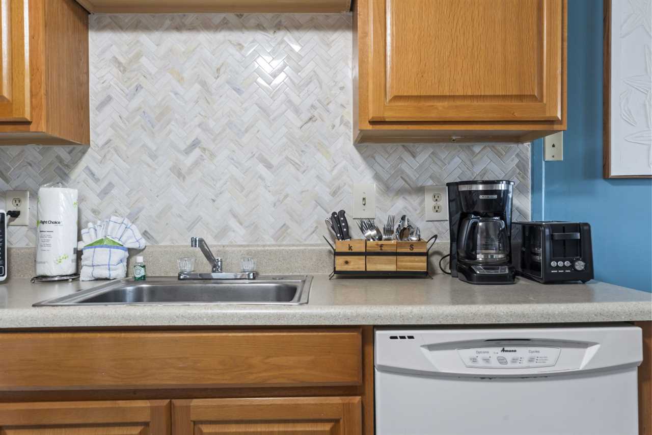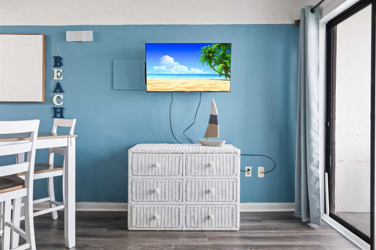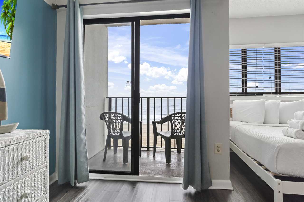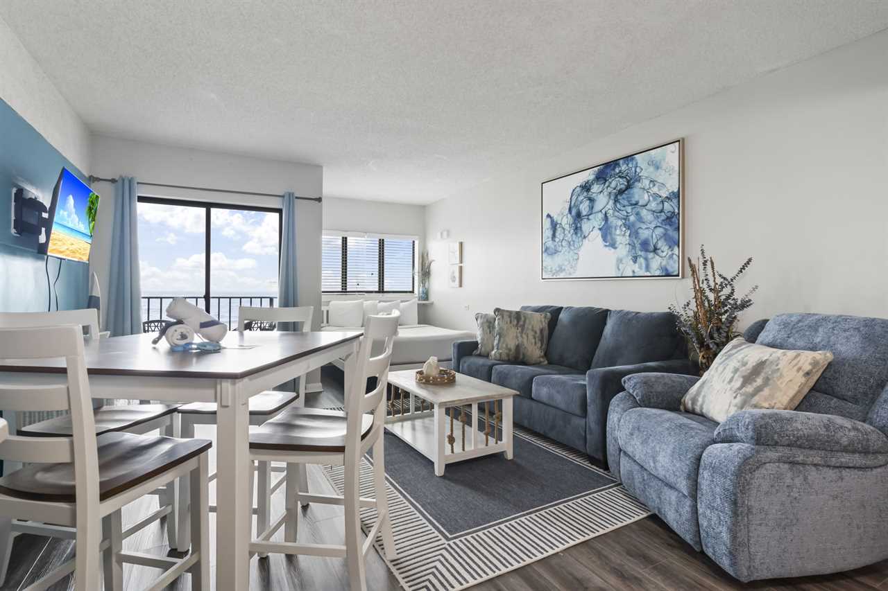The rest of the condo includes the living and sleeping space, as well as the kitchen. The kitchen was recently remodeled, showcasing a beautiful backsplash that makes the space feel inviting. With plenty of counter space, cabinet space, and full sized appliances including a refrigerator, mounted microwave, stove and oven, plus a dishwasher, cooking a meal will not be an issue! All of our properties have fully stocked kitchens, meaning we provide all pots and pans, cookware, dinnerware, and silverware. This listing also features a full-size dishwasher, fridge, freezer, stove, oven, as well as small appliances like a coffee maker. For guests who prefer to dine out, Myrtle Beach offers hundreds of dining options; many of which are within walking distance or a short ride from The Palace. Many of these restaurants offer delivery, and food delivery options such as Uber Eats and DoorDash are very popular in the area as well.