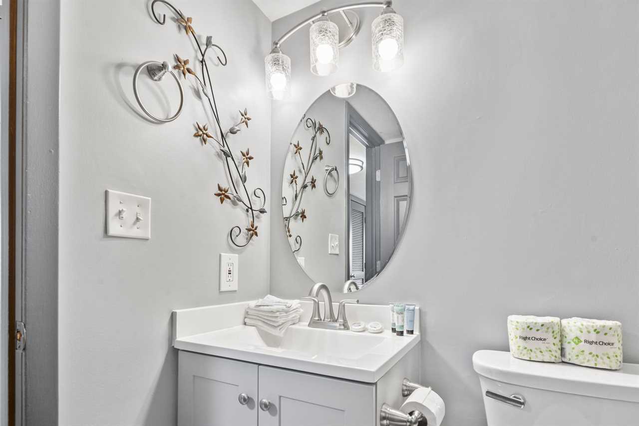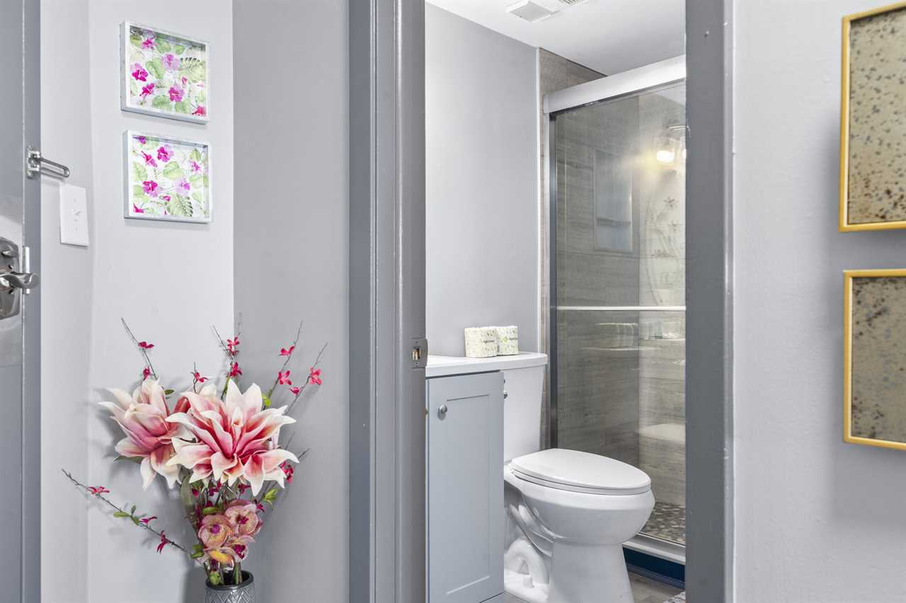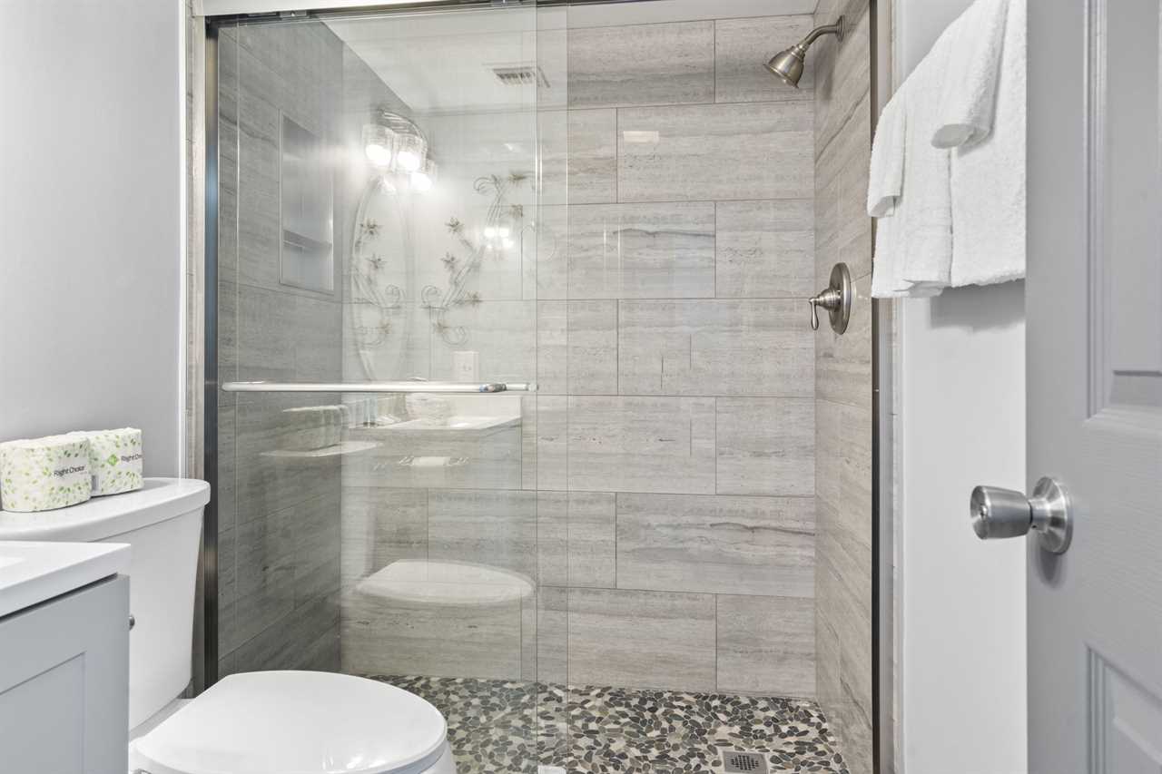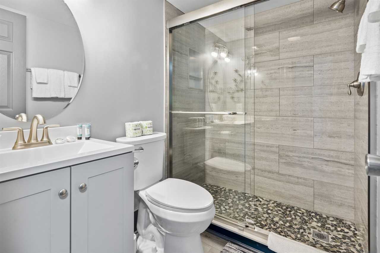 Toward the front of the condo, guests will find the updated bathroom, designed to offer a relaxing, spa-like experience. This space includes a beautifully tiled walk-in shower, a brand new vanity with extra storage, a well-lit mirror, and a toilet, all finished with modern touches to enhance your stay.