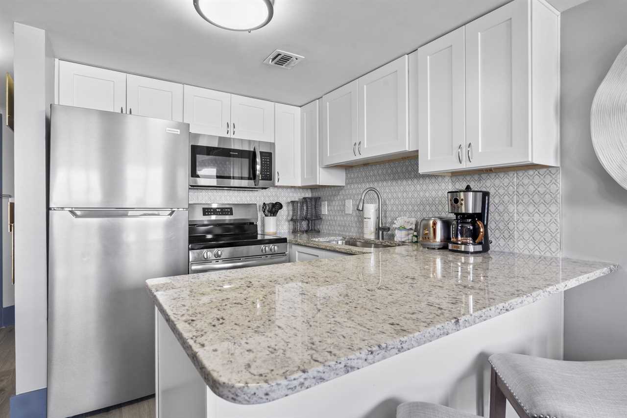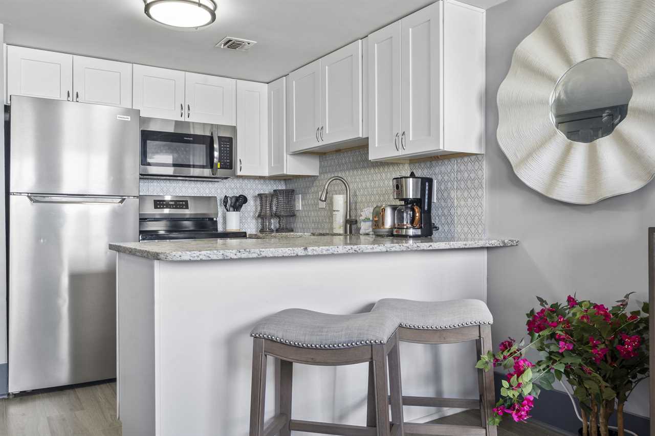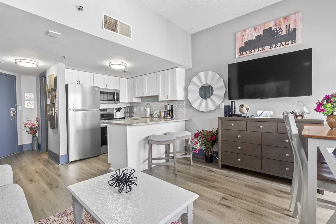 Upon entering this inviting studio, guests step into the main living area and kitchen. No detail has been overlooked in the fully updated kitchen, which boasts new granite countertops, custom cabinetry, and a modern backsplash. The space is equipped with stainless steel appliances, including a refrigerator, stove and oven, mounted microwave, dishwasher, and sink. Guests have everything they need to prepare a meal or snack at their convenience. For those who prefer to explore local dining, Myrtle Beach offers countless restaurants within a short walk or quick drive from the Palace Resort. Many local eateries provide delivery service, and apps like Uber Eats and DoorDash are also readily available.