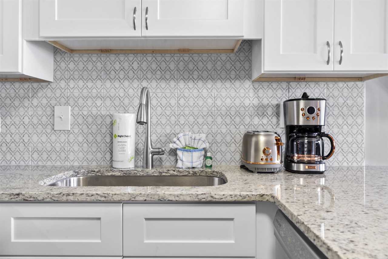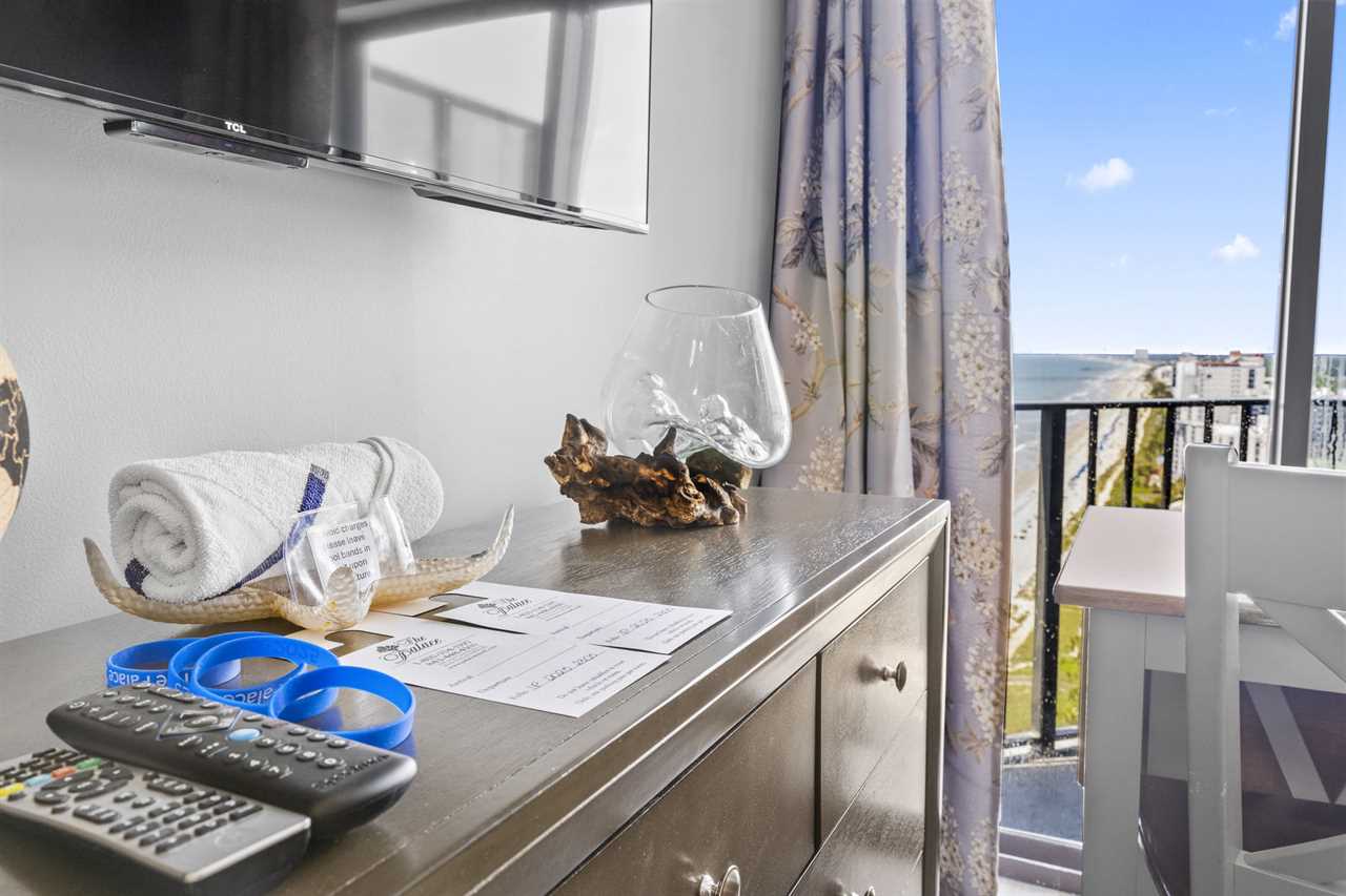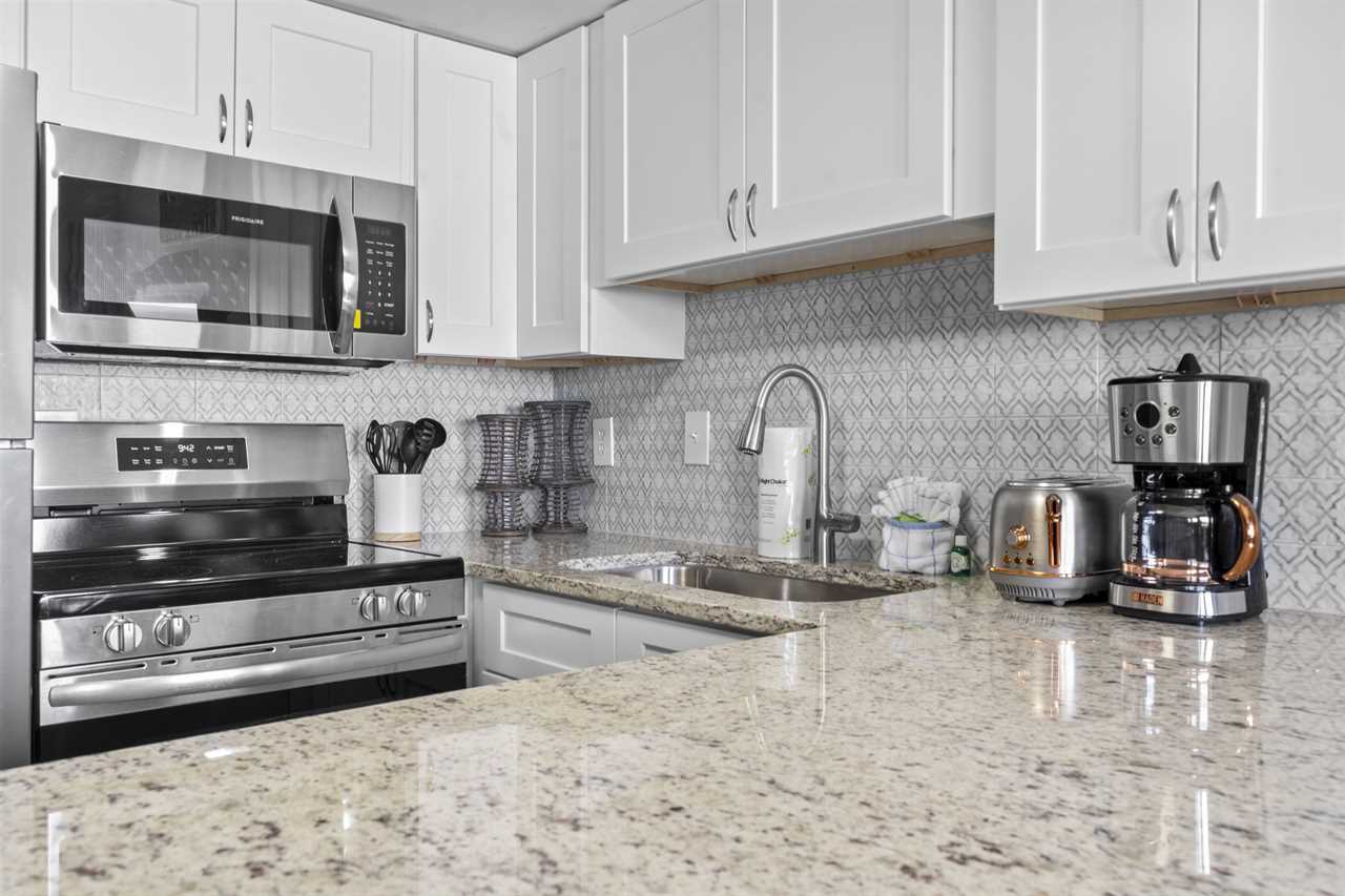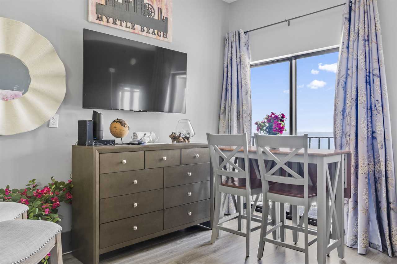 Upon entering this inviting studio, guests step into the main living area and kitchen. No detail has been overlooked in the fully updated kitchen, which boasts new granite countertops, custom cabinetry, and a modern backsplash. The space is equipped with stainless steel appliances, including a refrigerator, stove and oven, mounted microwave, dishwasher, and sink. Guests have everything they need to prepare a meal or snack at their convenience. For those who prefer to explore local dining, Myrtle Beach offers countless restaurants within a short walk or quick drive from the Palace Resort. Many local eateries provide delivery service, and apps like Uber Eats and DoorDash are also readily available.