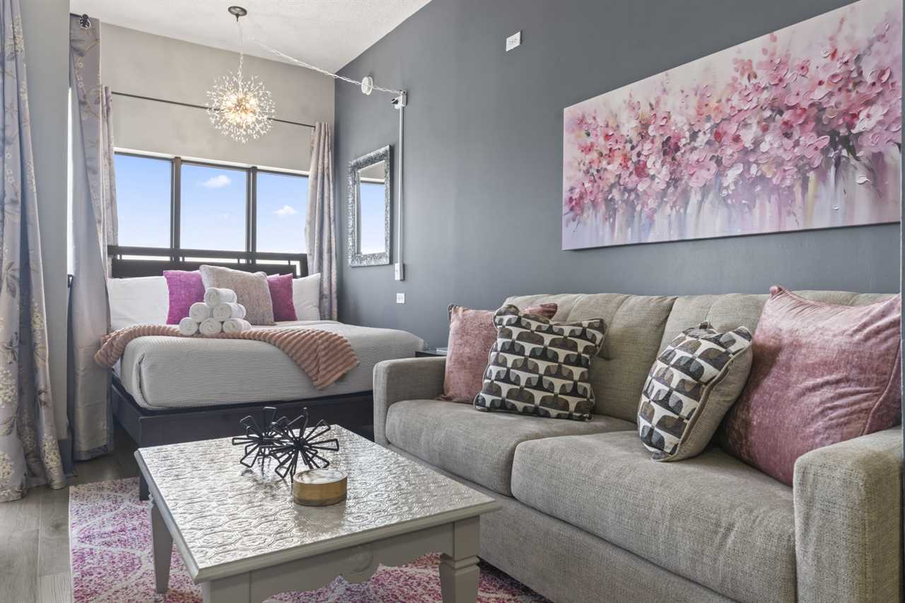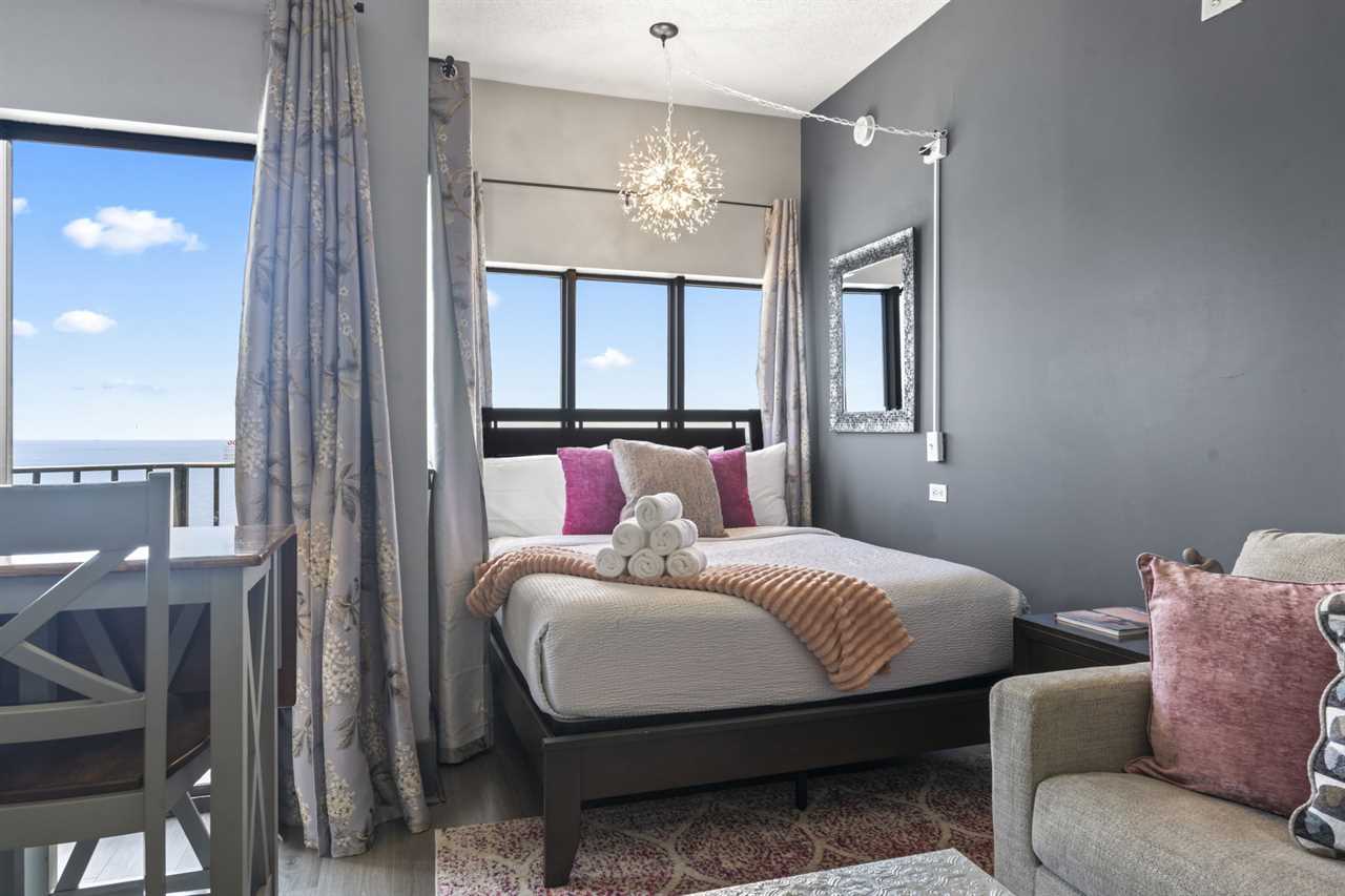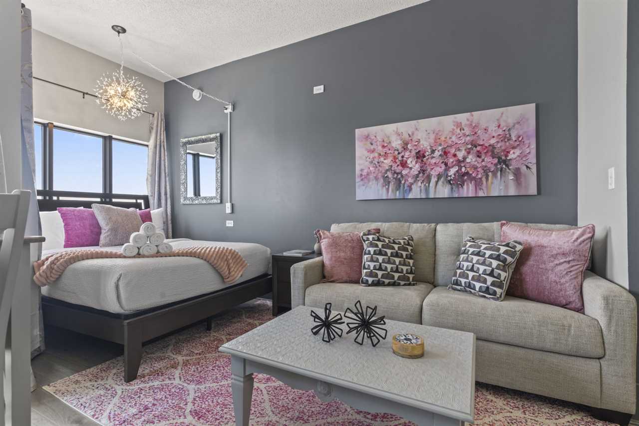 The main living area features a stylish sofa that converts into a bed placed in front of an entertainment center that doubles as a dresser, with a flat-screen TV mounted above for easy viewing. A dining table with seating for two is positioned across from the plush queen-sized bed, which is tucked into a cozy corner of the room. Overhead, a chic chandelier adds a touch of charm and provides just the right amount of ambient lighting.
