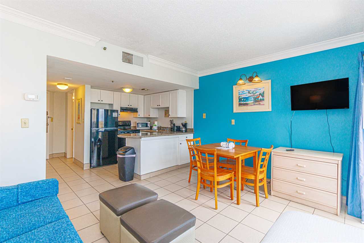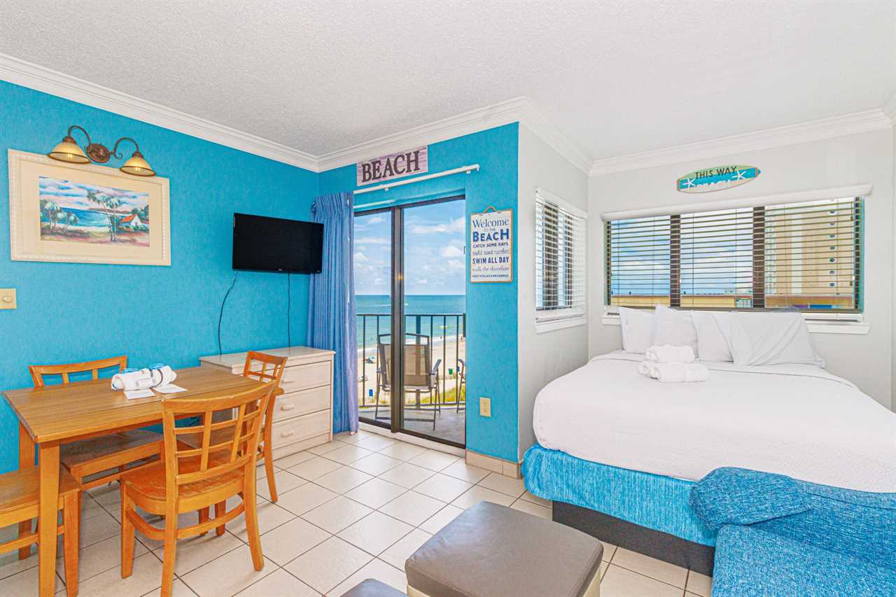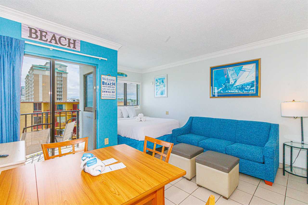 This fourth-floor studio welcomes you with a sweeping view of the ocean and pool, an instant reminder that you've arrived at your very own slice of Myrtle Beach paradise. Sunlight fills the space, reflecting off the water below and setting the tone for slow mornings, salty breezes, and carefree days. Whether you're planning a romantic escape or a peaceful retreat for two, this cozy studio offers the perfect balance of comfort and charm. With a queen bed and a full-size sleeper sofa, it can easily accommodate up to four guests when needed, without ever losing its intimate feel.