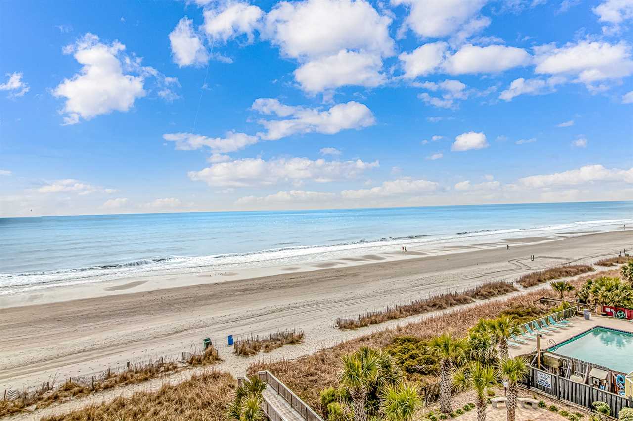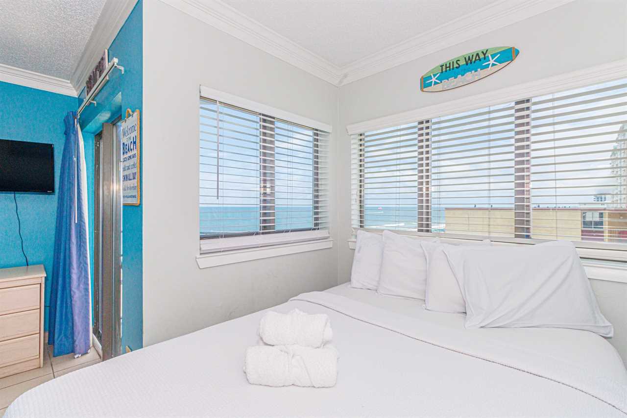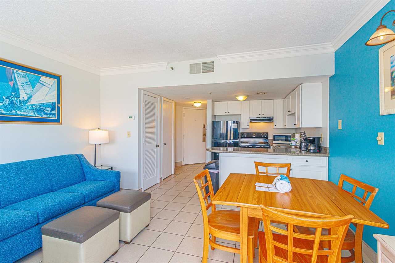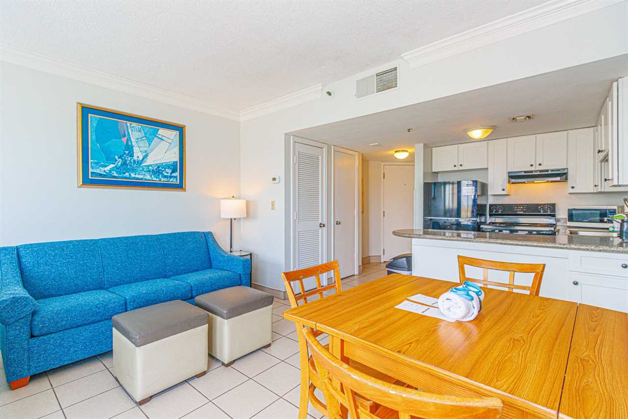 This fourth-floor studio welcomes you with a sweeping view of the ocean and pool, an instant reminder that you've arrived at your very own slice of Myrtle Beach paradise. Sunlight fills the space, reflecting off the water below and setting the tone for slow mornings, salty breezes, and carefree days. Whether you're planning a romantic escape or a peaceful retreat for two, this cozy studio offers the perfect balance of comfort and charm. With a queen bed and a full-size sleeper sofa, it can easily accommodate up to four guests when needed, without ever losing its intimate feel.