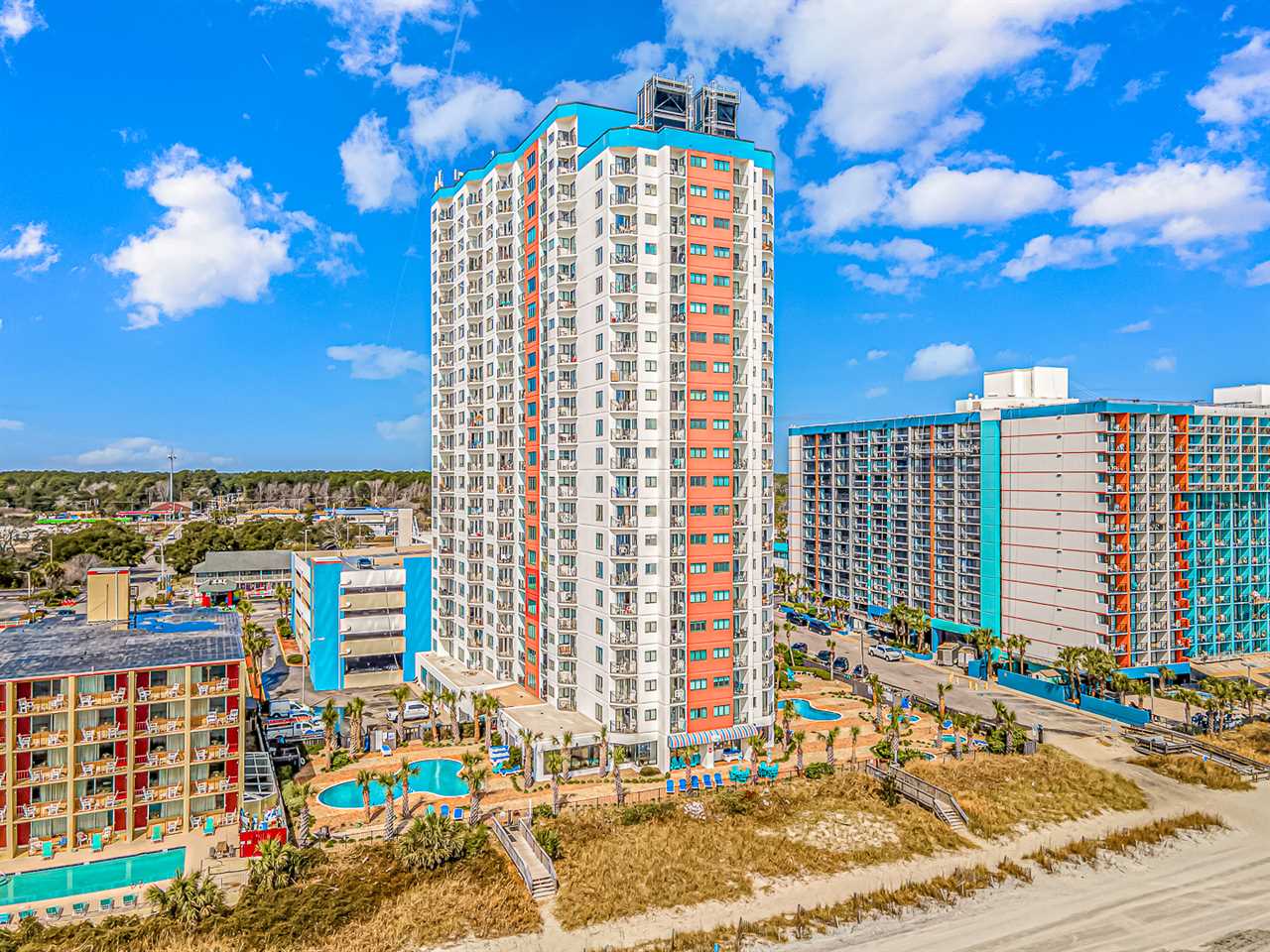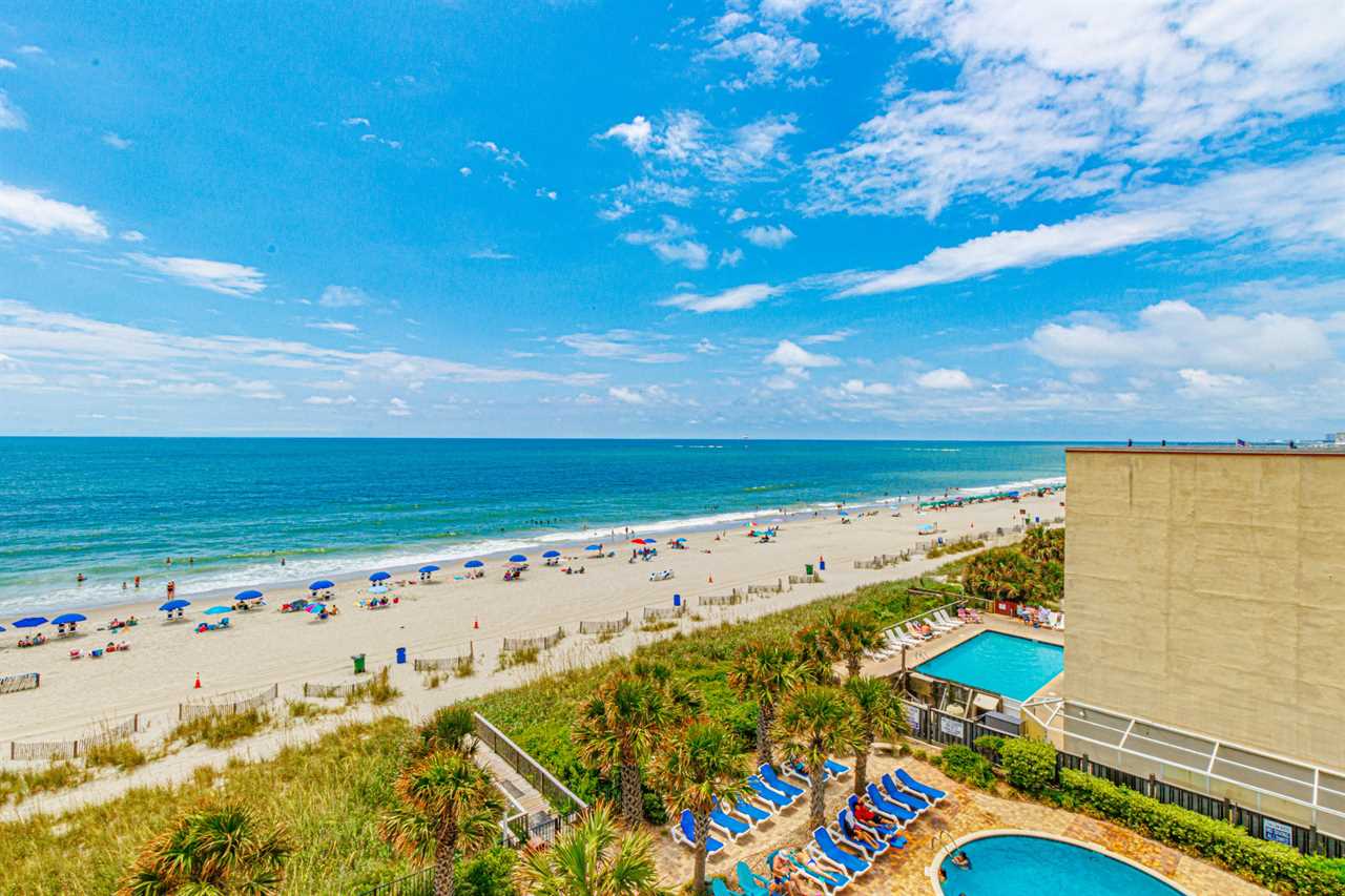 The Palace Resort brings the beach to your doorstep. Guests enjoy direct access to the shoreline, free parking, and a location that's hard to beat. Located on South Ocean Blvd, the resort sits just one mile from MYR International Airport and the Coastal Grand Mall, close enough for convenience but far enough to keep the peaceful beach atmosphere intact. A brand-new Walmart is just around the corner, and the surrounding area is filled with dining options, cafés, and local favorites waiting to be discovered.