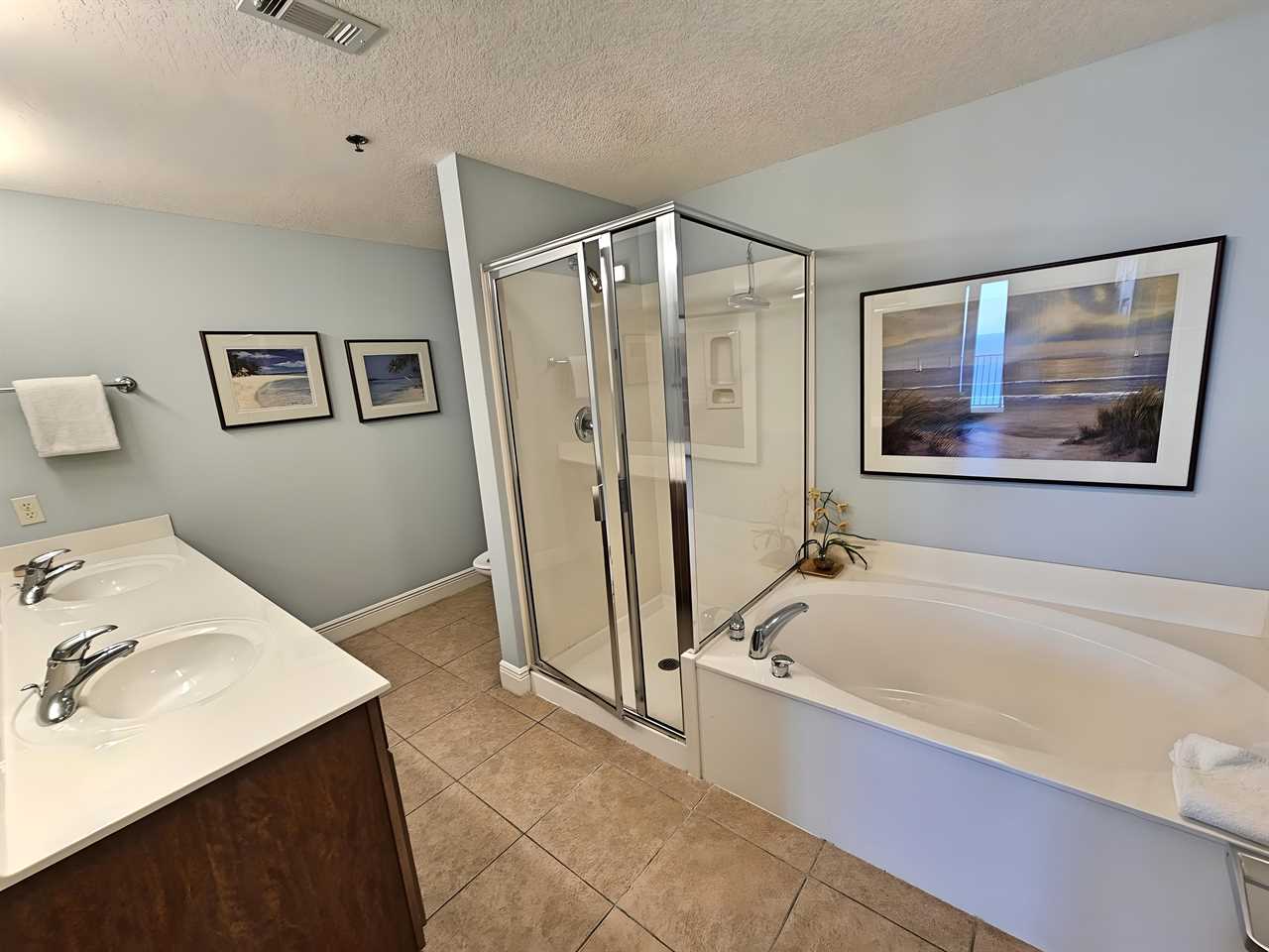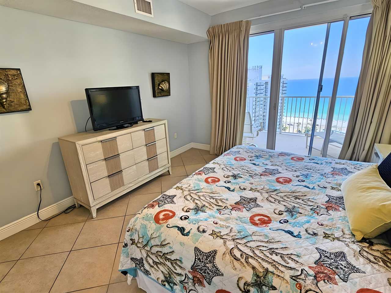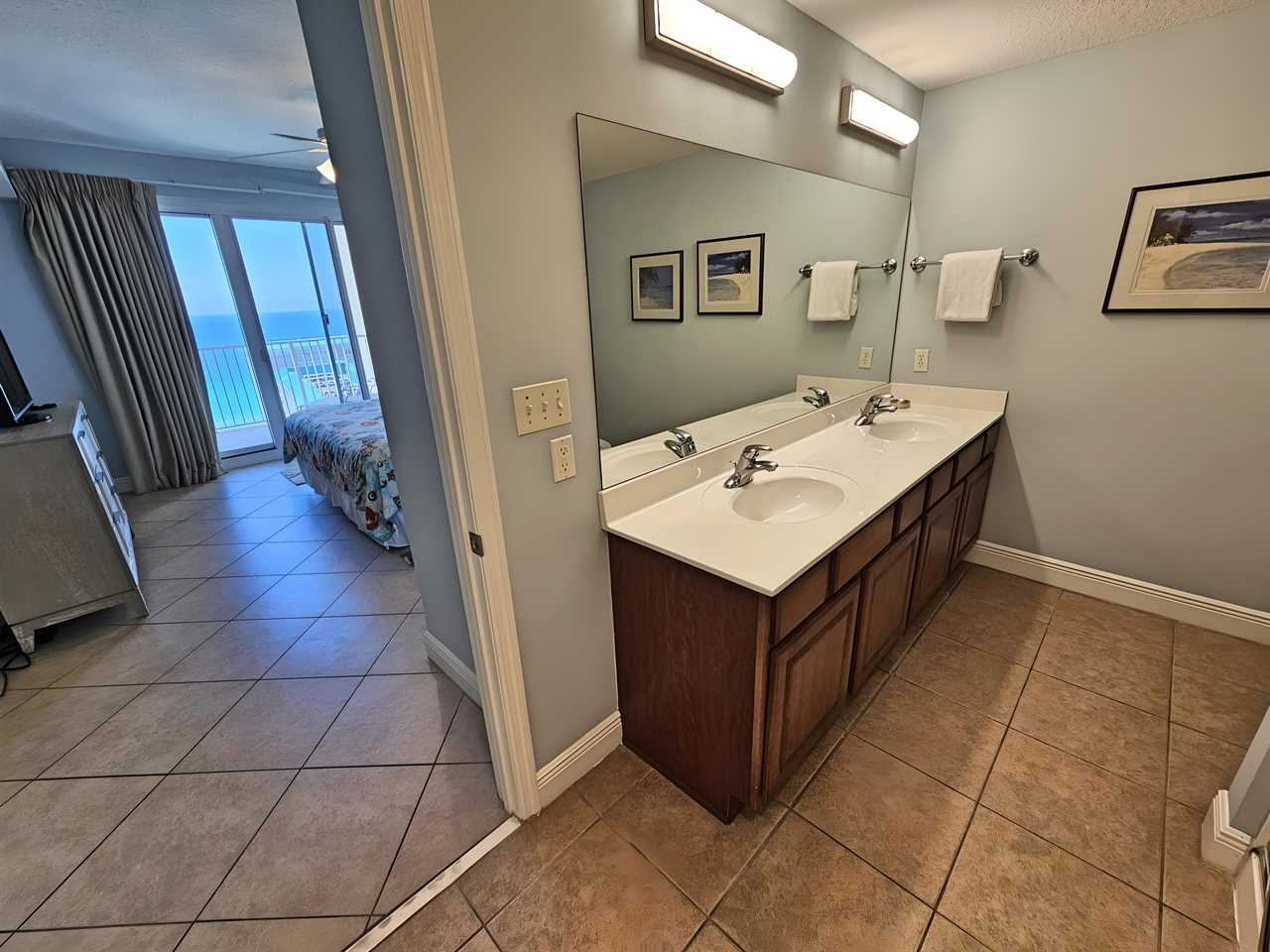 The master bedroom includes a premium extra thick pillow top king size bed with dresser and night stands, TV/DVD player, clock radio and closet. This room includes a private bathroom with separate shower and tub as well as a double vanity so there is plenty of room to spread out. The view from the bedroom is stunning as you look out over the beach and the beautiful Gulf of Mexico. There is also access to the oversized balcony from the master bedroom.