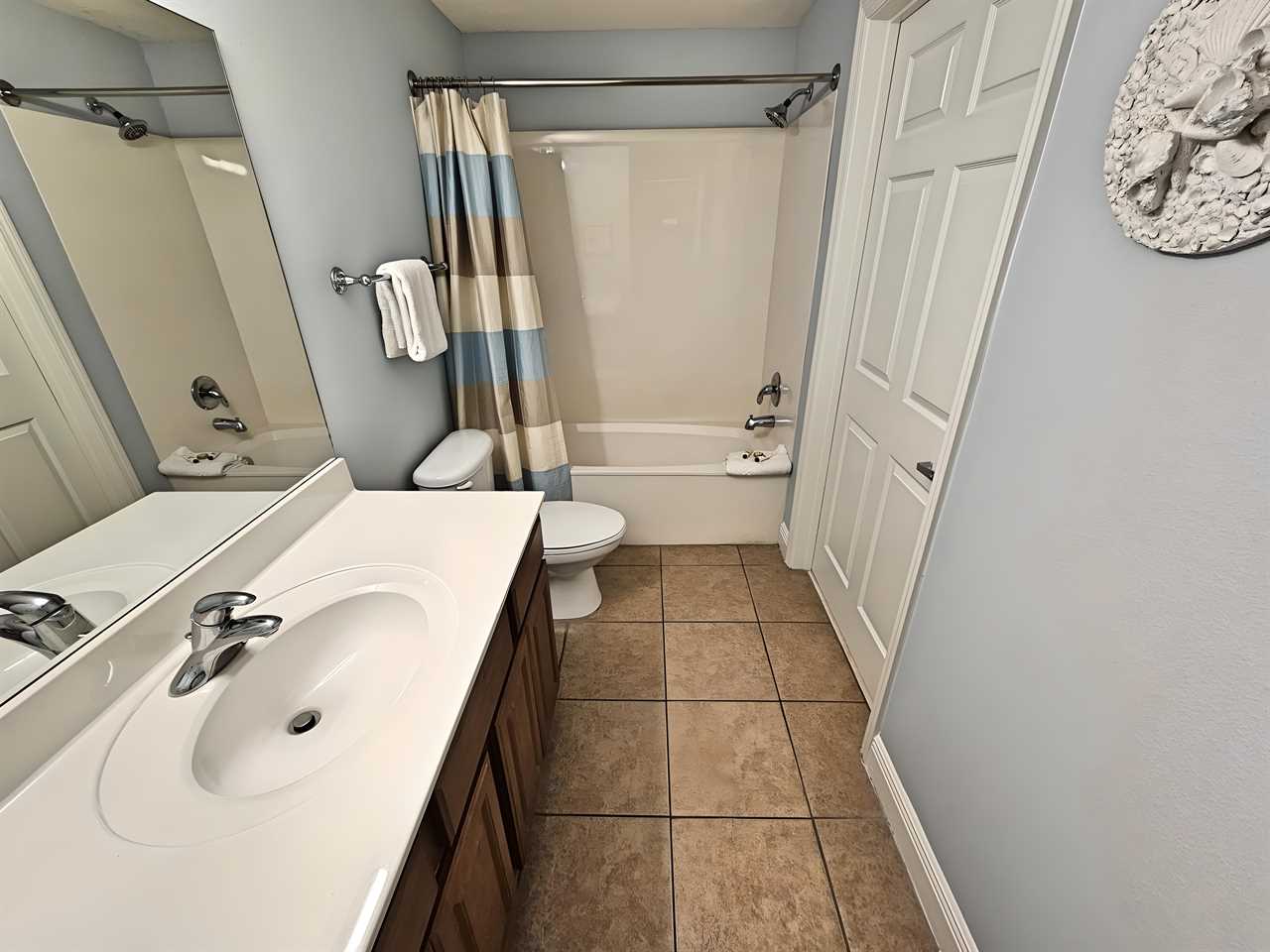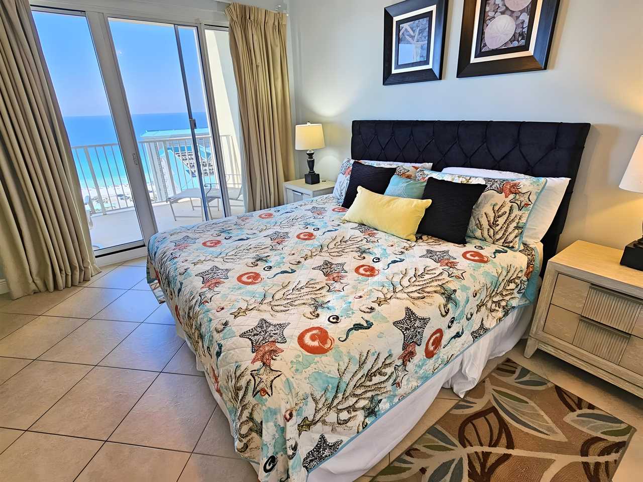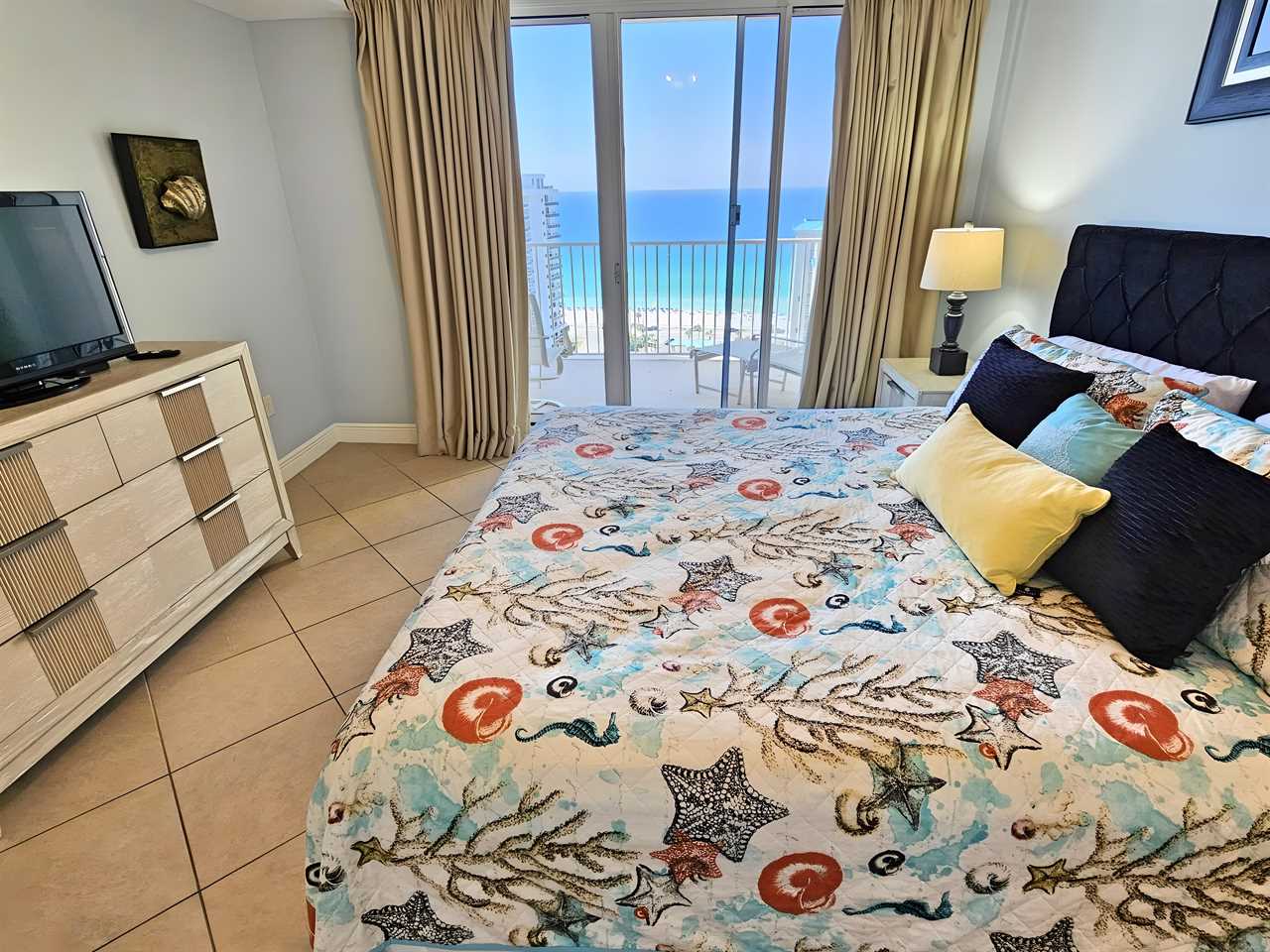 The master bedroom includes a premium extra thick pillow top king size bed with dresser and night stands, TV/DVD player, clock radio and closet. This room includes a private bathroom with separate shower and tub as well as a double vanity so there is plenty of room to spread out. The view from the bedroom is stunning as you look out over the beach and the beautiful Gulf of Mexico. There is also access to the oversized balcony from the master bedroom.