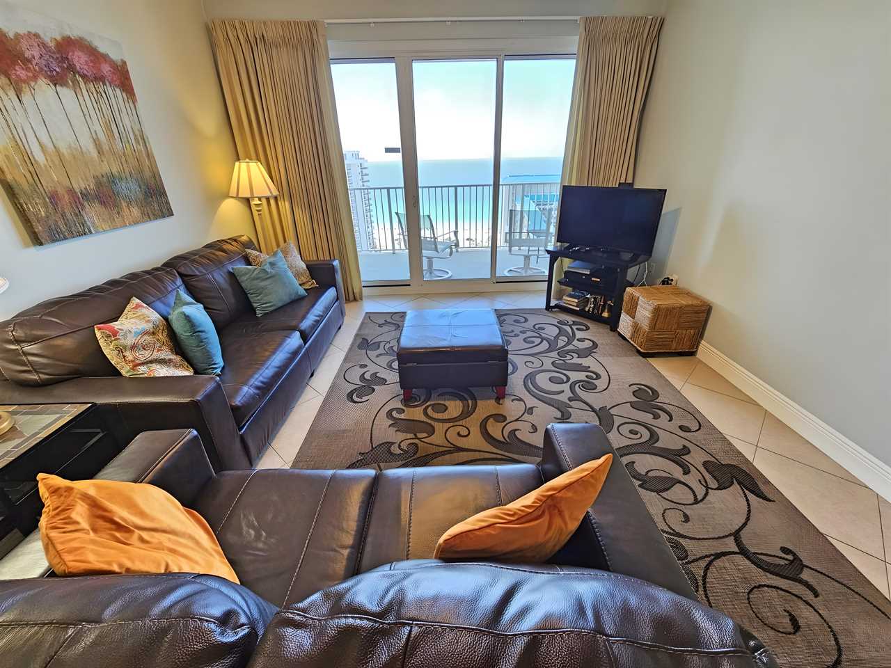 The living room features a new leather sleeper/sofa, a pair of super comfy recliners, a large flat screen LCD HDTV with DVD player. A floor to ceiling sliding glass door opens from the living room to the oversized patio and offers breathtaking views of the Gulf of Mexico.