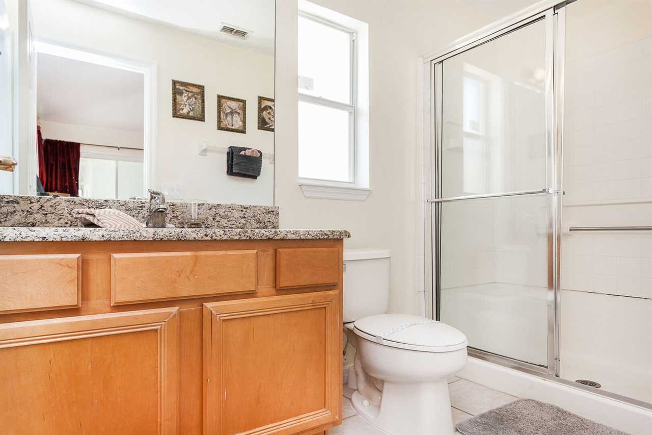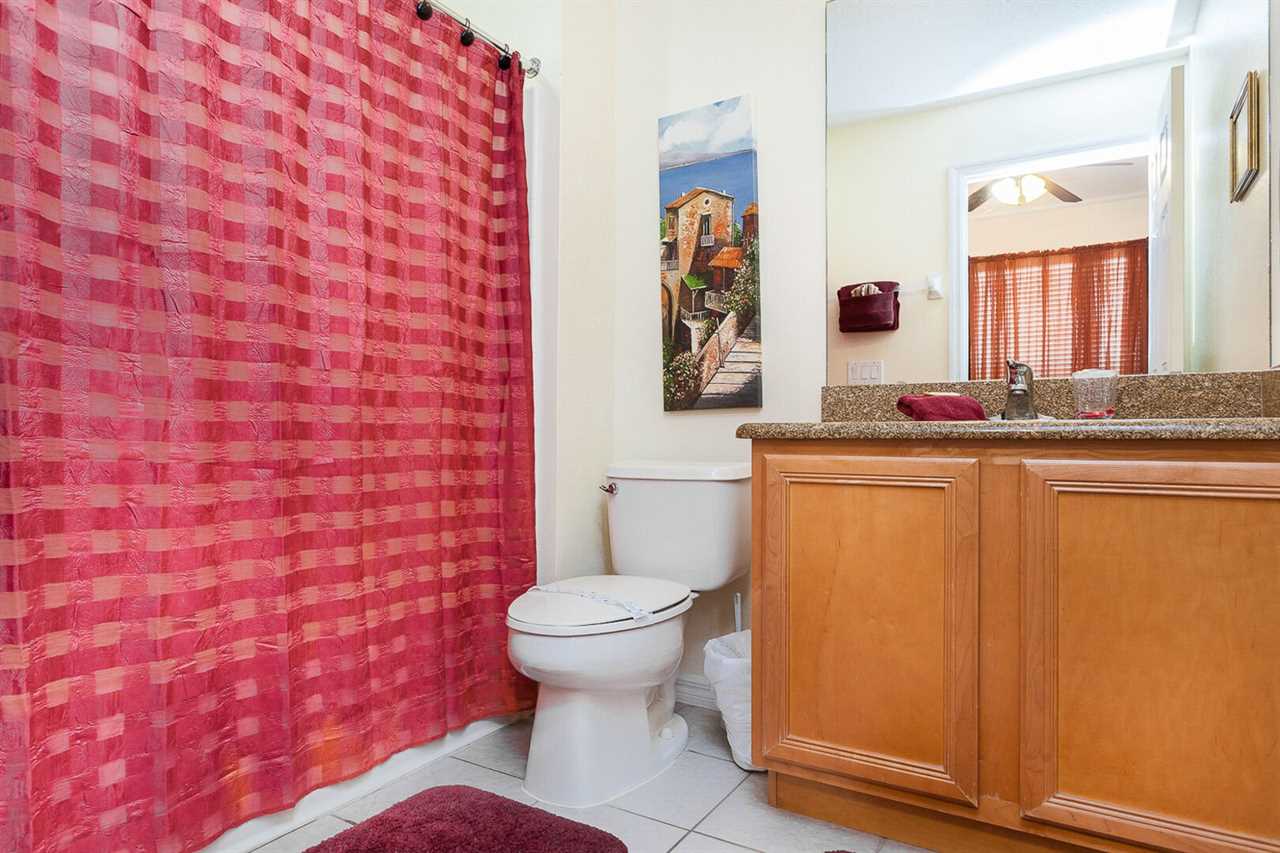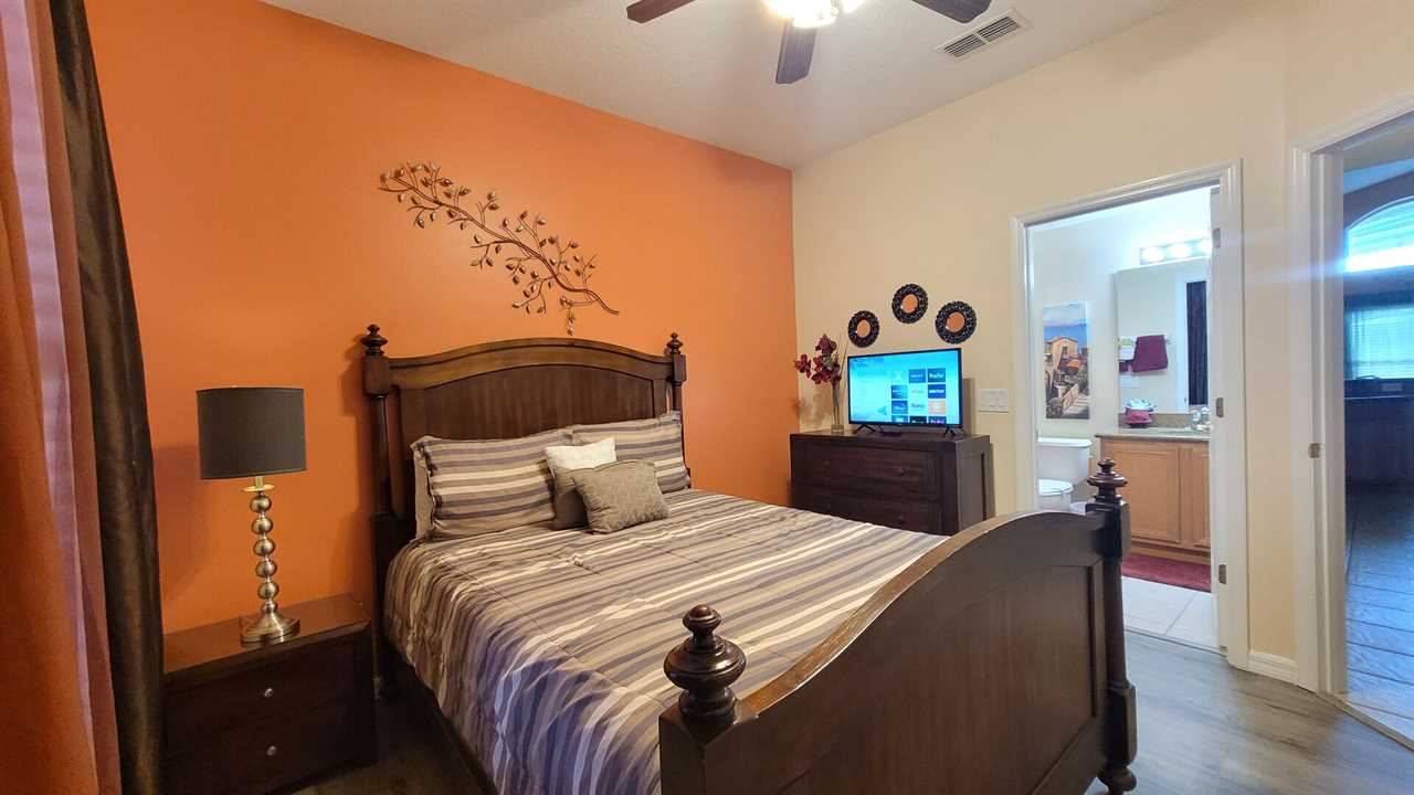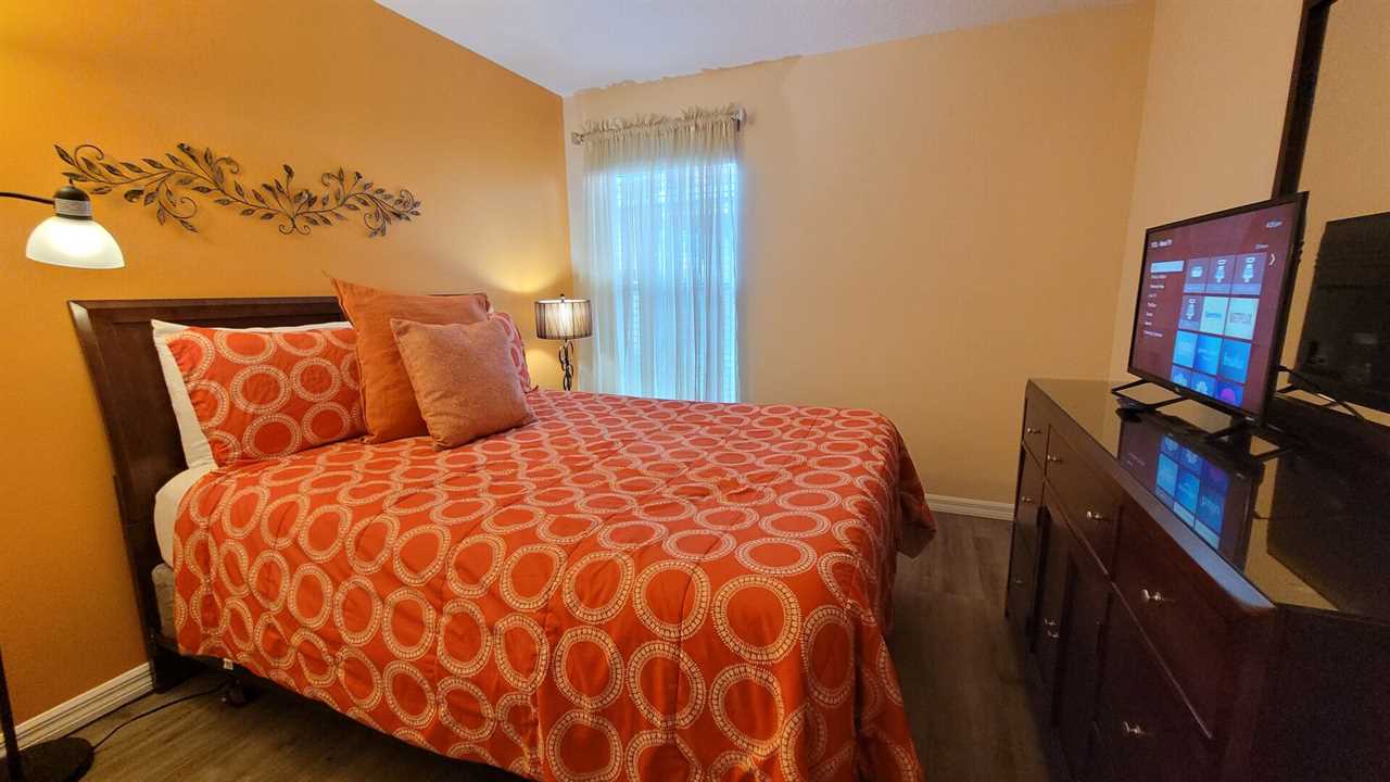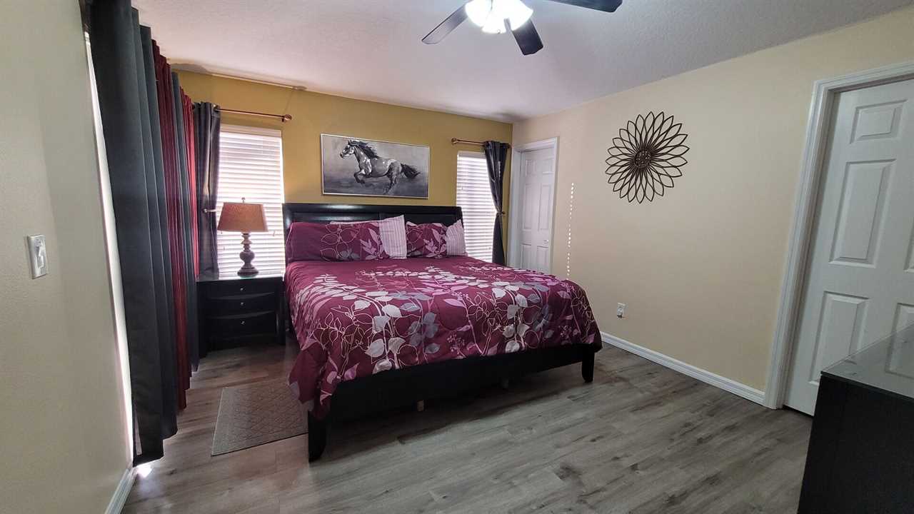 The Master Bedroom has a King Bed, 32” Flat screen TV with cable, a ceiling fan, lamp, dresser, mirror and night stand. It also opens onto the pool via a sliding glass door. All bedrooms are carpeted.
