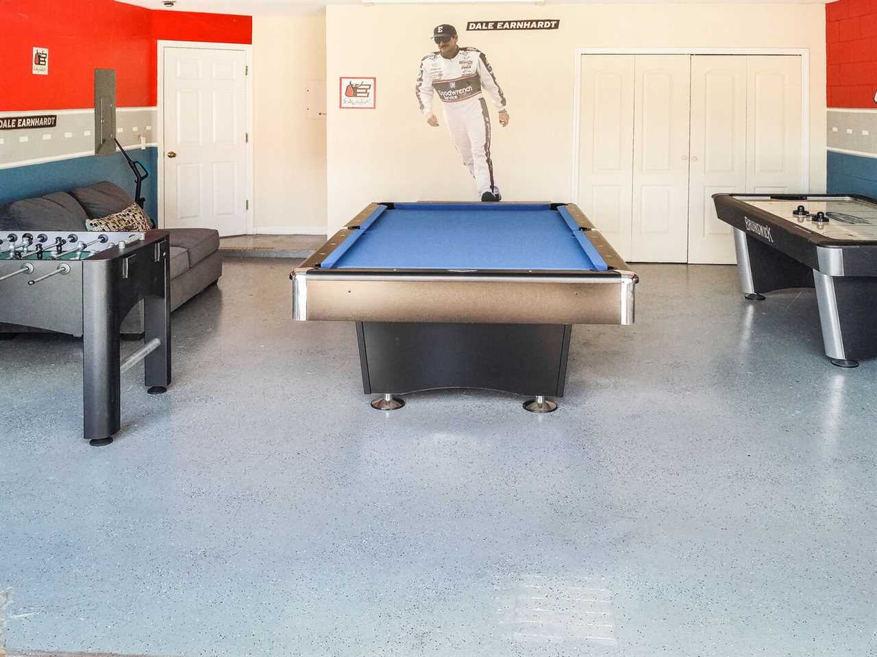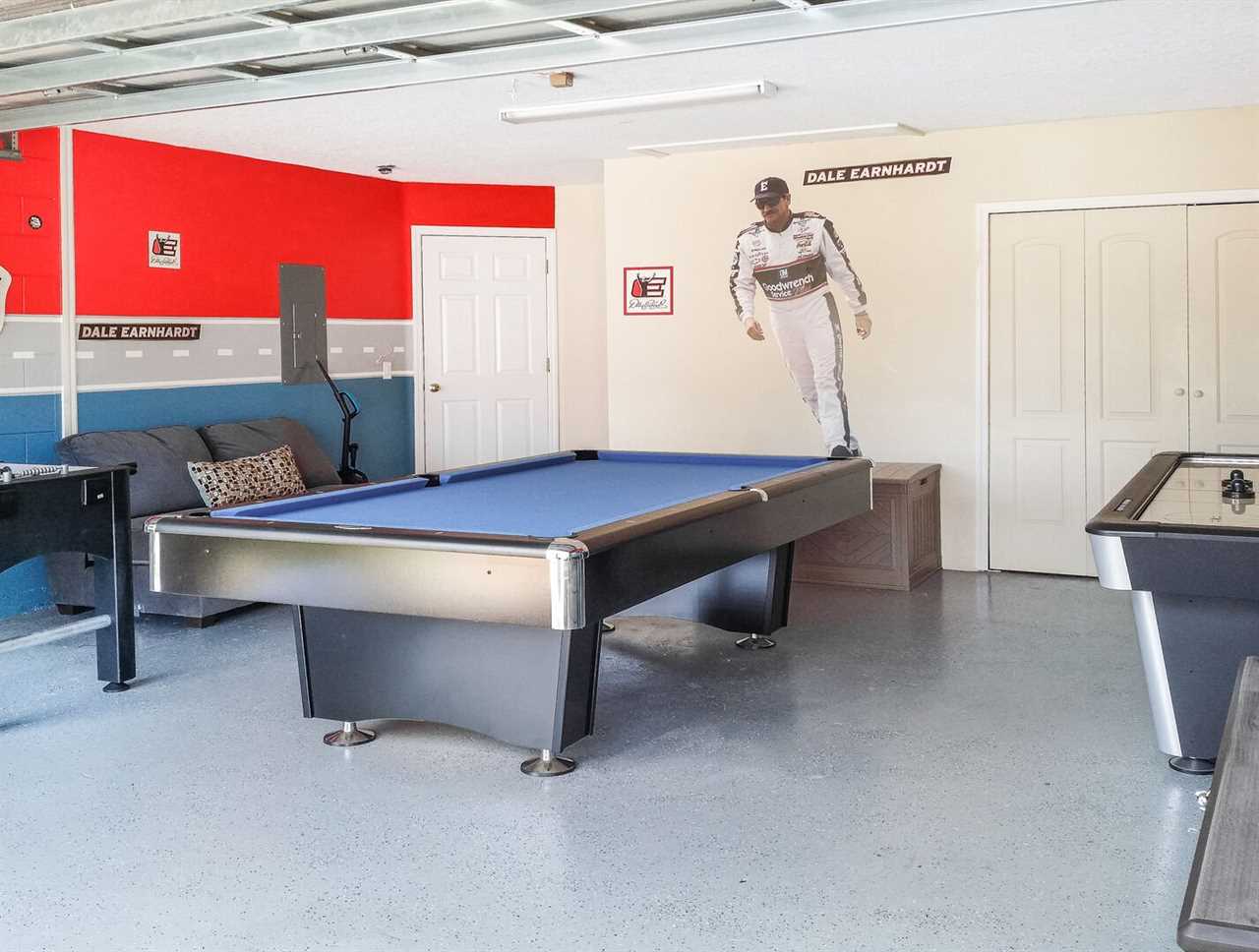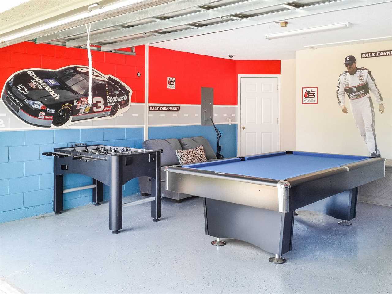 The pool fence is up at all times for the benefit and safety of our guests. The garage has been converted into a Nascar Themed games room with foosball, and pool table and air hockey, perfect for long matches and children's entertainment!