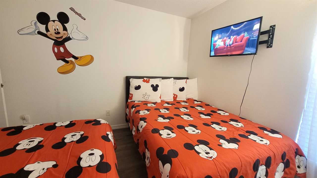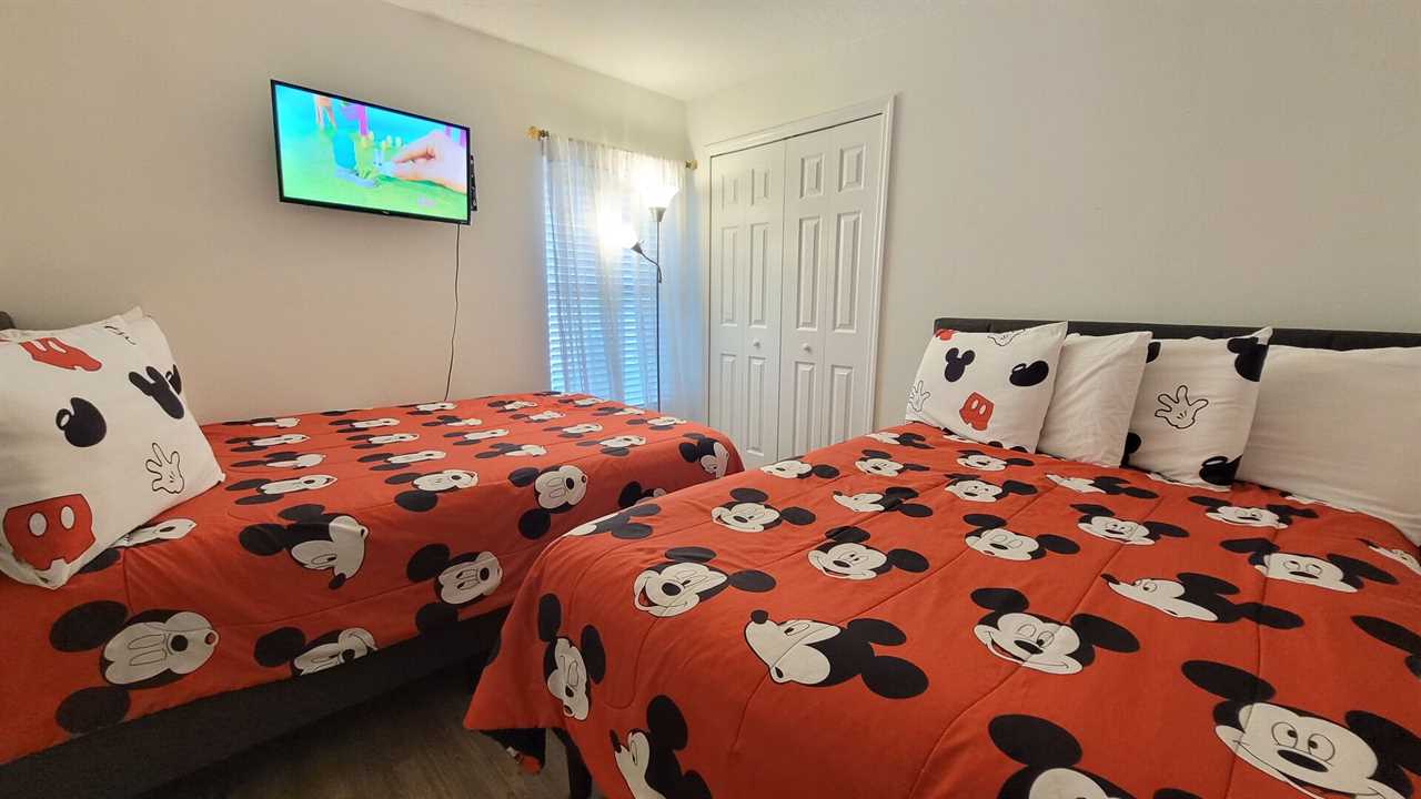 Bedroom #4 has 2 Double (Full) Beds with 22” flat screen TV with cable and a standing lamp.