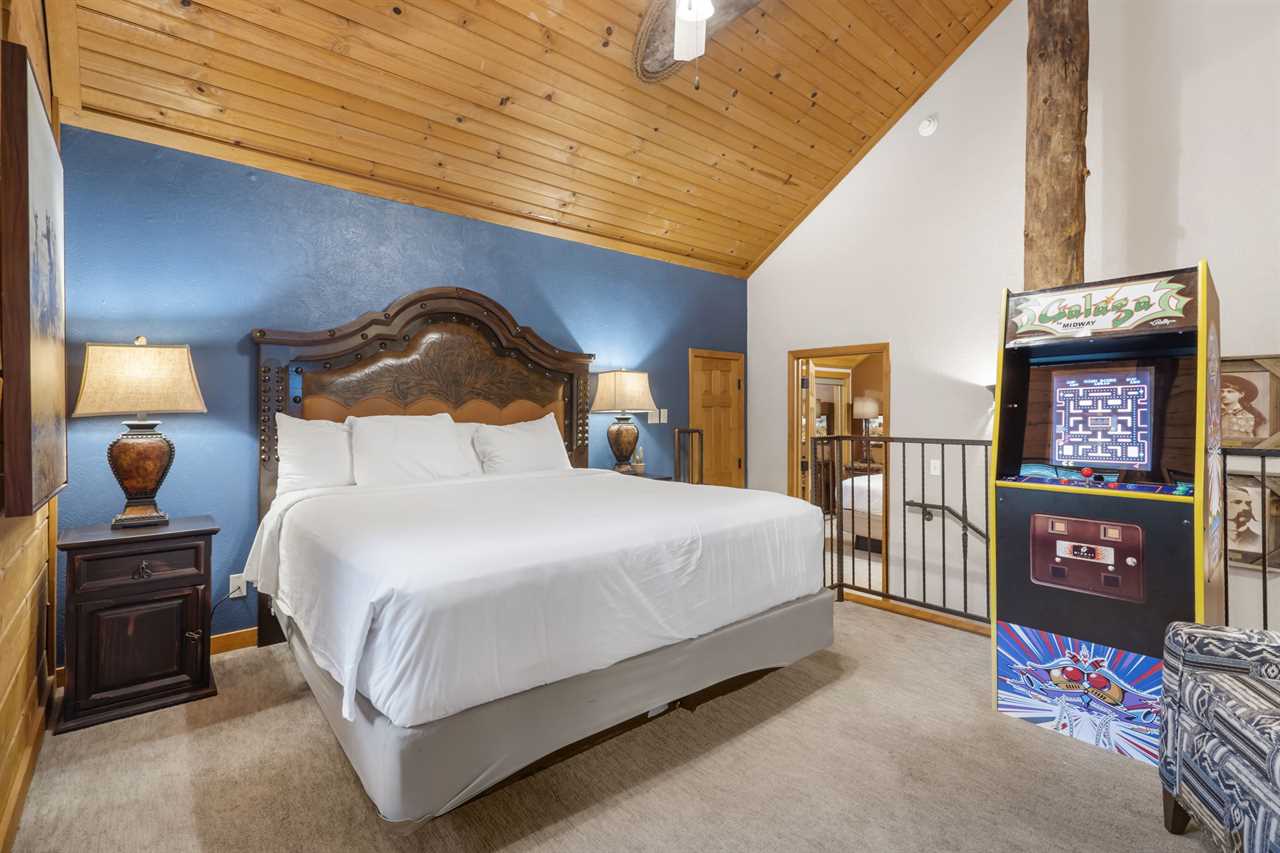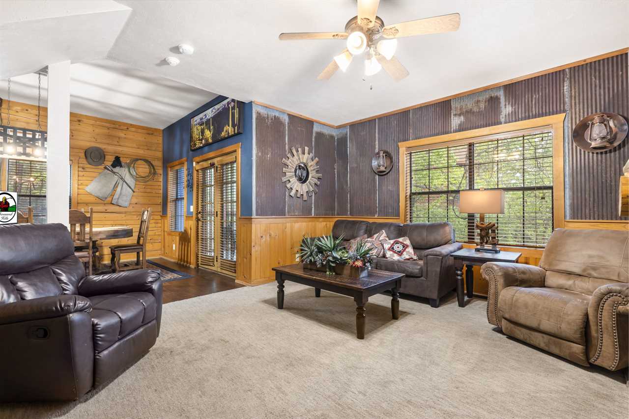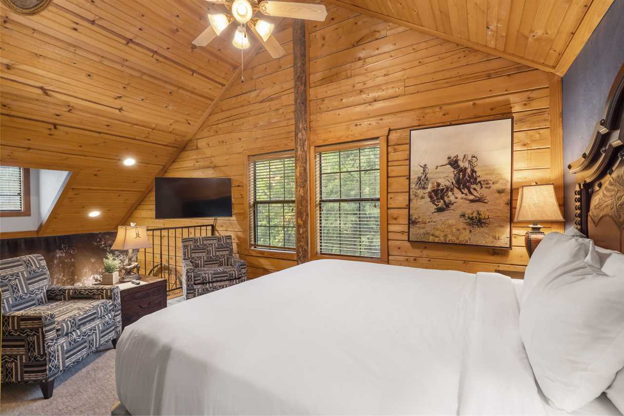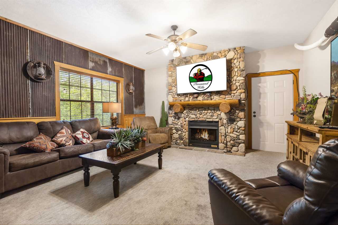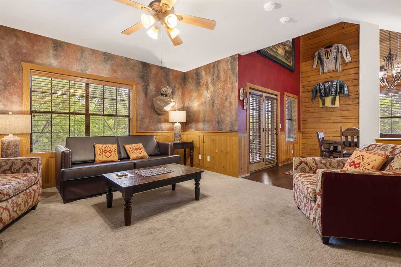 Perfect for two families or large groups traveling together, this walk-in level property features two fully connected lock-off cabins—each with its own distinct theme honoring Ozarkian heritage. One celebrates Native American art, the other captures the charm of the Old West. With plenty of space, privacy, and upscale amenities throughout, you'll enjoy an unforgettable stay in the heart of Branson—just minutes from top shows, restaurants, and golf.