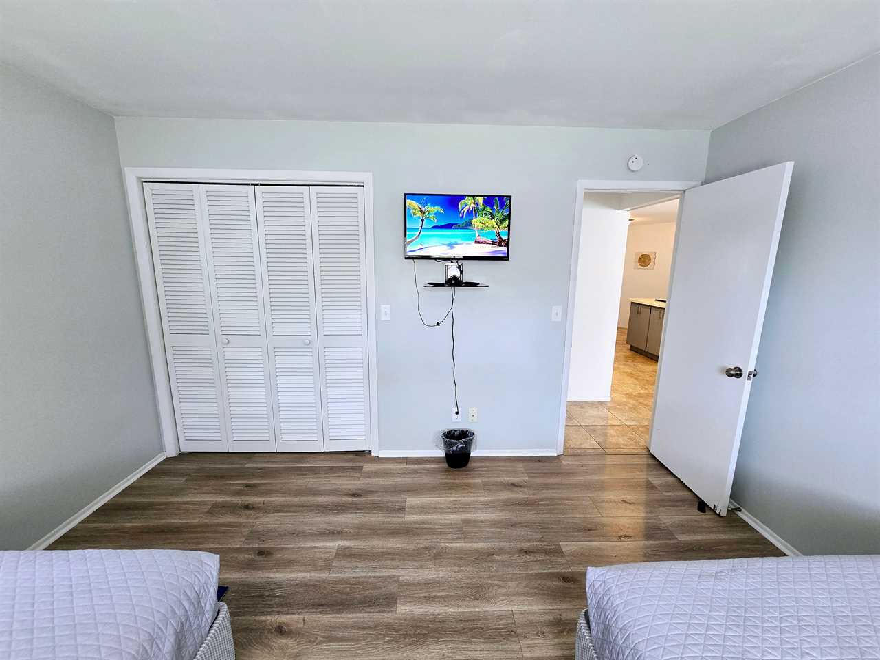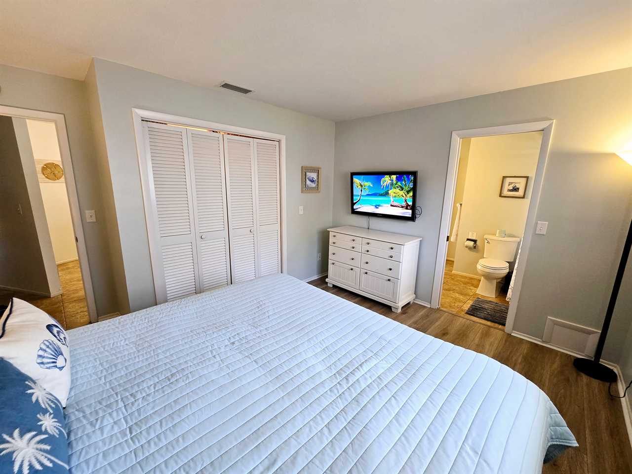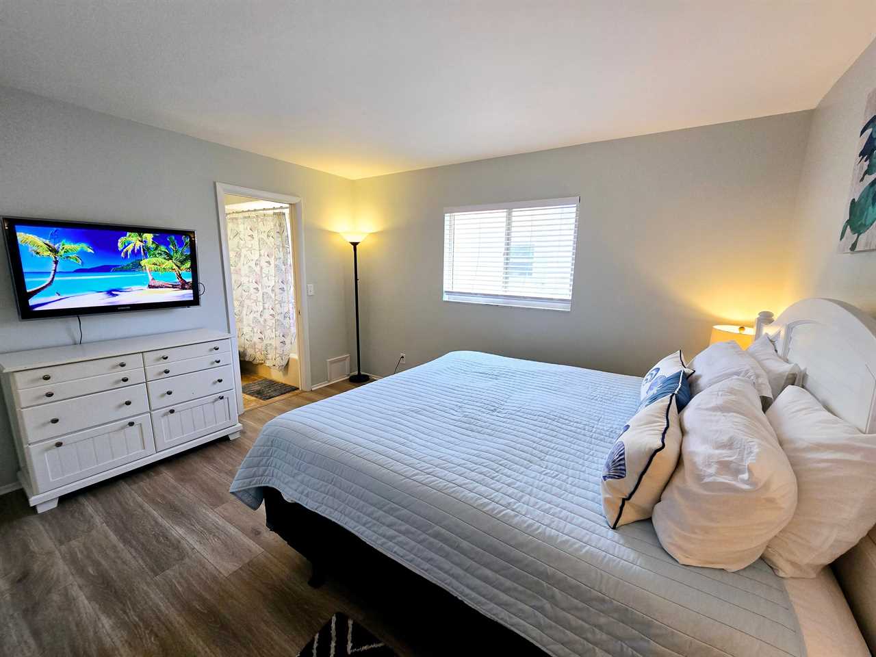 Bedroom 2: Queen Bed, TV, Shared Bathroom