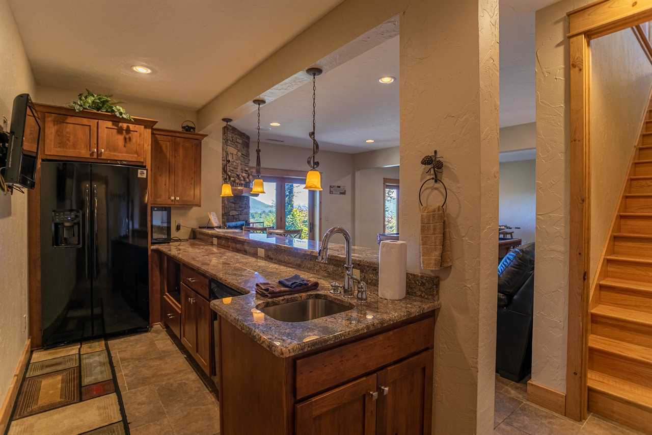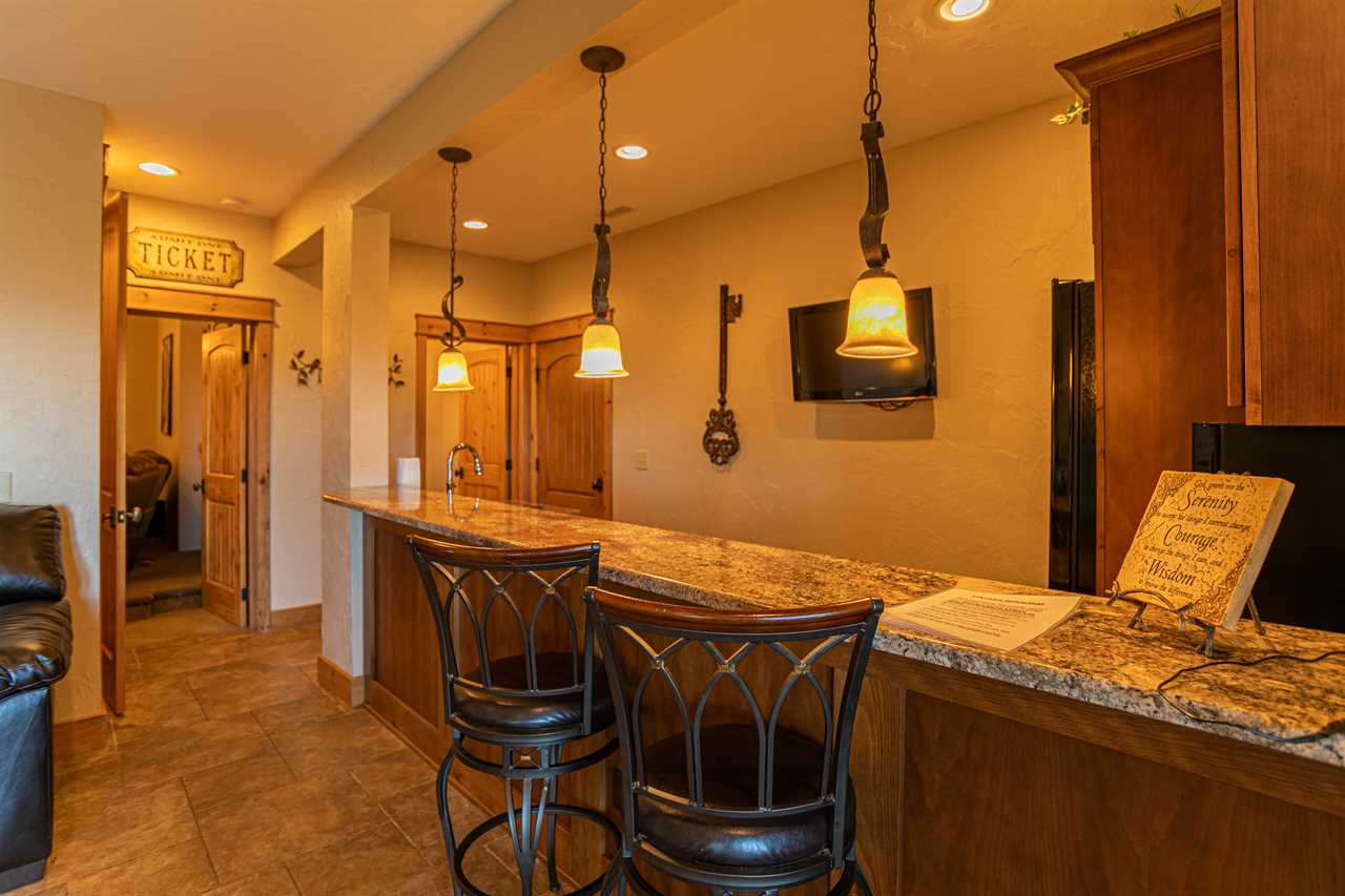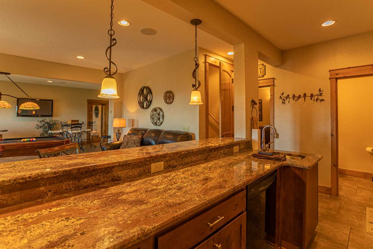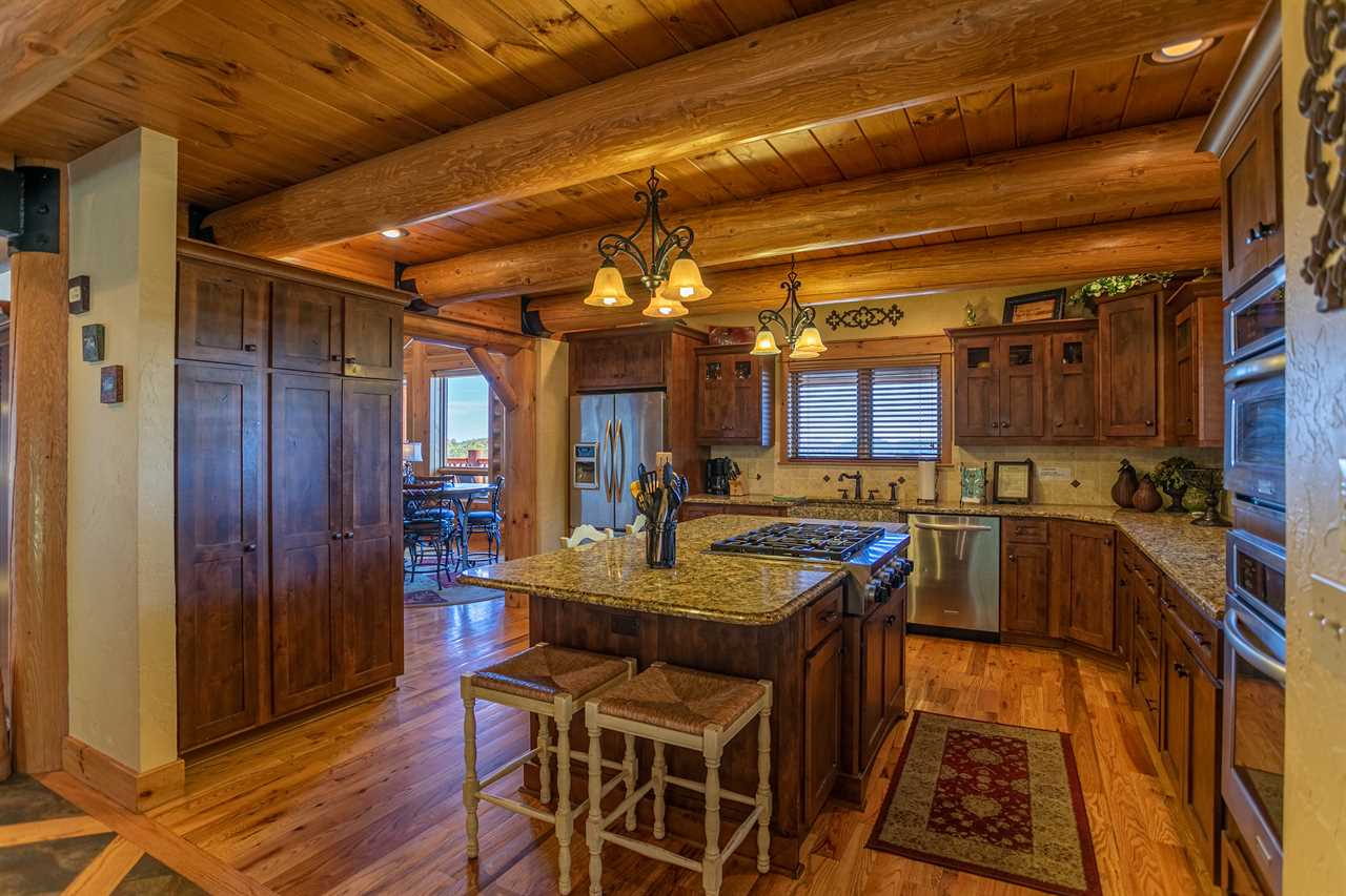 The spacious, fully-equipped kitchen at the west end of the home boasts a large island with a 6-burner gas cooktop and beautiful granite countertops, plenty of additional granite counter space, drip style coffeemaker, an abundance of cabinets - all custom built, and stainless steel appliances - with great views of the surrounding mountain ranges. Adjacent to the kitchen is a large dining area with convenient access to the huge covered patio which is perfect for outdoor dining rain or shine.