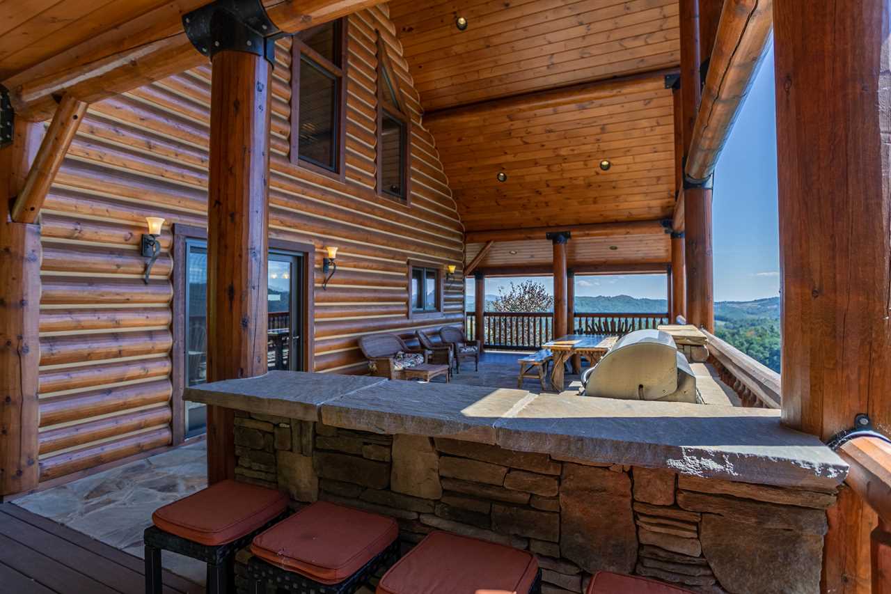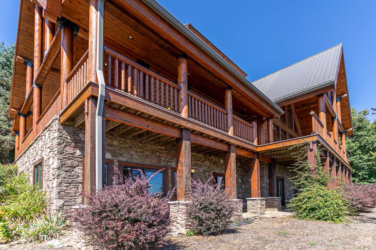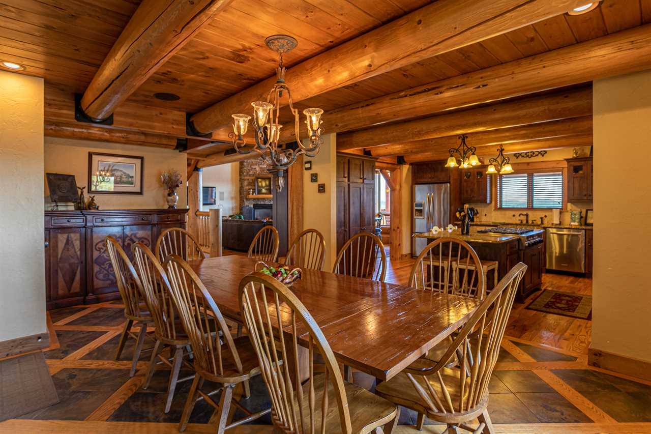 The main level of this magnificent custom-built log home is accessed via a few steps onto one of the two covered decks at the rear of the home. There is one covered deck off of the laundry room and one 900 square foot covered deck off of the kitchen and dining area. This deck features a slate floor with a cathedral ceiling rising to a 25-foot high peak. The covered deck also wraps around the entire front of the home with full panoramic mountain views.