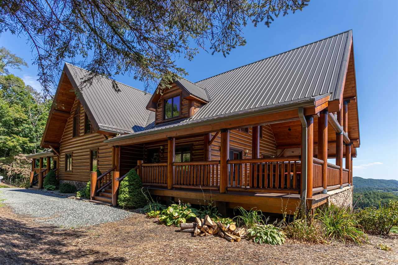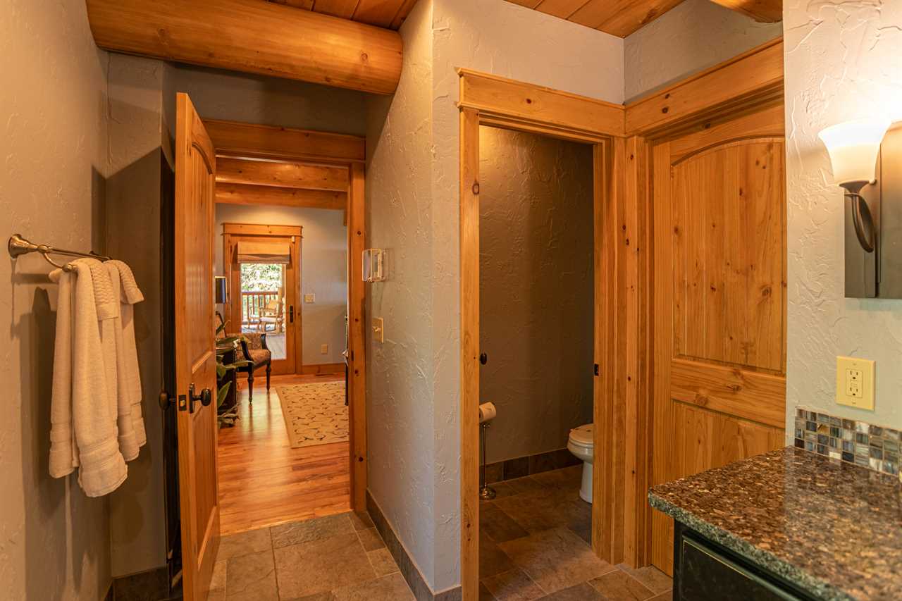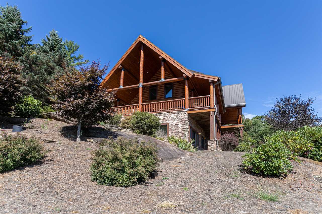 The main level of this magnificent custom-built log home is accessed via a few steps onto one of the two covered decks at the rear of the home. There is one covered deck off of the laundry room and one 900 square foot covered deck off of the kitchen and dining area. This deck features a slate floor with a cathedral ceiling rising to a 25-foot high peak. The covered deck also wraps around the entire front of the home with full panoramic mountain views.