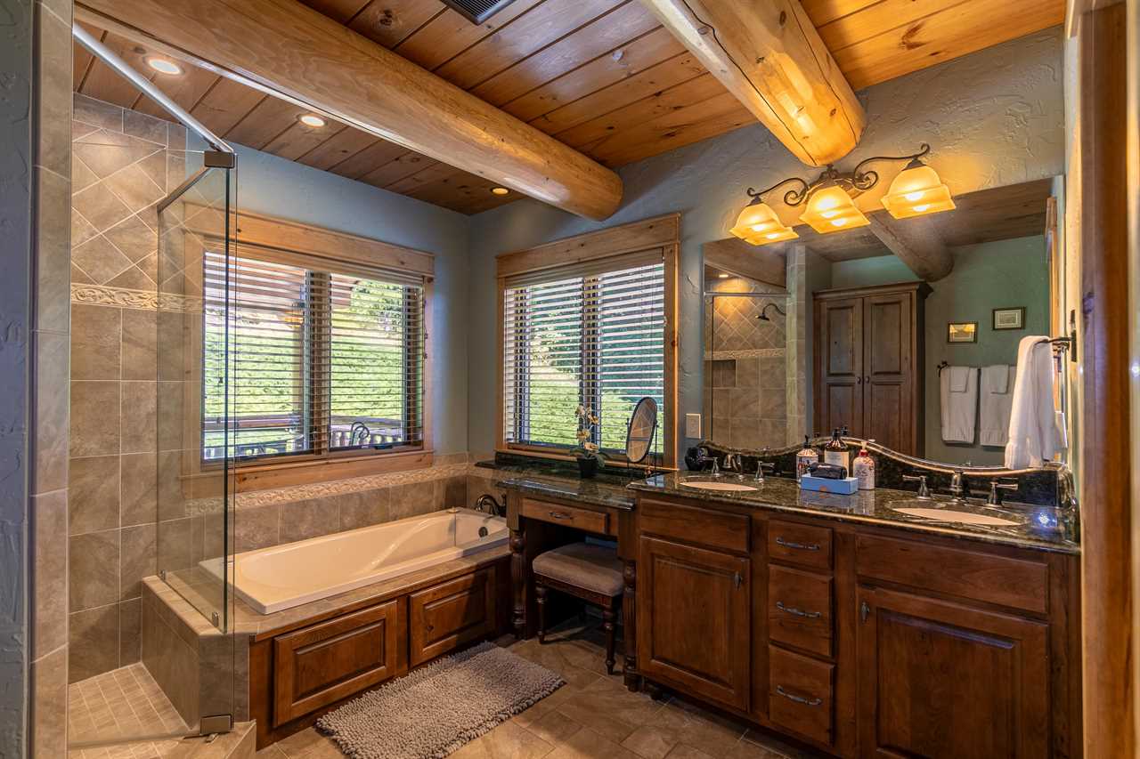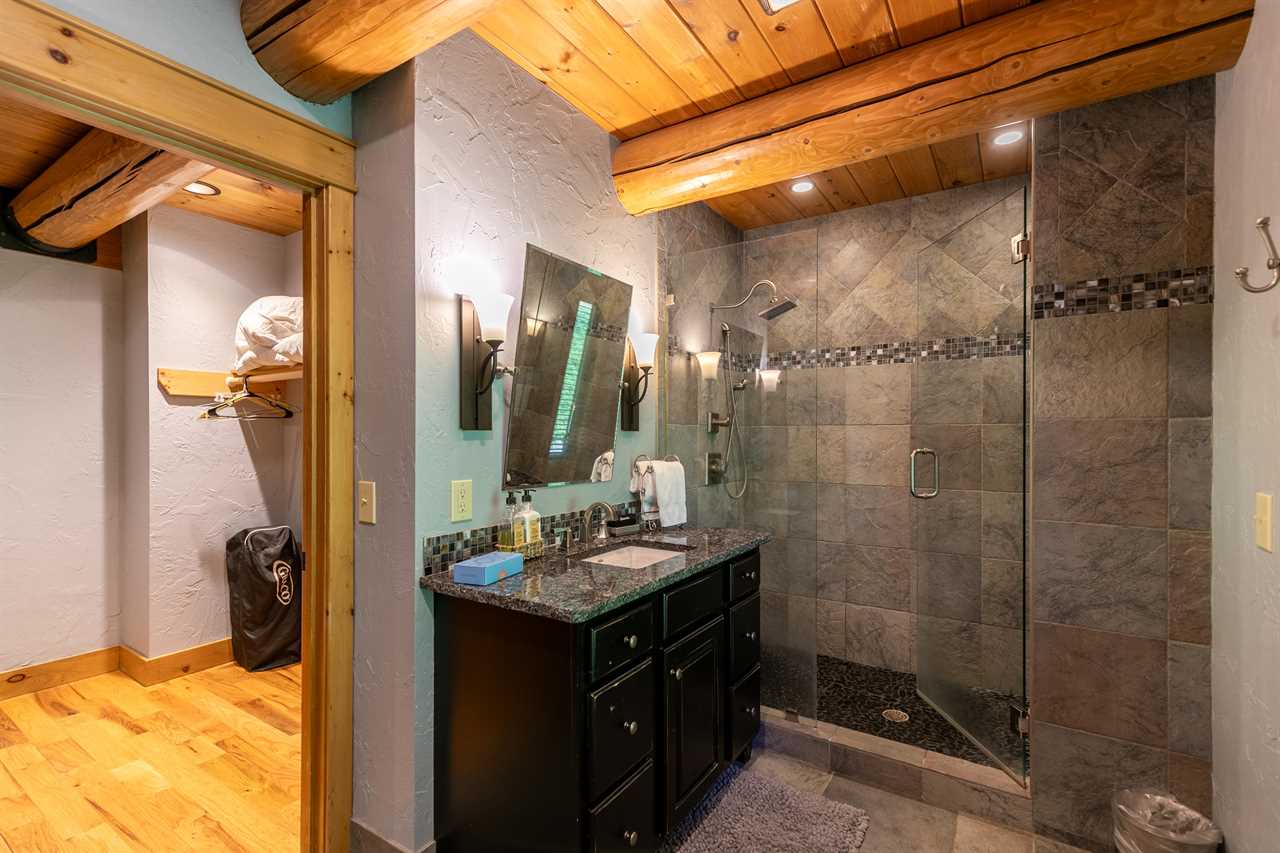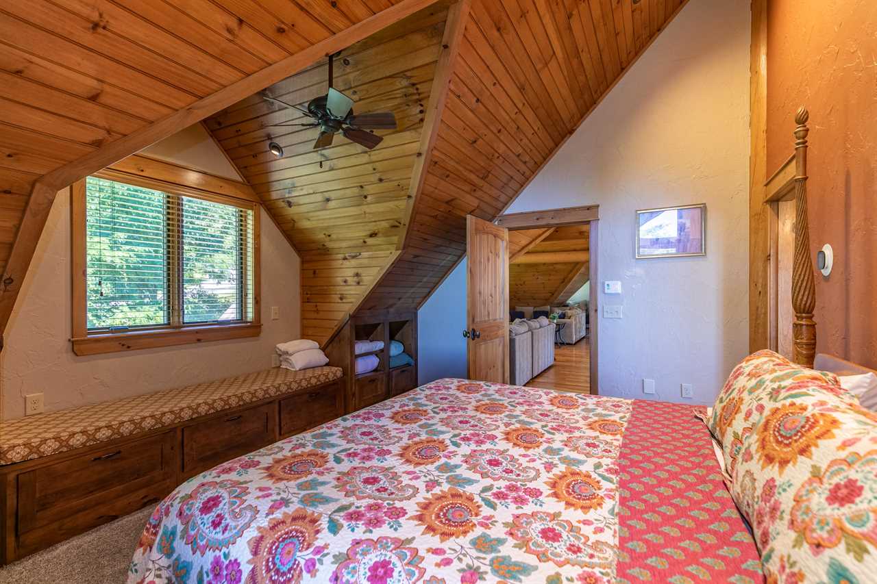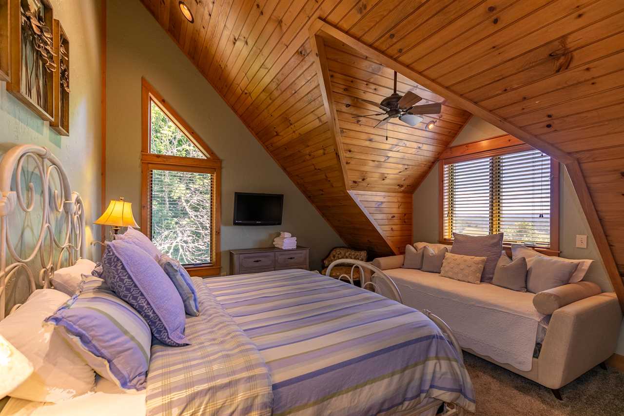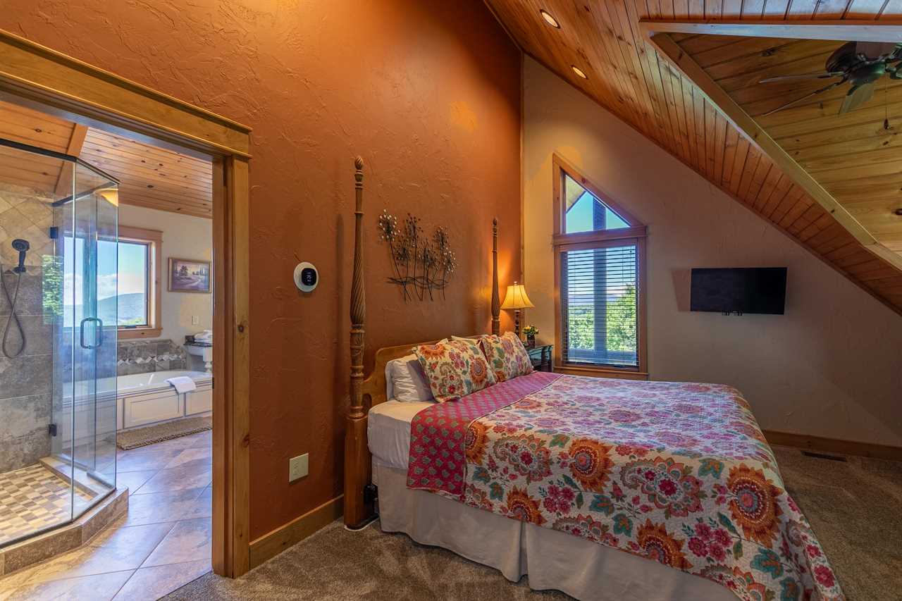 Upstairs is a large loft with two 42-inch TV's and two twin sleeper chairs, a sitting area in the center overlooking the living room and a card game table; a room with 2 twin beds with twin trundles and 32-inch TV, a bedroom with king bed, 32-inch TV and great mountain views, a full bathroom with tub/shower combo on the east end; and a spacious master suite with king bed and a daybed, 32-inch TV, 15-foot high vaulted ceiling, and a luxurious bathroom with large jetted tub, separate tiled shower with body sprayer, heated tile floors and wonderful mountain views on the west end.