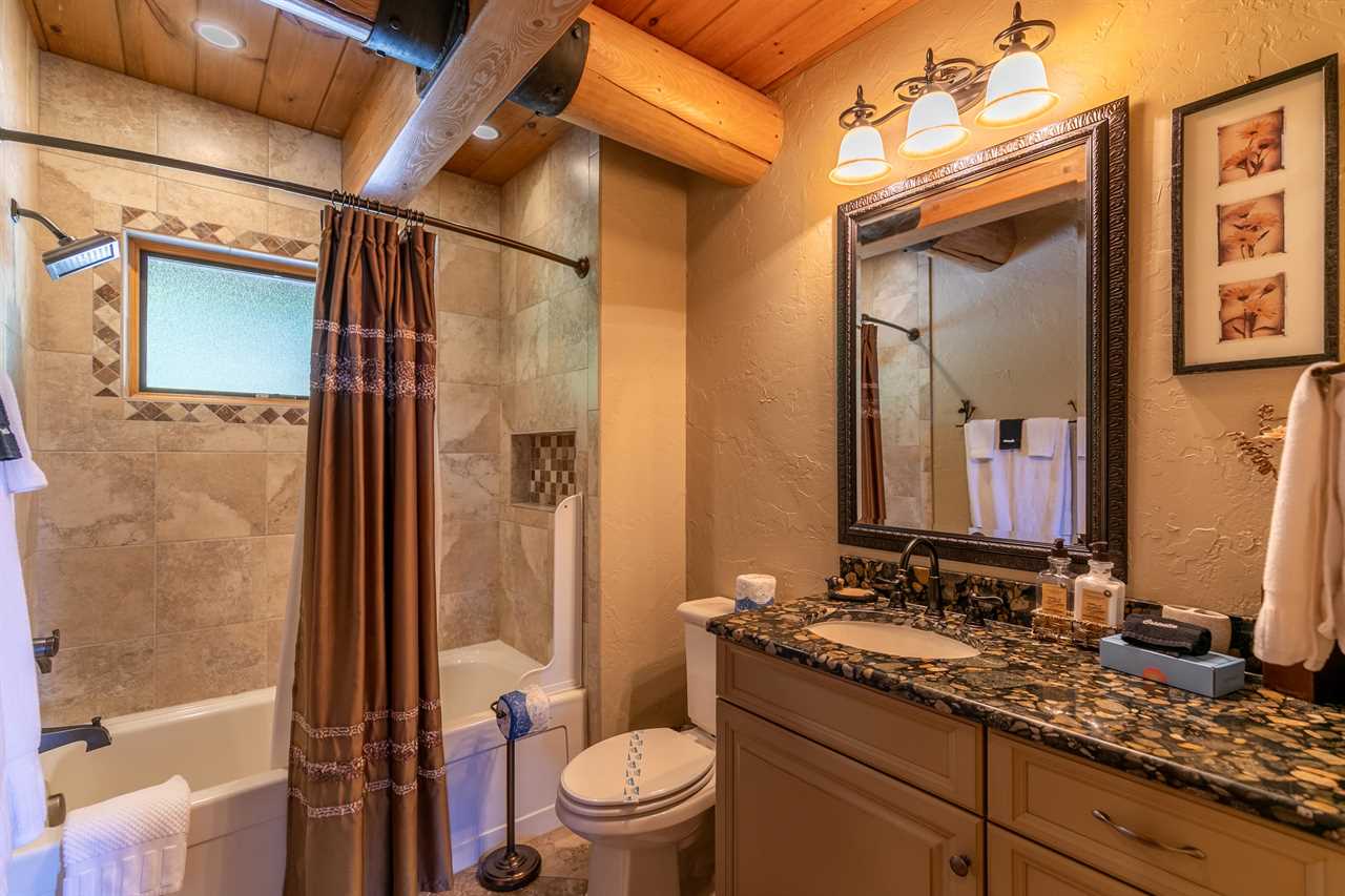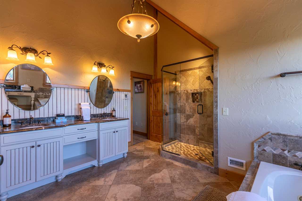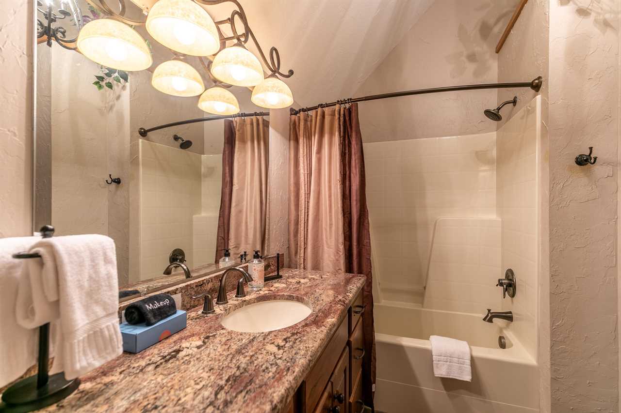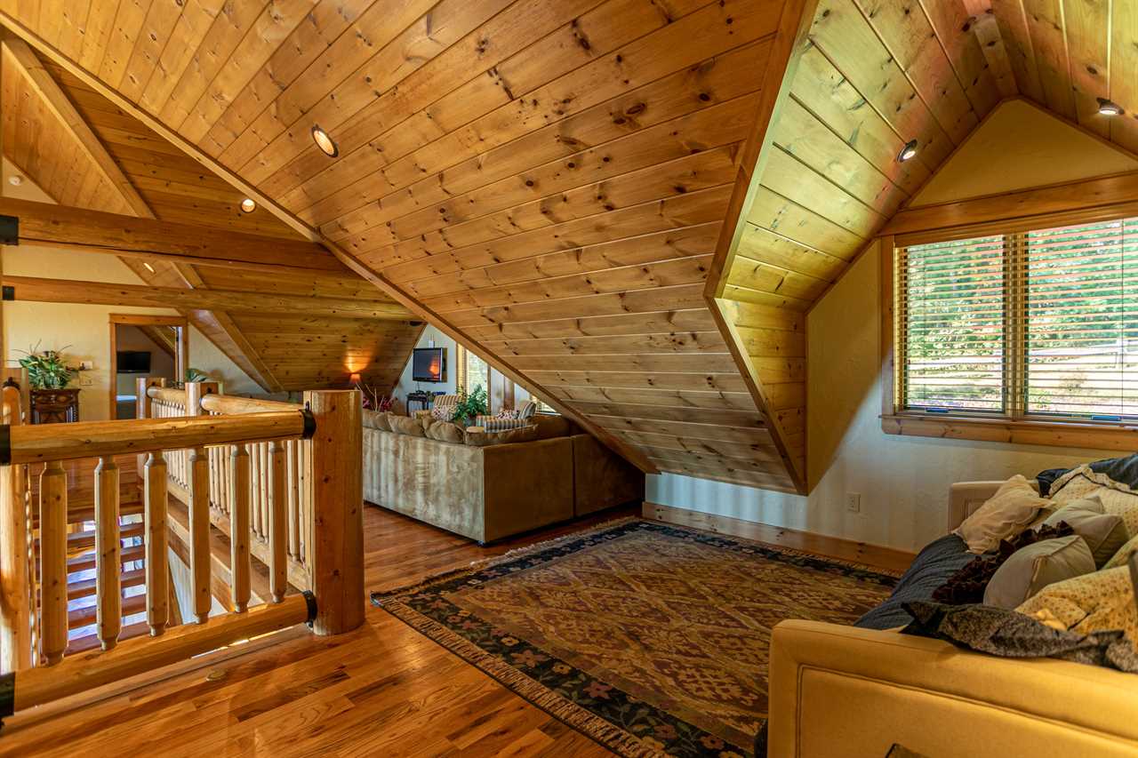 Upstairs is a large loft with two 42-inch TV's and two twin sleeper chairs, a sitting area in the center overlooking the living room and a card game table; a room with 2 twin beds with twin trundles and 32-inch TV, a bedroom with king bed, 32-inch TV and great mountain views, a full bathroom with tub/shower combo on the east end; and a spacious master suite with king bed and a daybed, 32-inch TV, 15-foot high vaulted ceiling, and a luxurious bathroom with large jetted tub, separate tiled shower with body sprayer, heated tile floors and wonderful mountain views on the west end.
