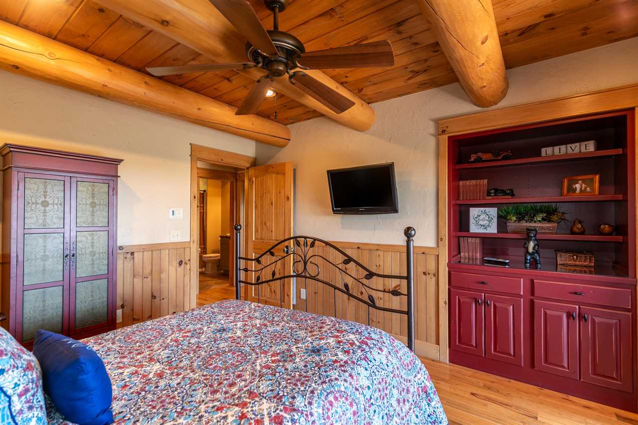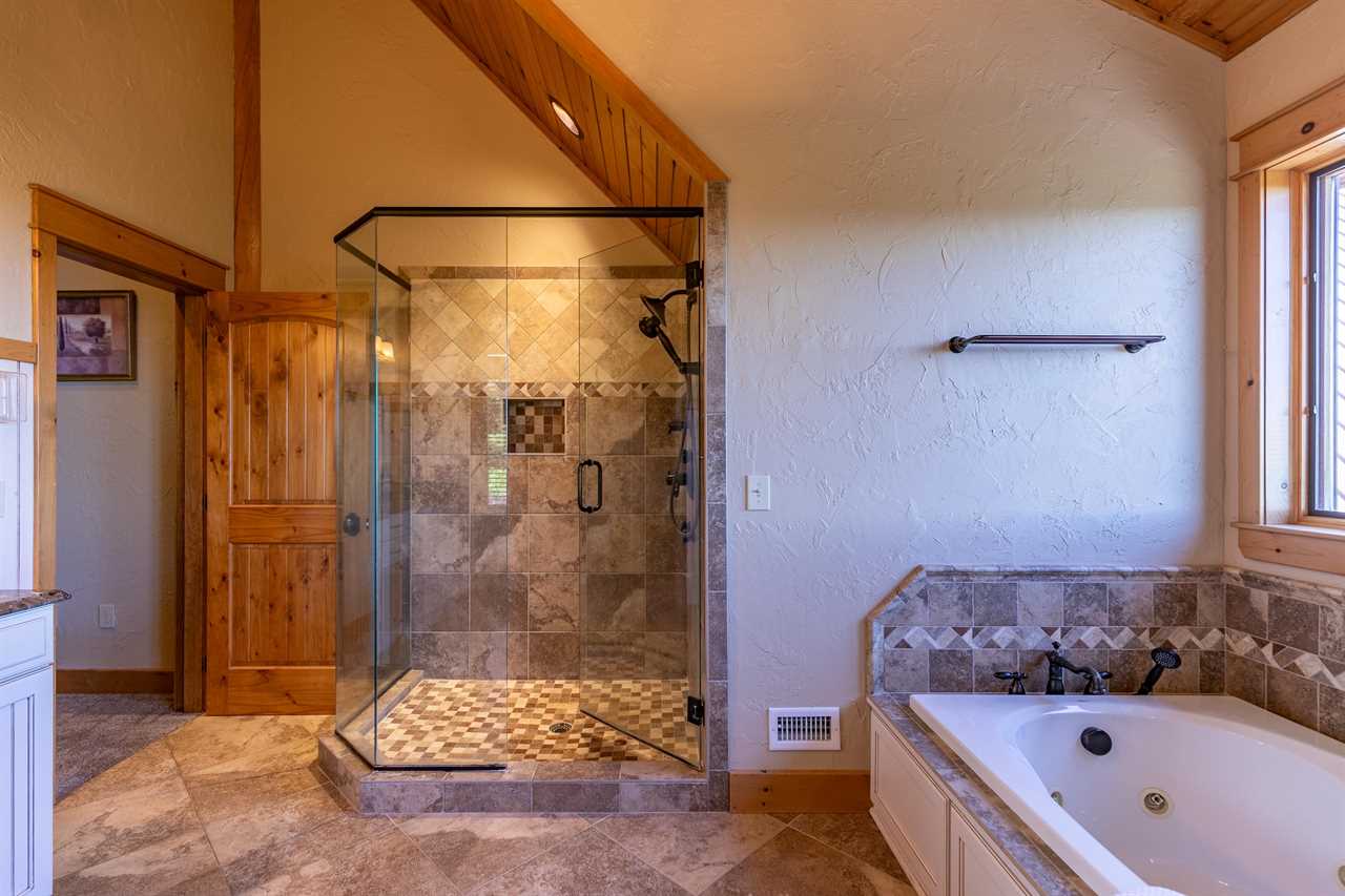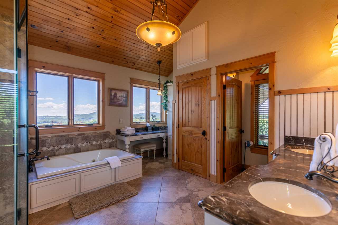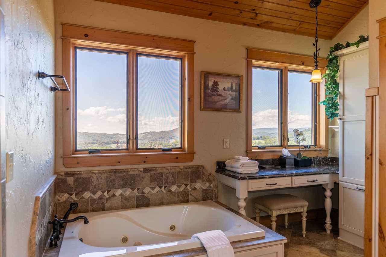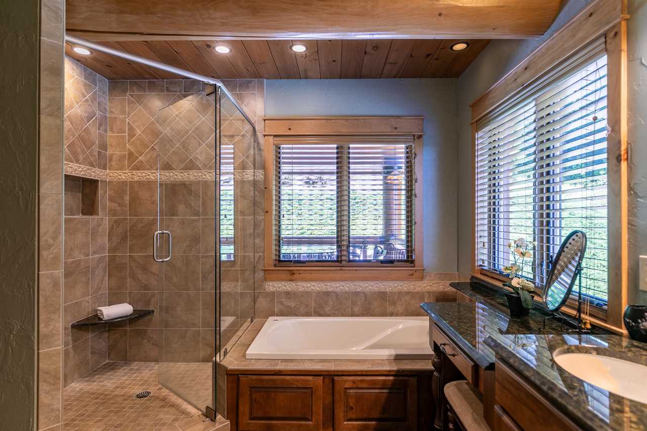Upstairs is a large loft with two 42-inch TV's and two twin sleeper chairs, a sitting area in the center overlooking the living room and a card game table; a room with 2 twin beds with twin trundles and 32-inch TV, a bedroom with king bed, 32-inch TV and great mountain views, a full bathroom with tub/shower combo on the east end; and a spacious master suite with king bed and a daybed, 32-inch TV, 15-foot high vaulted ceiling, and a luxurious bathroom with large jetted tub, separate tiled shower with body sprayer, heated tile floors and wonderful mountain views on the west end.
