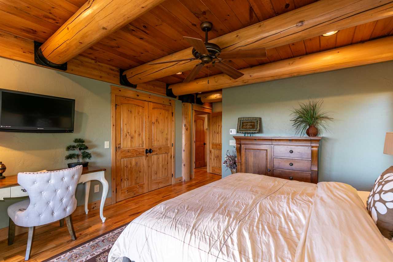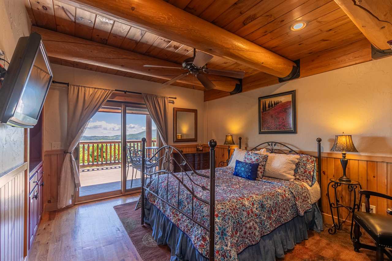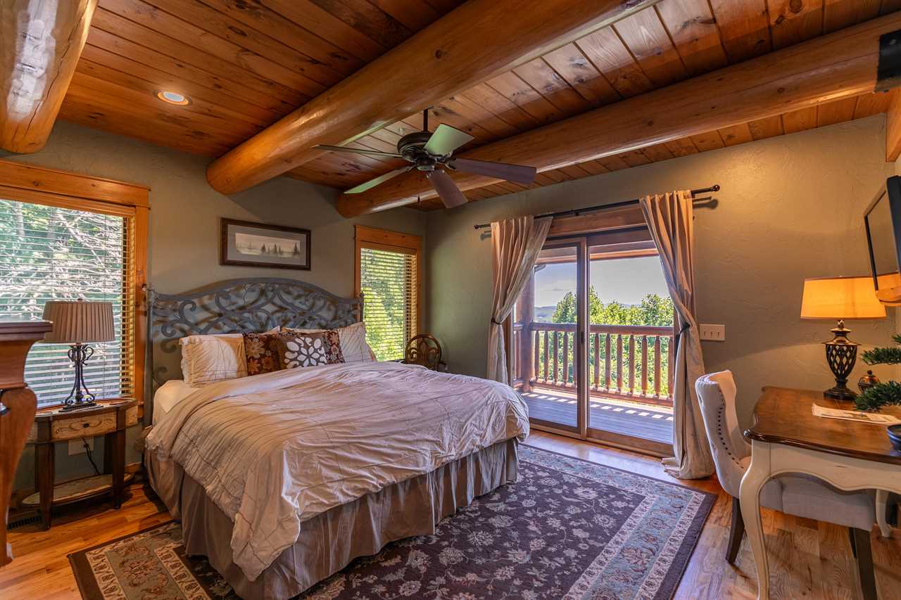 Both the kitchen or dining room open into the great room with 25-foot high cathedral ceiling with windows from floor to peak facing the wonderful panoramic mountain views. This room features a 18-inch diameter post and beam architecture, a large stone gas-log fireplace, leather sofas, and a 50-inch plasma TV.