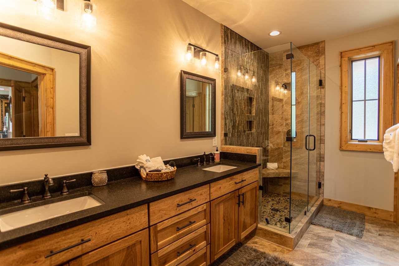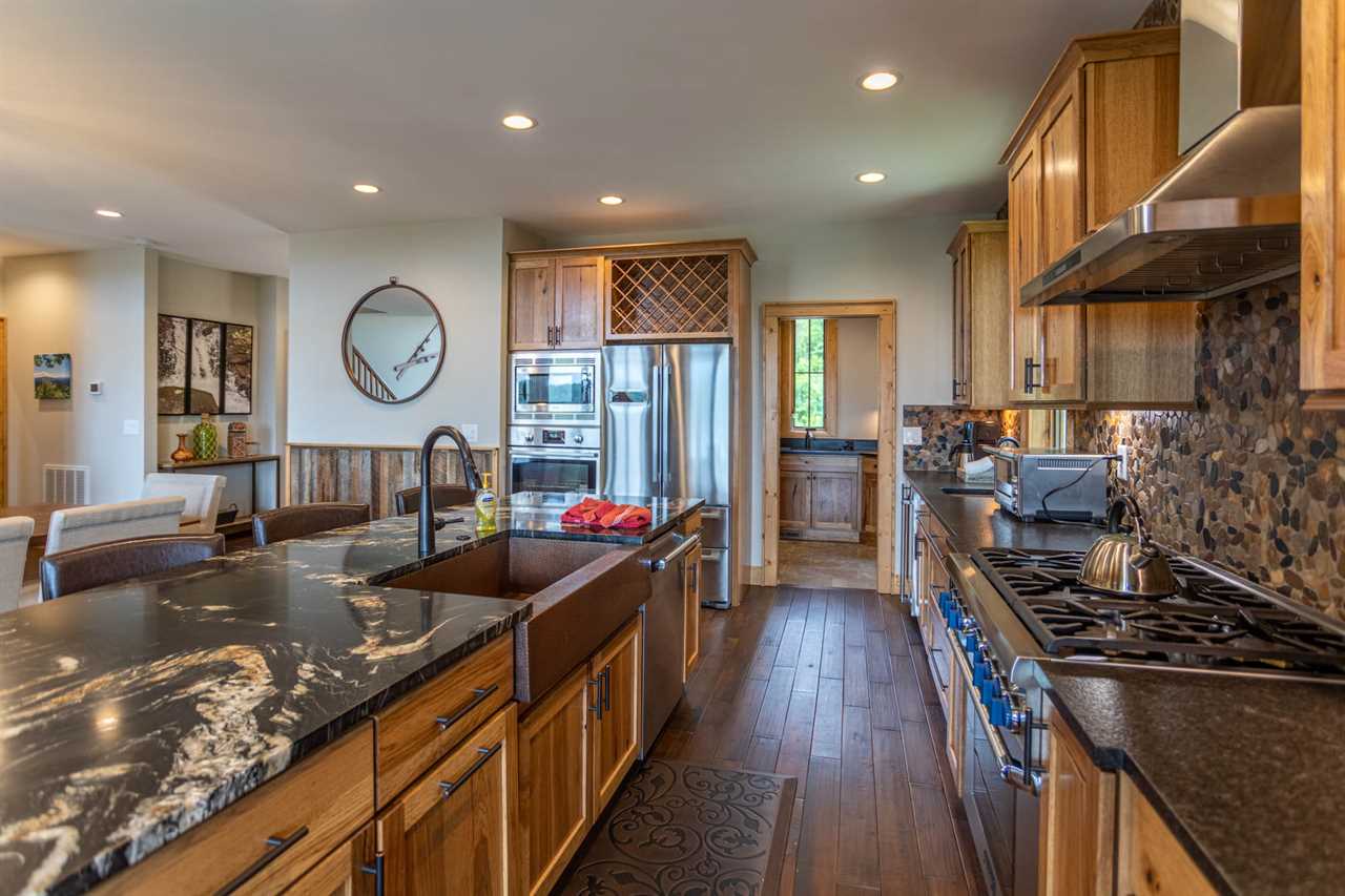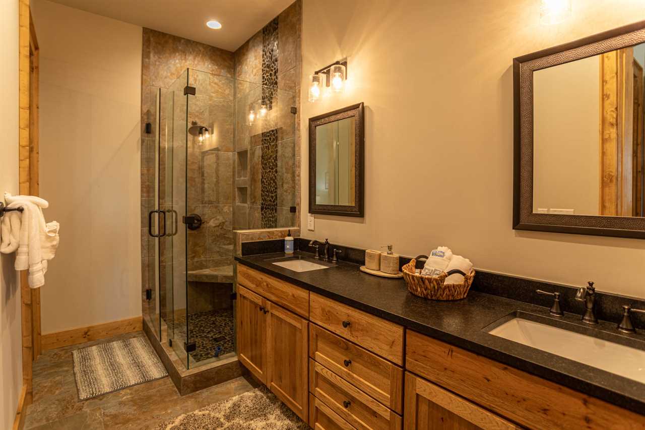 The open living room features majestic views, exceptional furnishings, a gas log fireplace, and a TV where friends and family can gather. The main floor has one Master King suite with deck access and its own TV. The ensuite bathroom has double vanities, and a custom tiled shower with a river rock bottom. There is a main level laundry room off of the kitchen and entryway with its own workspace and sink. The home has features artwork and photography that is locally sourced, showcasing the beauty of the area.