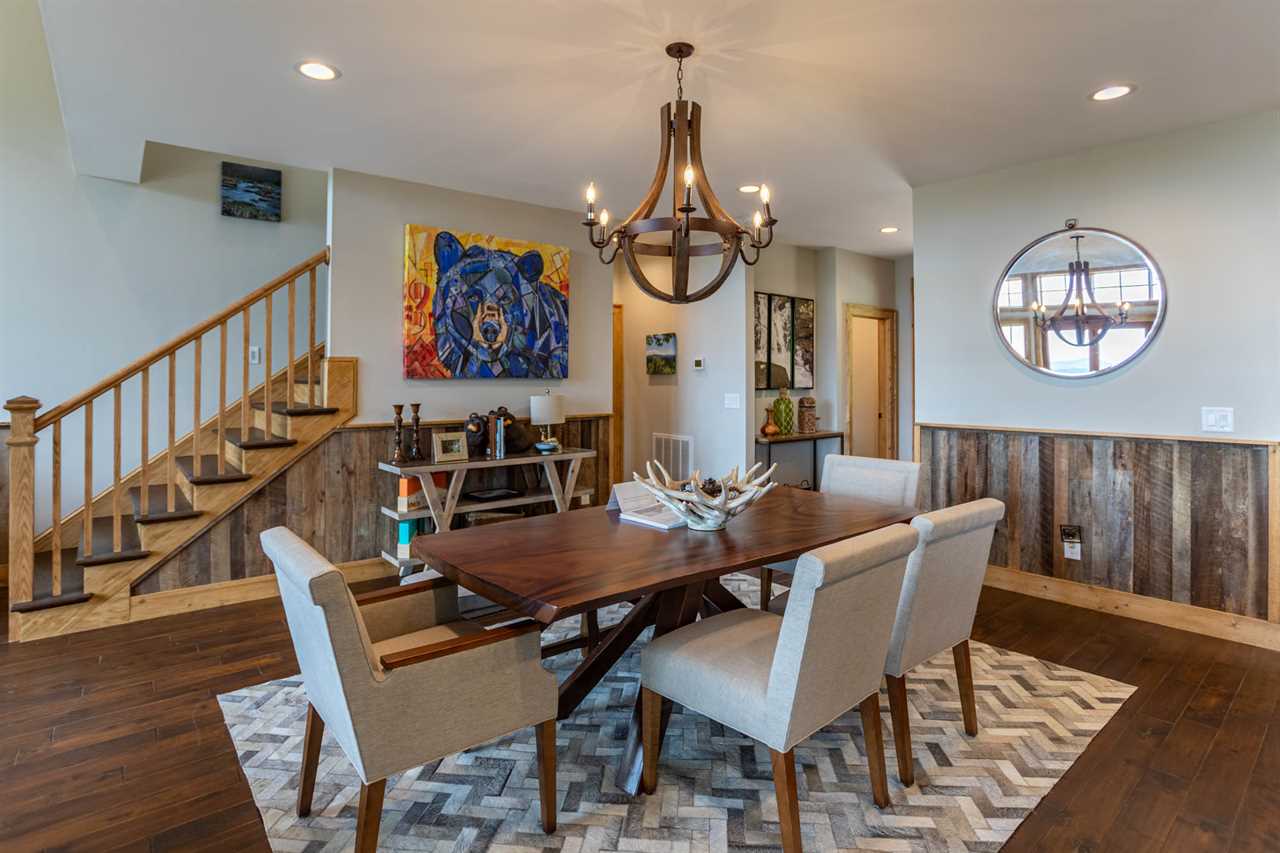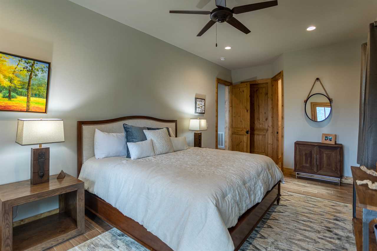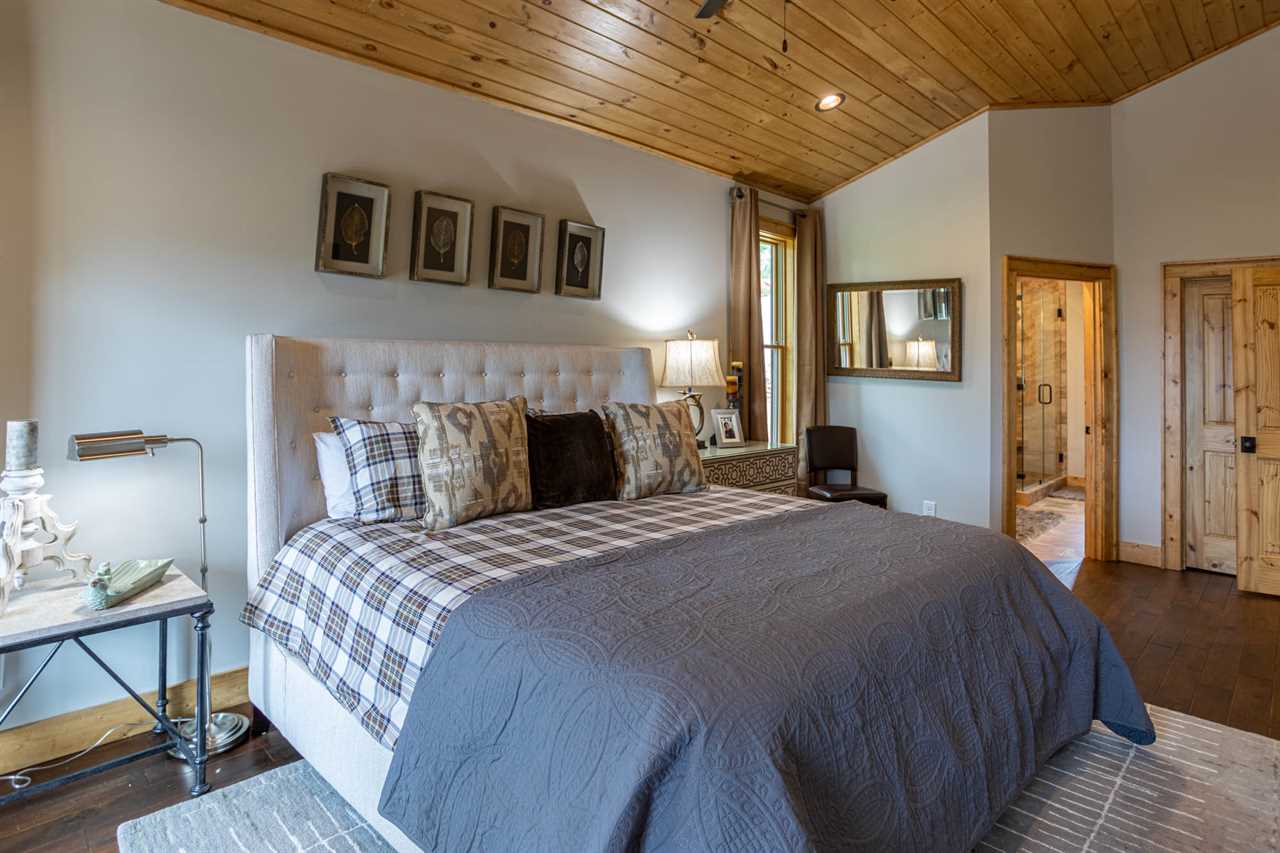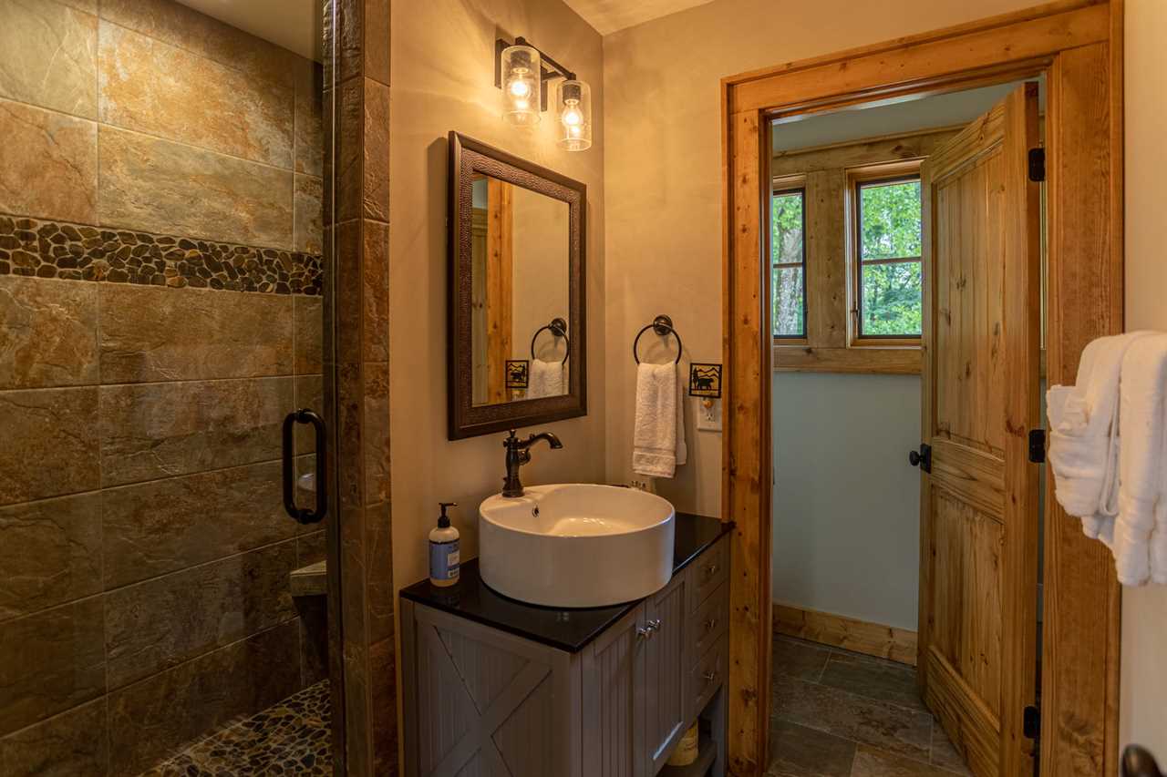 The open living room features majestic views, exceptional furnishings, a gas log fireplace, and a TV where friends and family can gather. The main floor has one Master King suite with deck access and its own TV. The ensuite bathroom has double vanities, and a custom tiled shower with a river rock bottom. There is a main level laundry room off of the kitchen and entryway with its own workspace and sink. The home has features artwork and photography that is locally sourced, showcasing the beauty of the area.