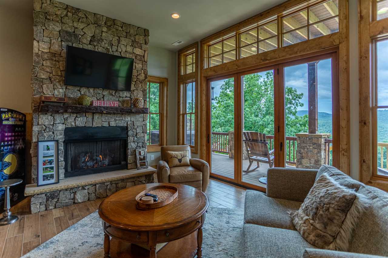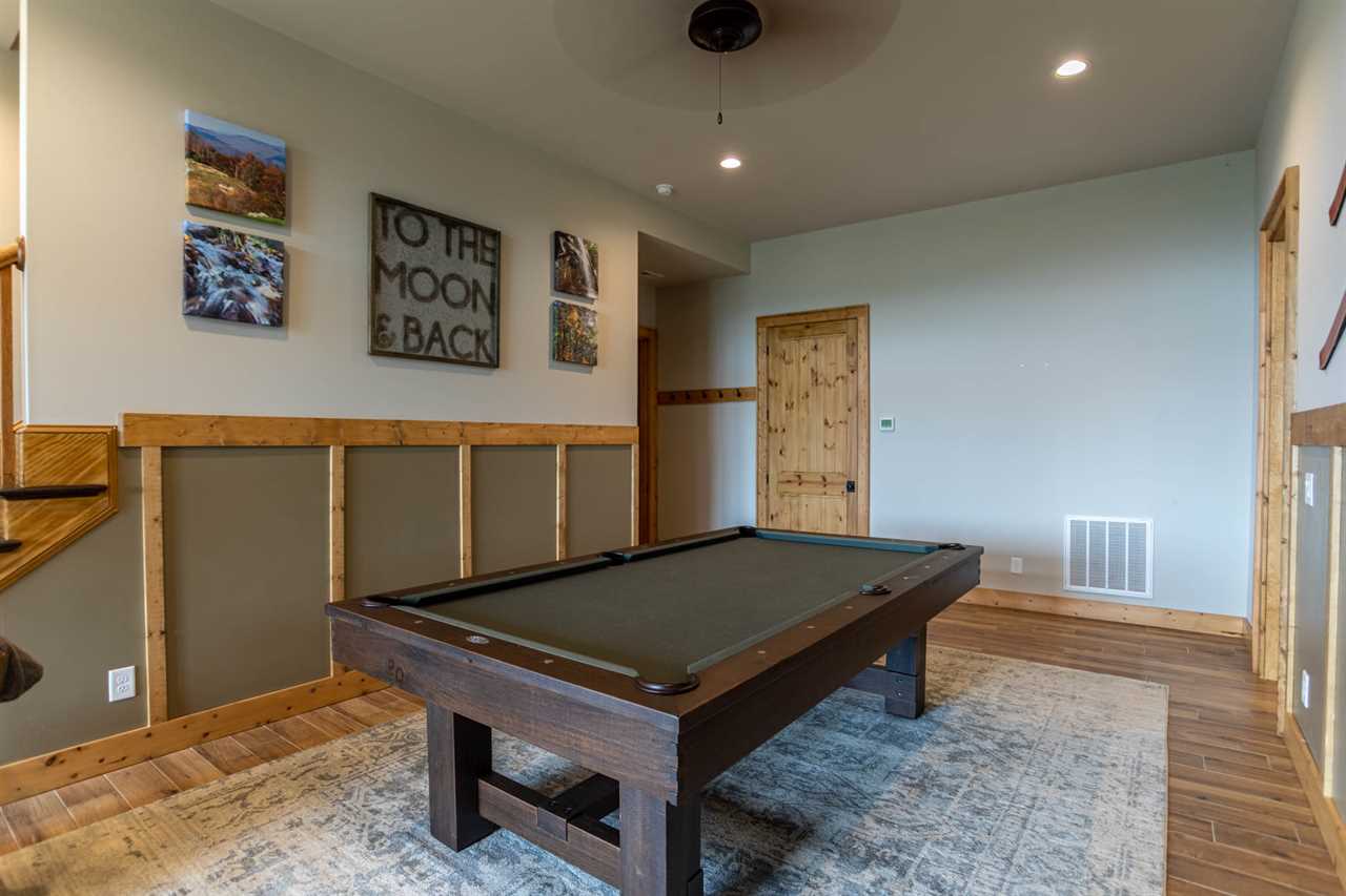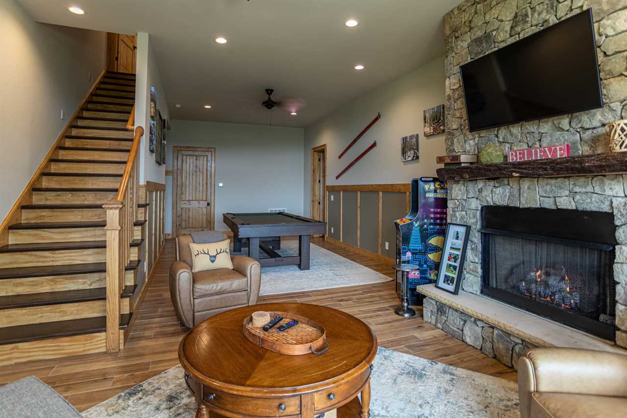 Upstairs you'll find a second King room with its own TV. The loft area has a Twin over Full bunk, and there is another tiled shower and bathroom to share. In the lower level, there is a second living area complete with a second gas log fireplace and TV. The game room features a full sized pool table and a Pac Mac arcade. Off of the game room is another King Master, with its own tiled shower and double vanities.