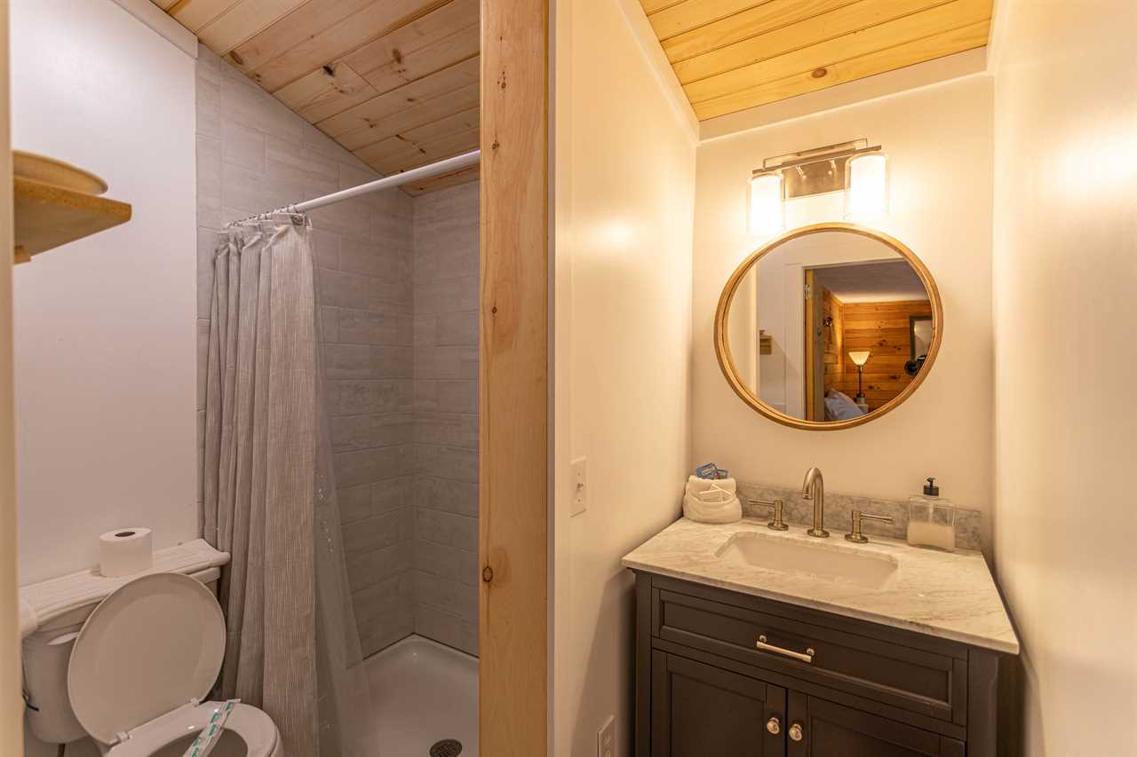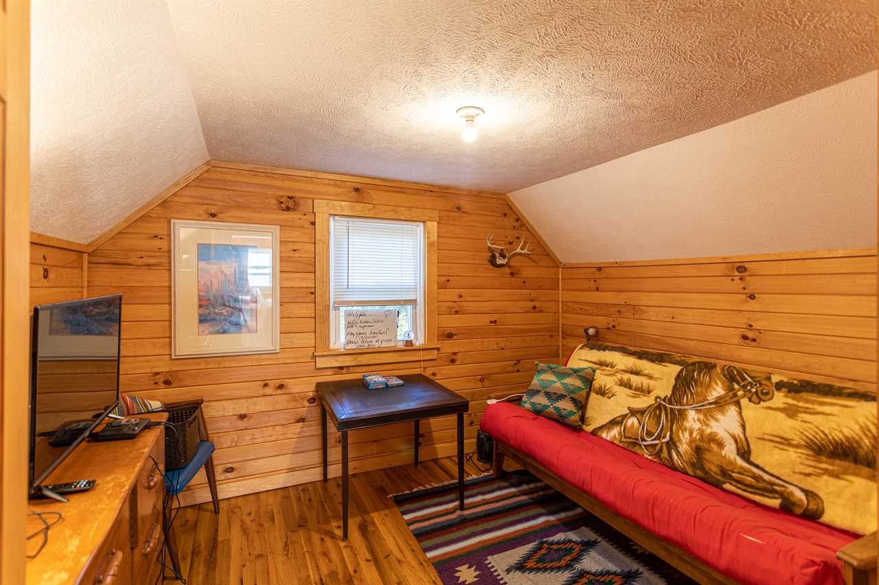 The master bedroom is on the main level and features a queen bed and full bathroom with a walk in shower only (no tub). Upstairs there is an additional bedroom with a queen bed. Across the hall is a small game room that has a flat screen TV, gaming console and a fold up card table.