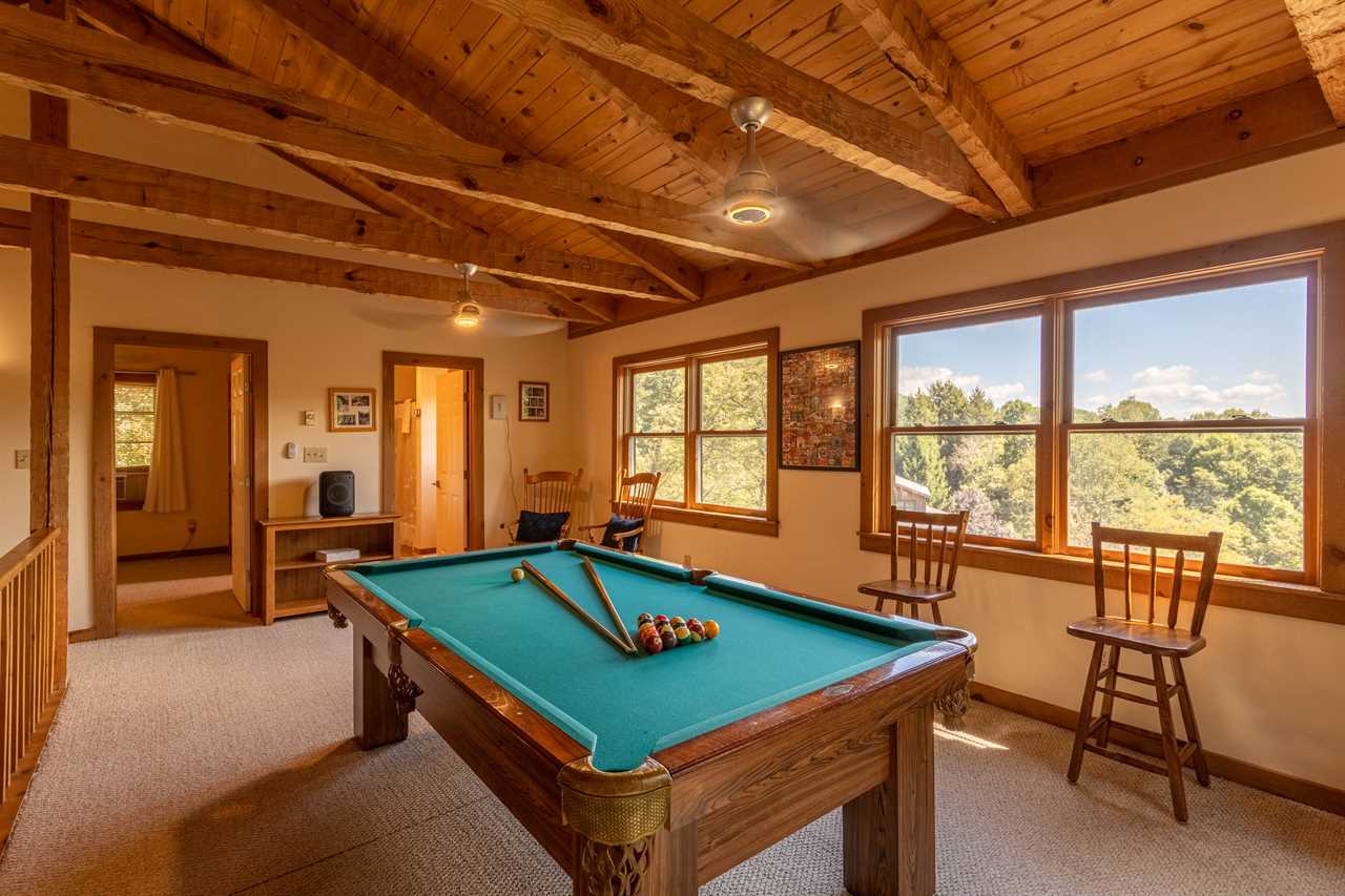 The upper level contains a room with queen bed and TV, a full bathroom, and an open loft with a pool table and great mountain views.