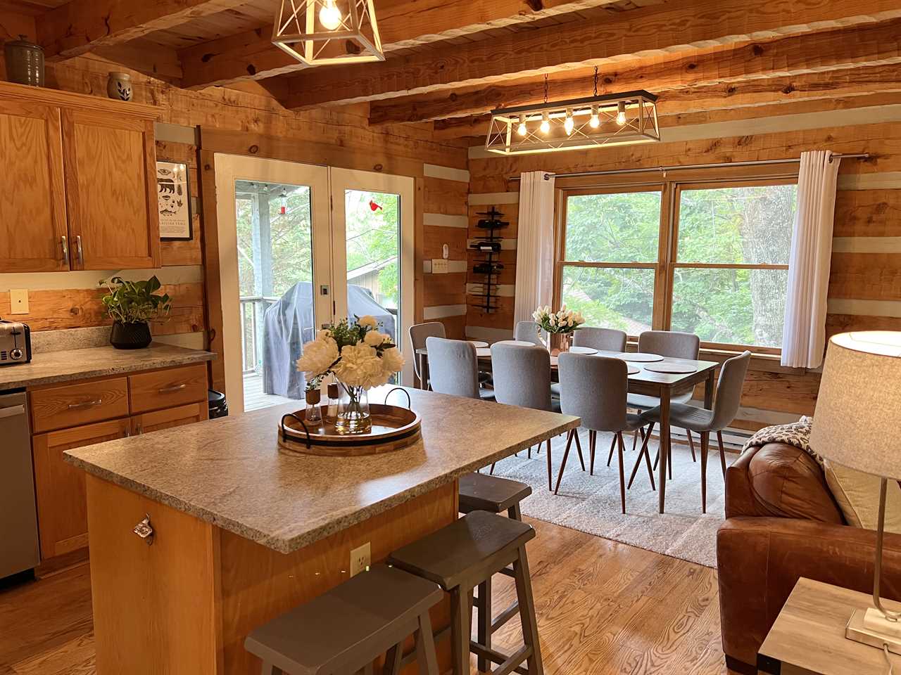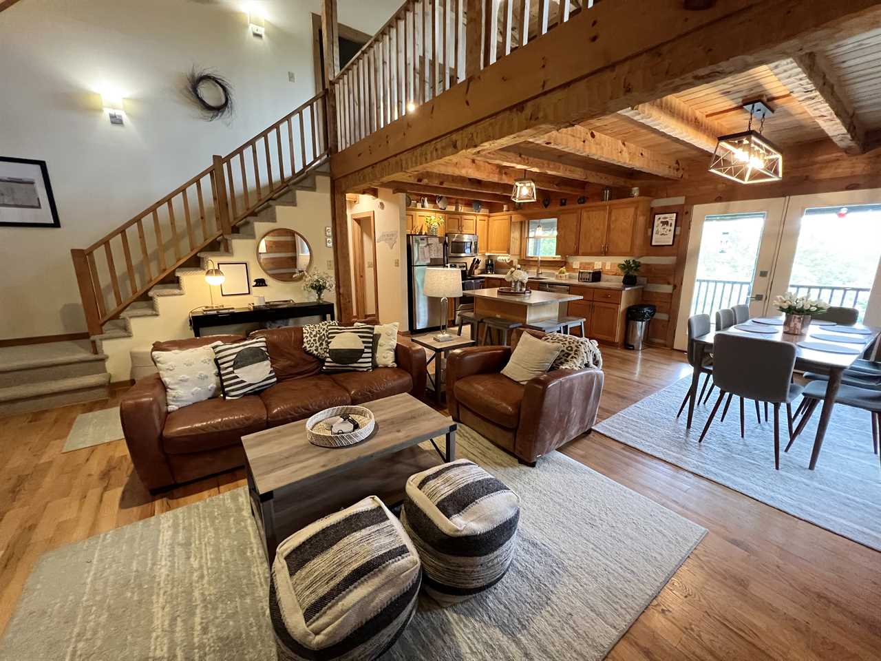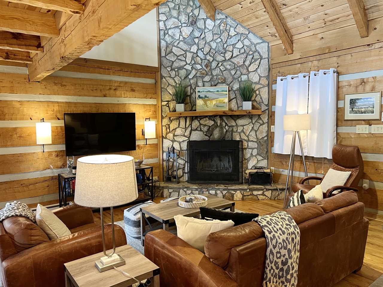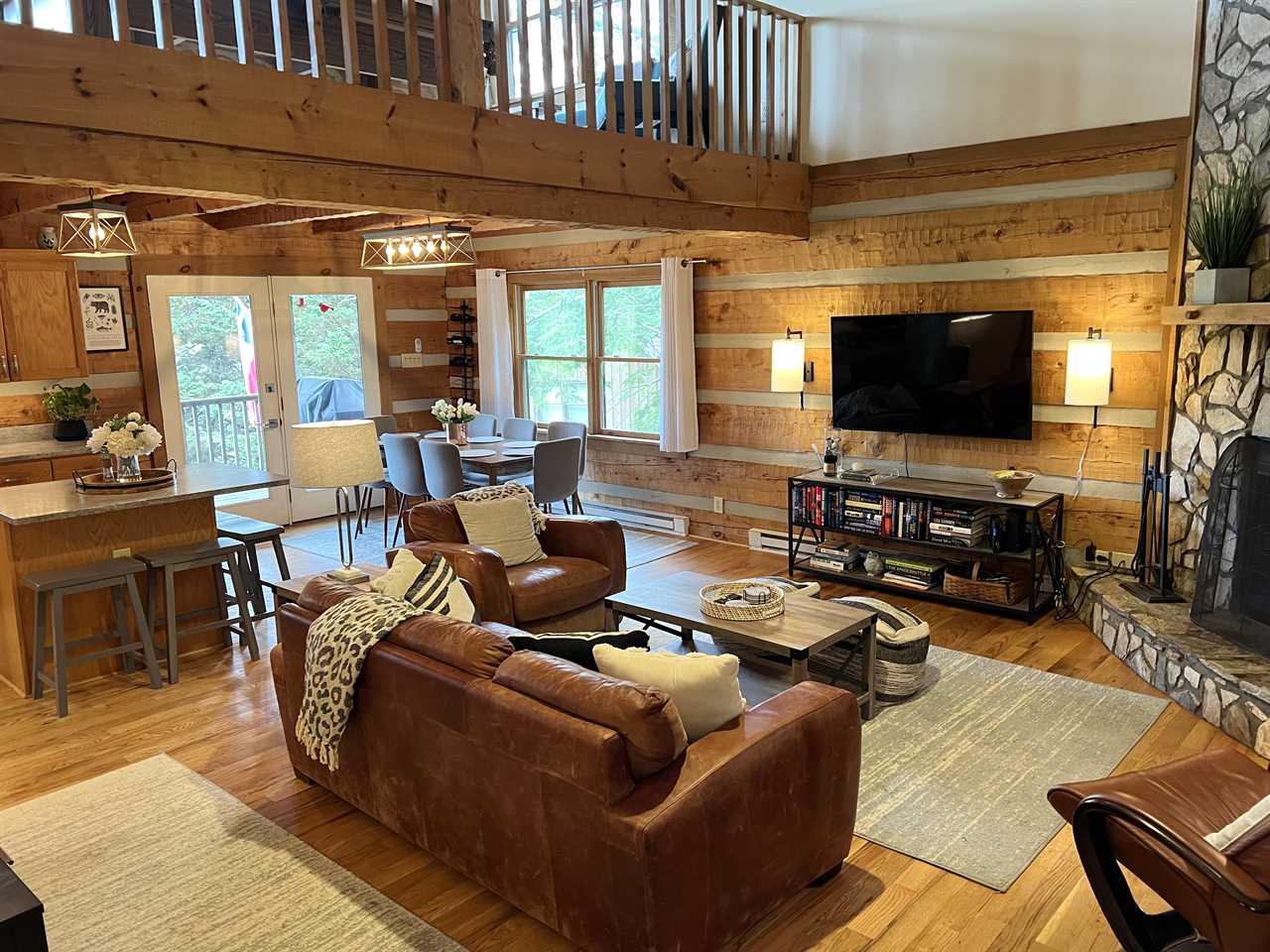 The main floor has an open floor plan containing a spacious living room with vaulted ceilings, a stone, wood-burning fireplace, and 55-inch flatscreen HDTV with streaming services and a DVD Player, a beautiful fully-equipped kitchen, a dining area, a master suite with king bed, a full bathroom with double jacuzzi tub and separate shower, a covered front porch with swing, and a large covered rear deck furnished with wood rockers, a porch swing, and a gas grill.