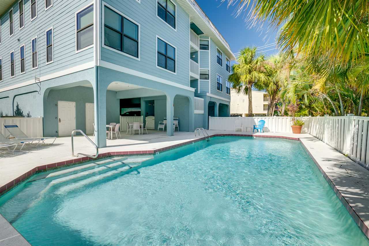 Tropical Sunset #1 offers great family-friendly amenities with a swimming pool, grilling area with picnic tables to relax. You'll never want to leave! In the ground floor beach locker, you will find everything you need for a great day on the beach plus a beach cart to get everything there with ease.