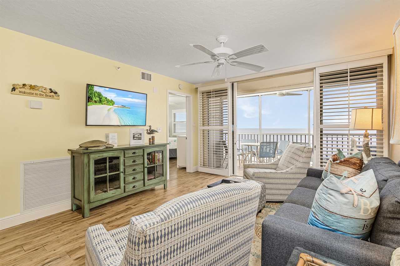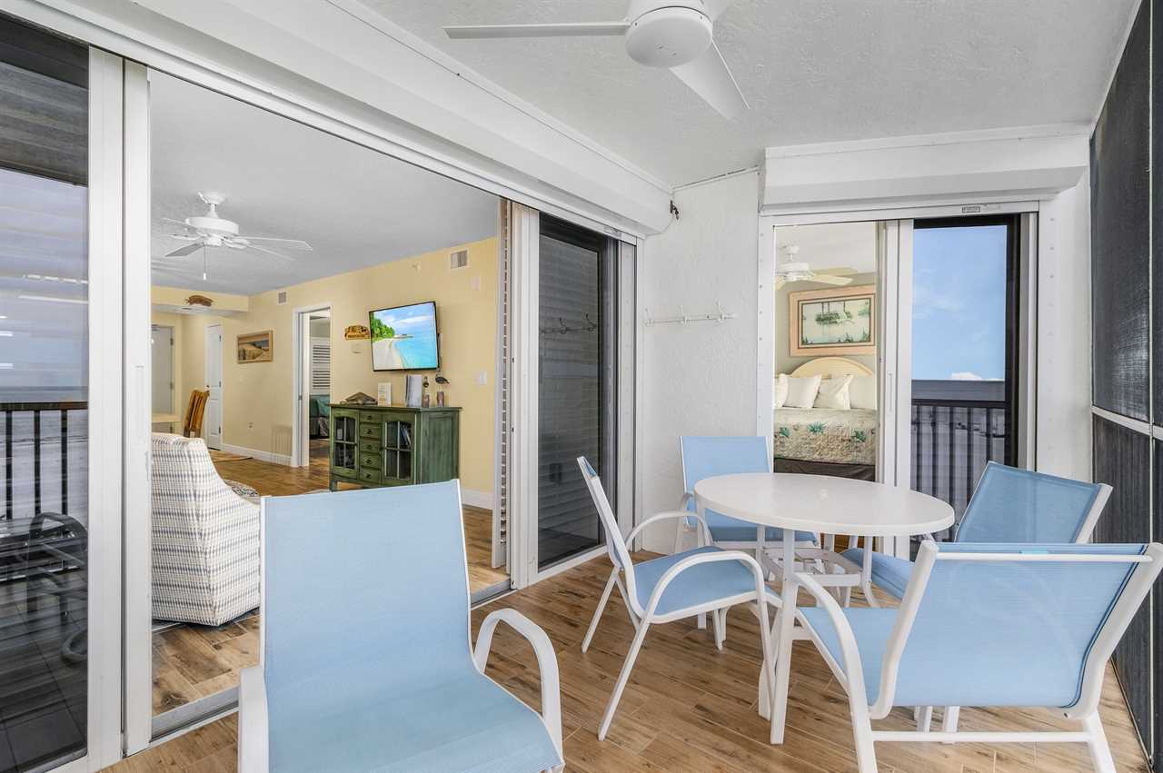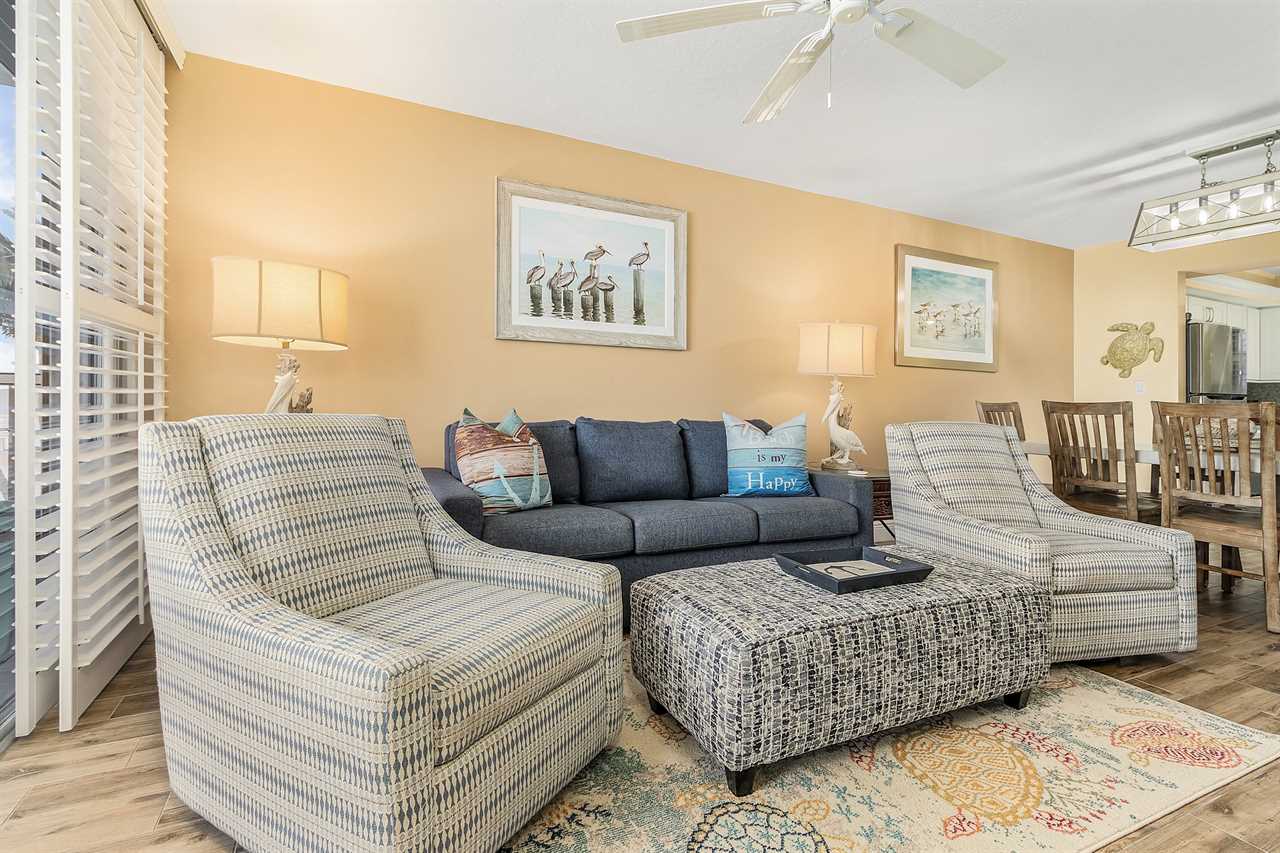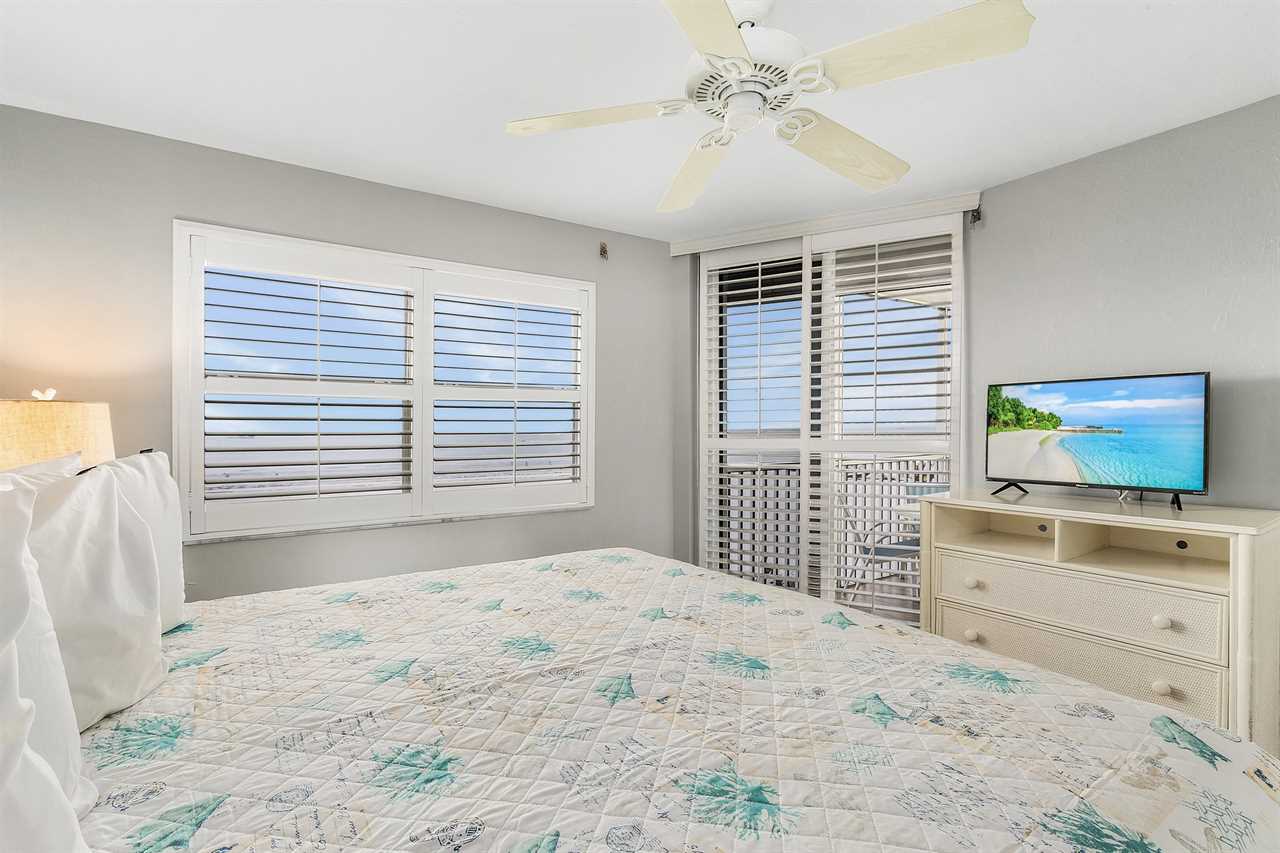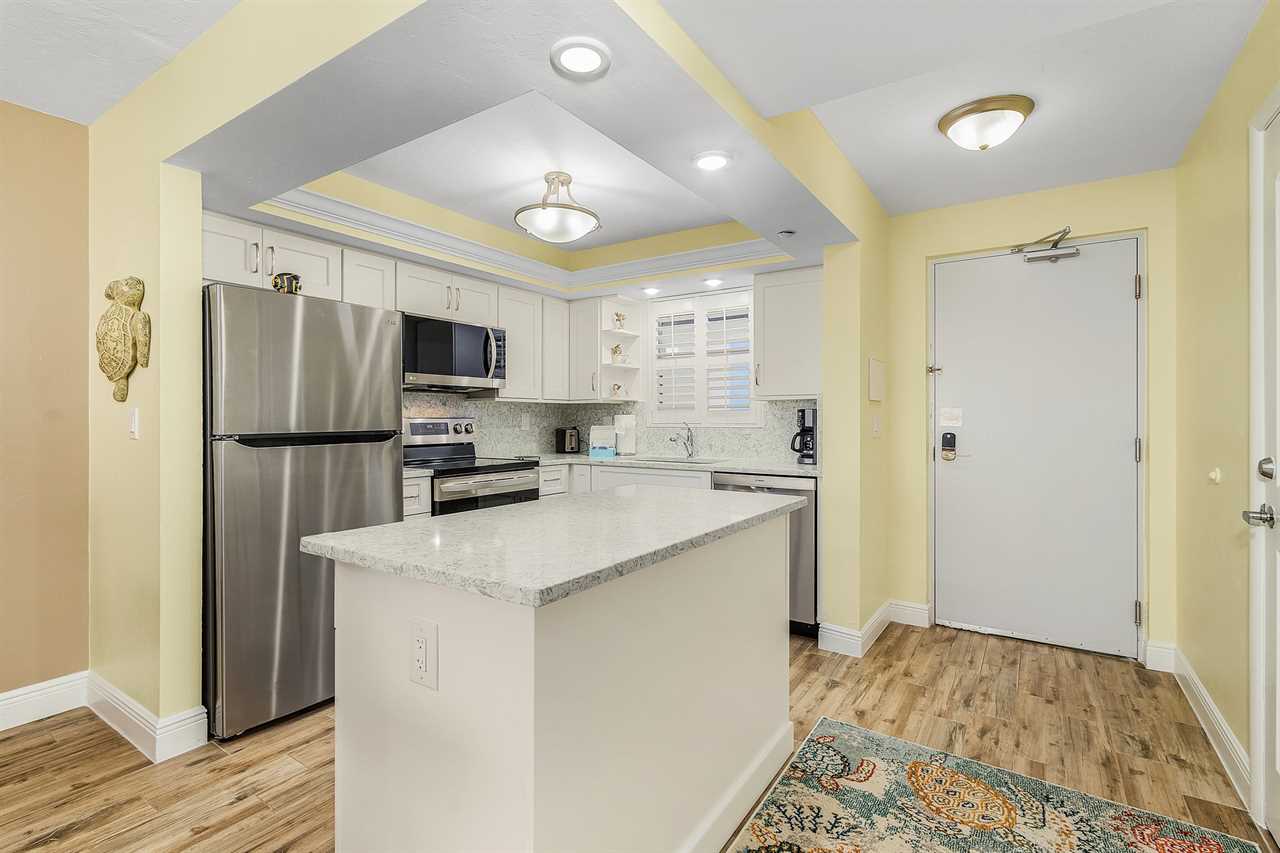 Entry is via elevator to the first floor and into an entry foyer and the open plan kitchen, dining, and living areas. There is beautiful tile flooring throughout. The kitchen is a chef's delight and everything necessary to create full-course meals is available should you so desire, or just toast and coffee in the morning. Just bring the food! There is an architectural tray ceiling and plenty of quartz counter space. Appliances include a dishwasher, glass-top range with oven, built-in above-range microwave oven, and refrigerator/freezer with ice maker. There is a quartz-top island with cabinet and drawer space on the kitchen side. The adjacent dining area has a rectangular table seating six. This flows into the living area which is nicely furnished with a top-end sleeper sofa with end tables and lamps, an elongated ottoman, and two swivel side chairs on an area rug. Opposite the seating area is a credenza which is a wall-mounted large flat-screen TV. Sliding glass doors from the living area provide access to the gulf-front screened-in balcony with a table seating four with two other chairs. You can't help but notice the expansive views, the peacefulness of the Gulf waters, and the sugar-white sand beach just a stone's throw in front of you. From this vantage point you will see Sanibel Island to the west, then nothing but the open Gulf of Mexico to the south.