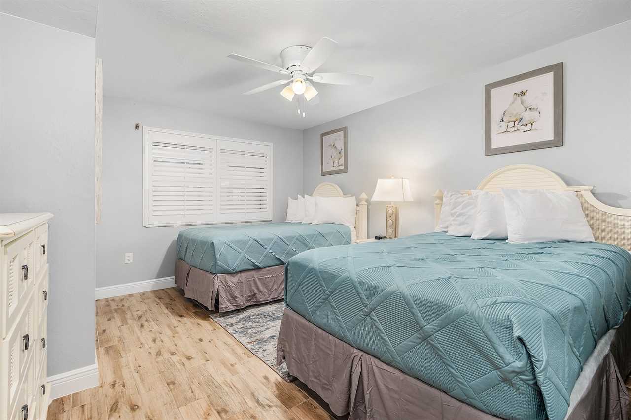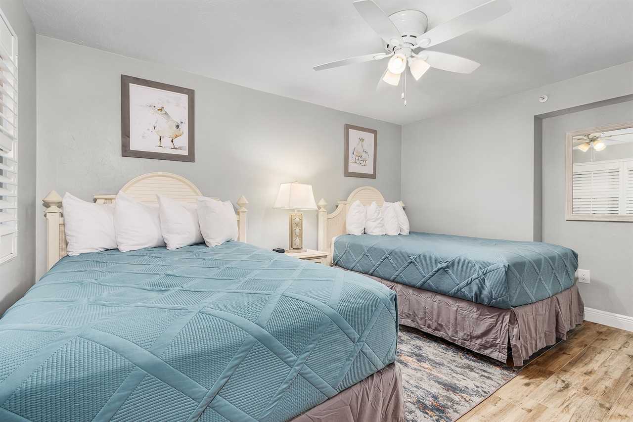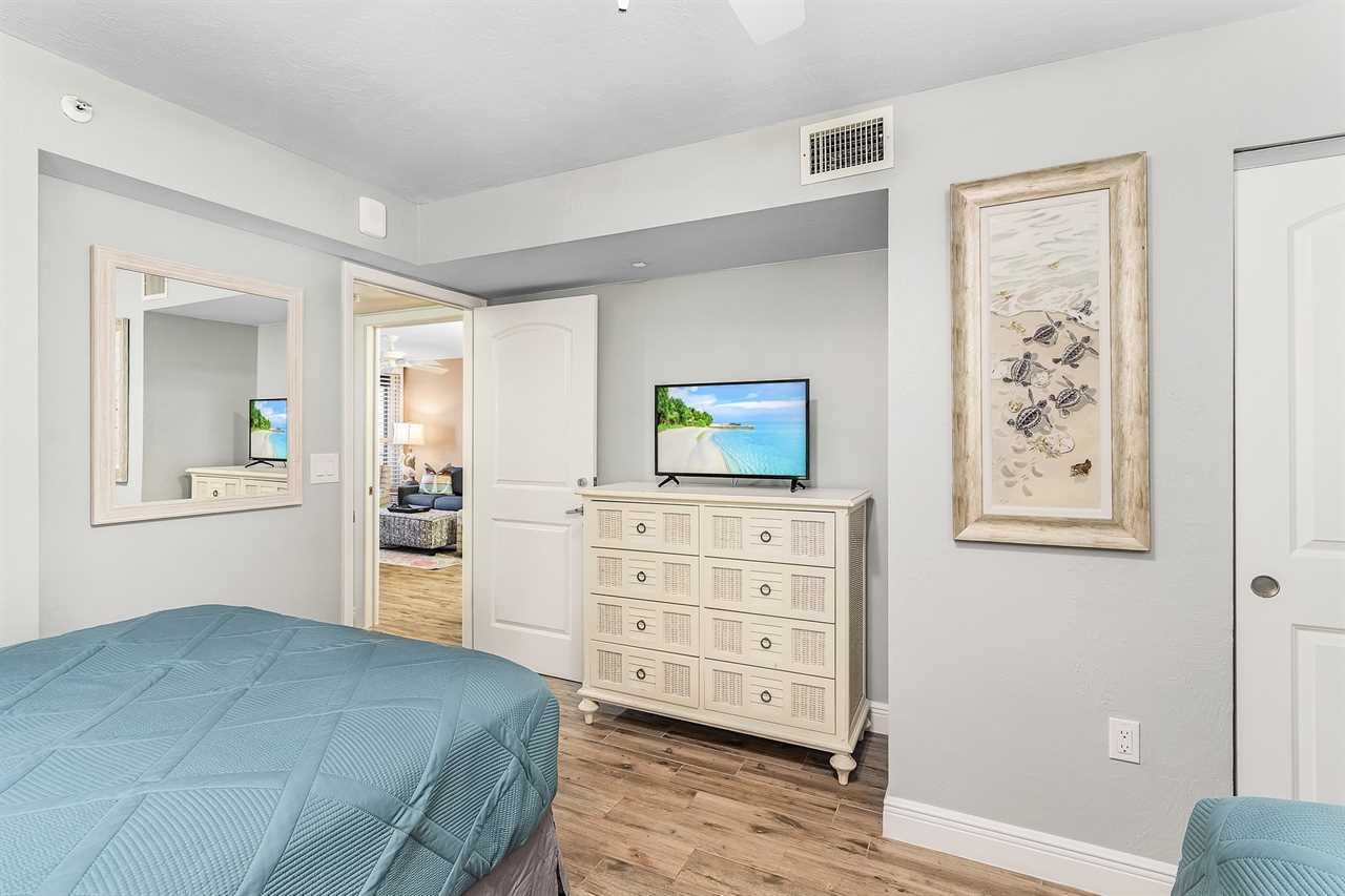The primary bedroom with en suite bath has a king-size bed, nightstands and lamps, a chest of drawers with a flat-screen TV, and sliding glass doors out to the balcony. The windows in this bedroom also offer a great view of the beach and the Gulf of Mexico. The bathroom has a closet and quartz vanity with a lavatory and storage space beneath, the open concept includes a commode and attractively tiled walk-in shower with a built-in seat, handrails, and sliding glass doors. The guest bedroom, bath, and laundry area are accessible through a pocket door. Behind louvered doors is a stacked washer and dryer set. The guest bathroom has a quartz vanity with a lavatory and storage space beneath, a commode, and a nicely tiled combination tub/shower. The guest bedroom is furnished with two full-size beds with nightstands and lamps, a tall double dresser with a flat-screen TV, and ample closet space.