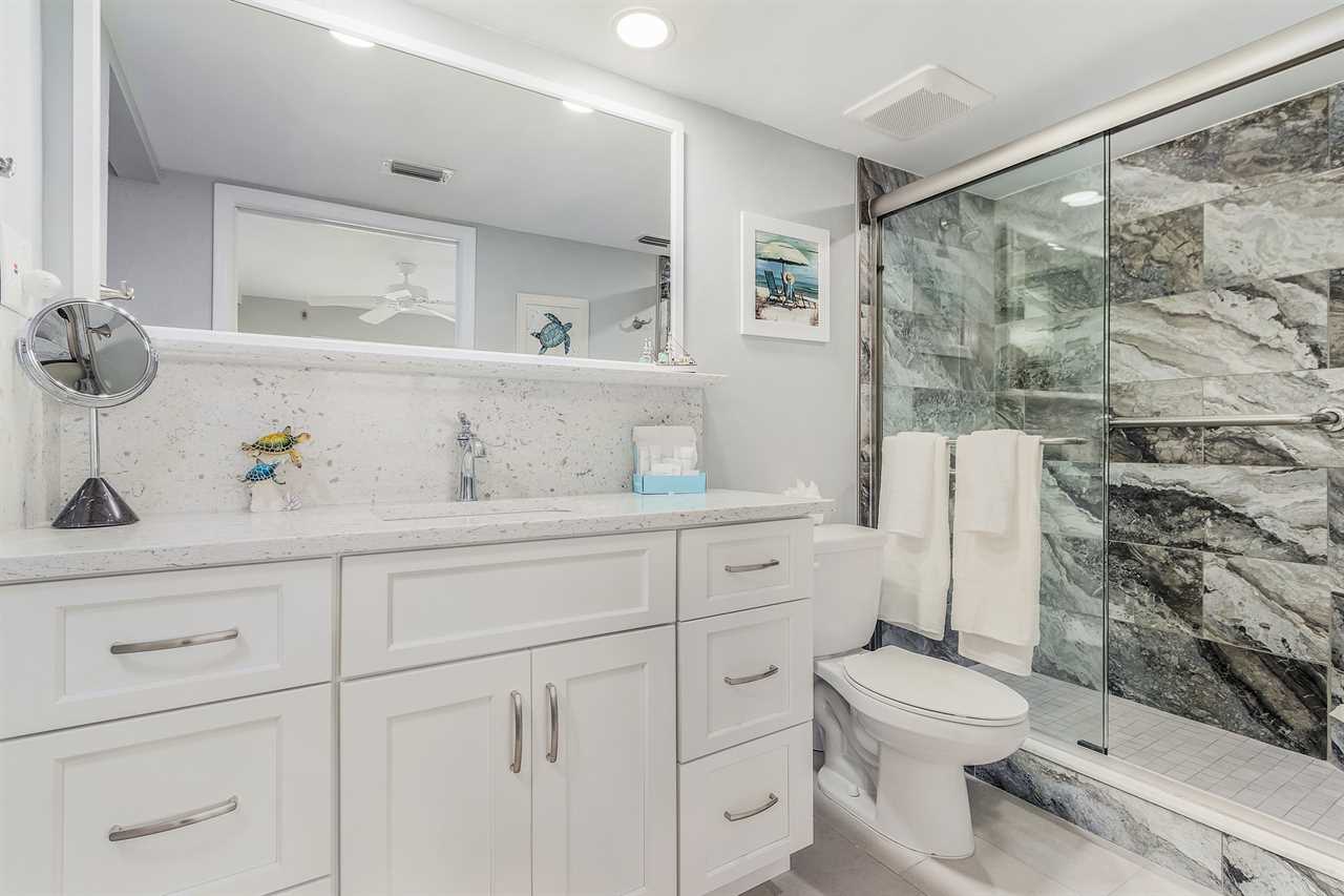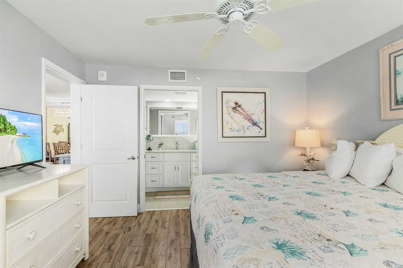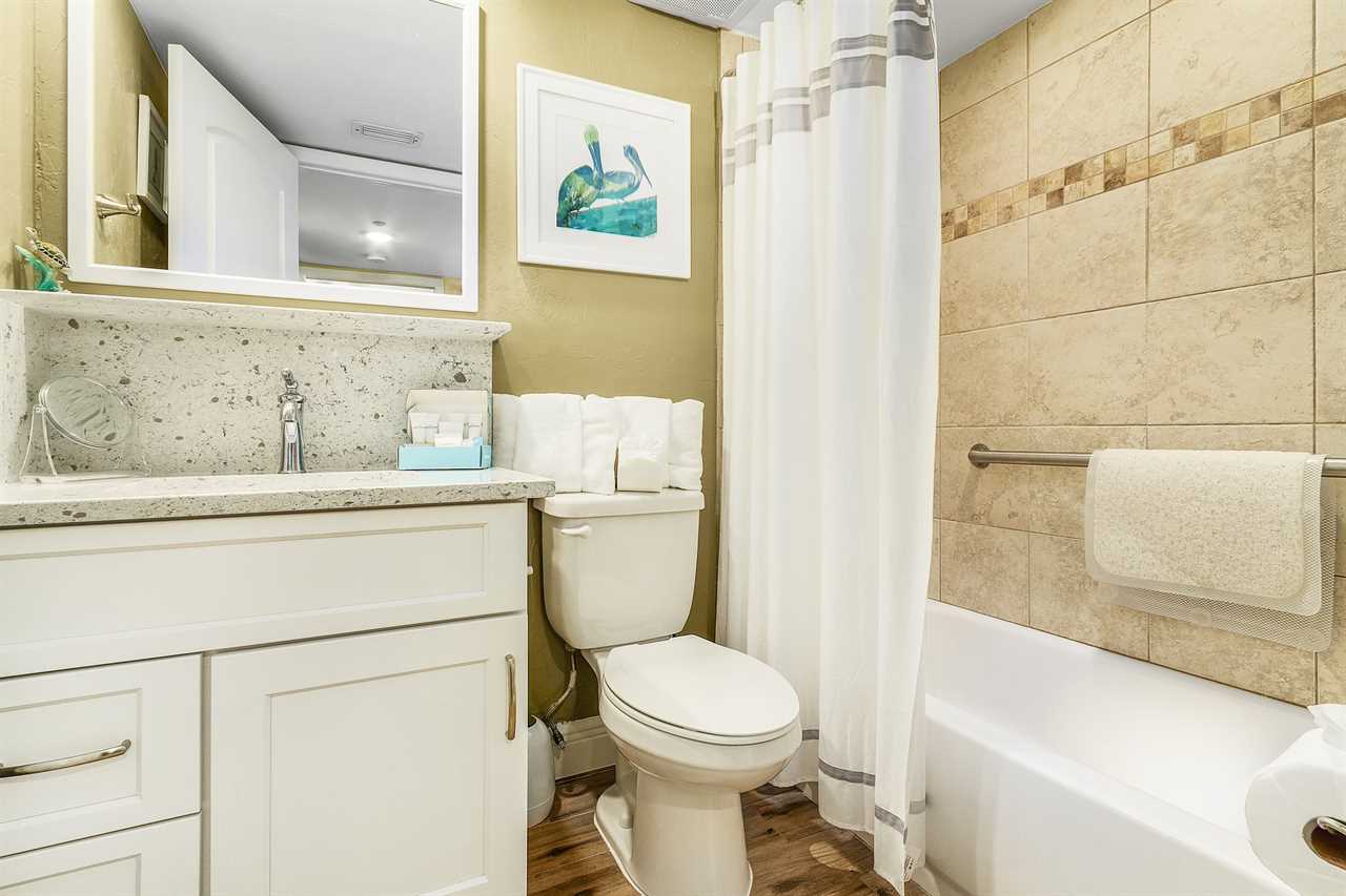 The primary bedroom with en suite bath has a king-size bed, nightstands and lamps, a chest of drawers with a flat-screen TV, and sliding glass doors out to the balcony. The windows in this bedroom also offer a great view of the beach and the Gulf of Mexico. The bathroom has a closet and quartz vanity with a lavatory and storage space beneath, the open concept includes a commode and attractively tiled walk-in shower with a built-in seat, handrails, and sliding glass doors. The guest bedroom, bath, and laundry area are accessible through a pocket door. Behind louvered doors is a stacked washer and dryer set. The guest bathroom has a quartz vanity with a lavatory and storage space beneath, a commode, and a nicely tiled combination tub/shower. The guest bedroom is furnished with two full-size beds with nightstands and lamps, a tall double dresser with a flat-screen TV, and ample closet space.