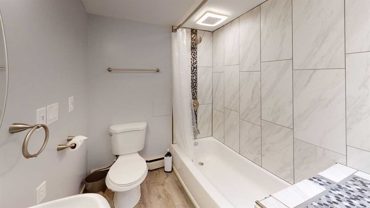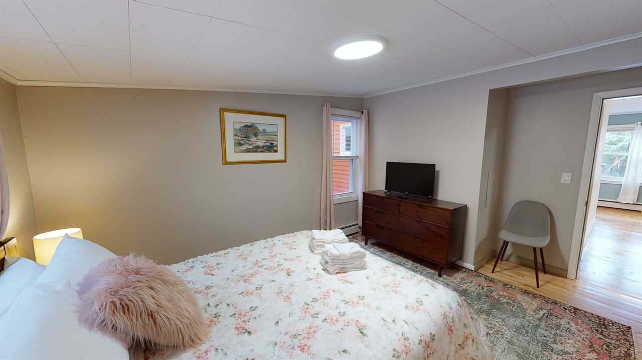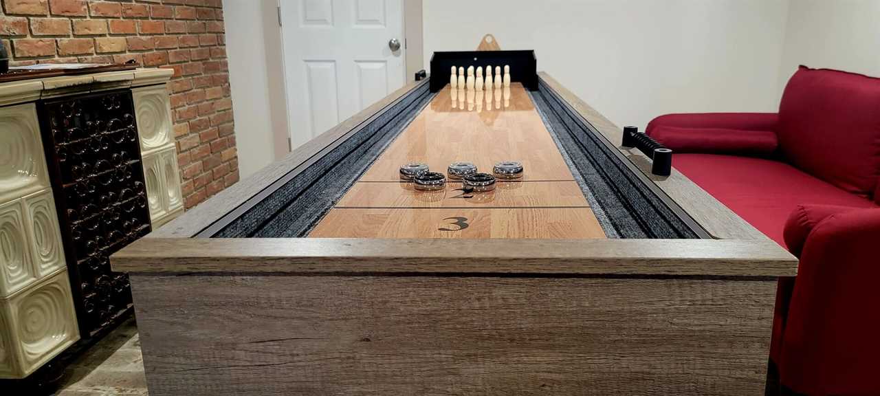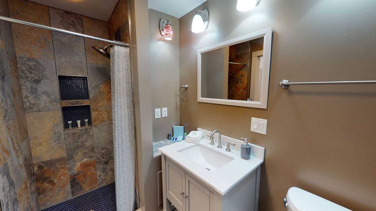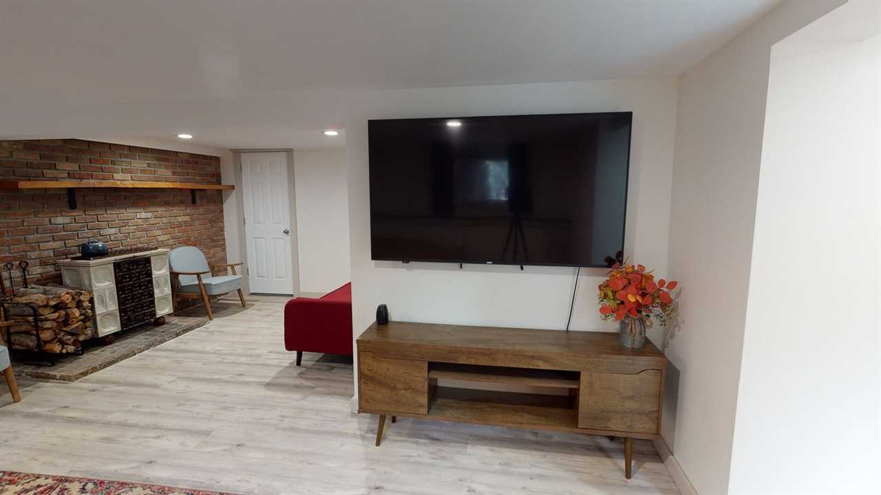 The home's thoughtful layout includes three main-level bedrooms, each with a queen bed and its own smart TV, while the primary suite adds a private en-suite bath for extra comfort. Downstairs, the fourth bedroom features two twin beds and an attached full bath — ideal for kids or friends. The lower-level family room offers more space to spread out, complete with two sofas (one a sleeper), a 70-inch smart TV, and a shuffleboard table for friendly competition.