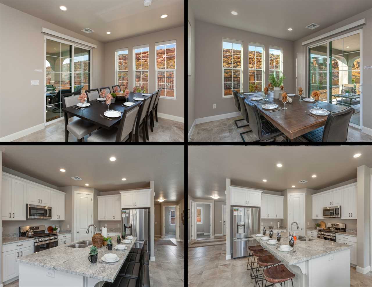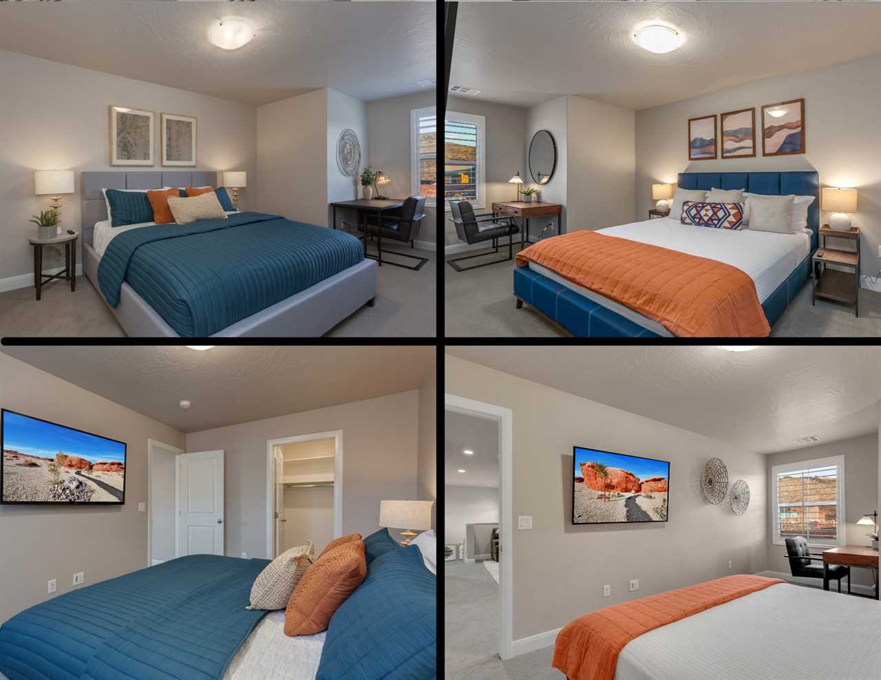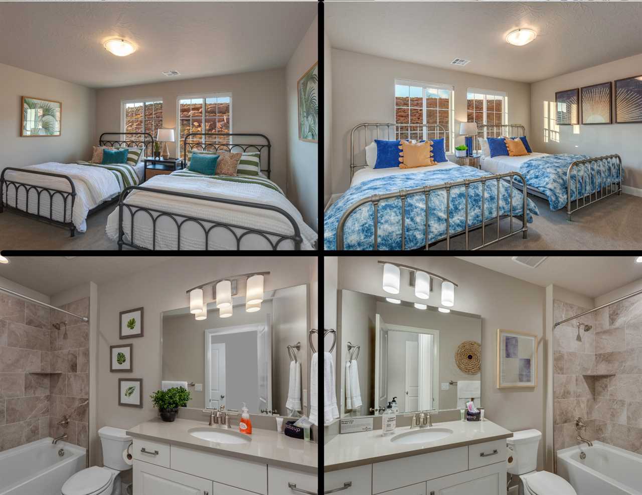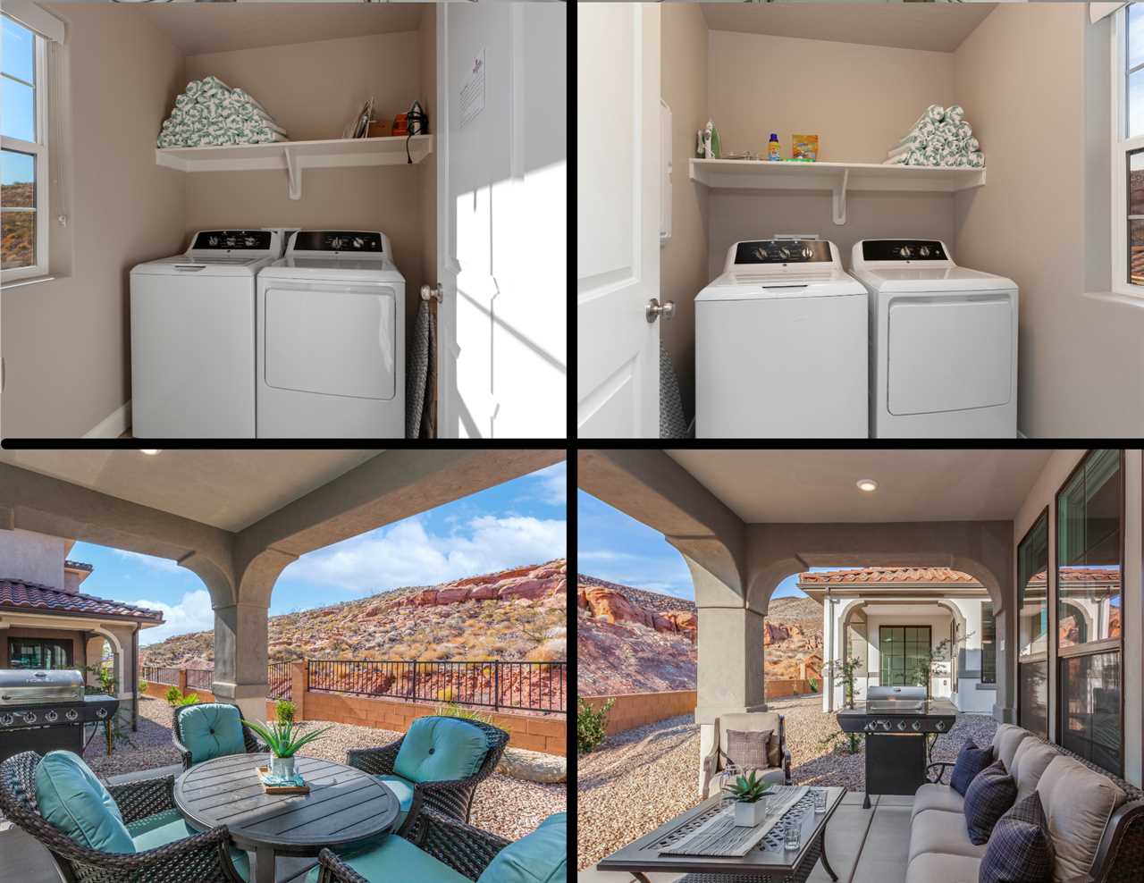 The first home is a beautiful 5 bedroom / 4 bathroom townhome that can comfortably sleep up to 18 guests. Located just outside of sunny Saint George, you will be surrounded by stunning red rock mountains and scenery, local petroglyphs, and fossils. Each bedroom is equipped with a Smart TV, perfect for relaxing and watching a movie after a long day of exploring. There are 2 bedrooms downstairs, including the master bedroom. The floor plan is open-style with tons of room for entertaining and spending time with your loved ones. There are 3 additional bedrooms upstairs that surround the loft area, as well as 2 more bathrooms.