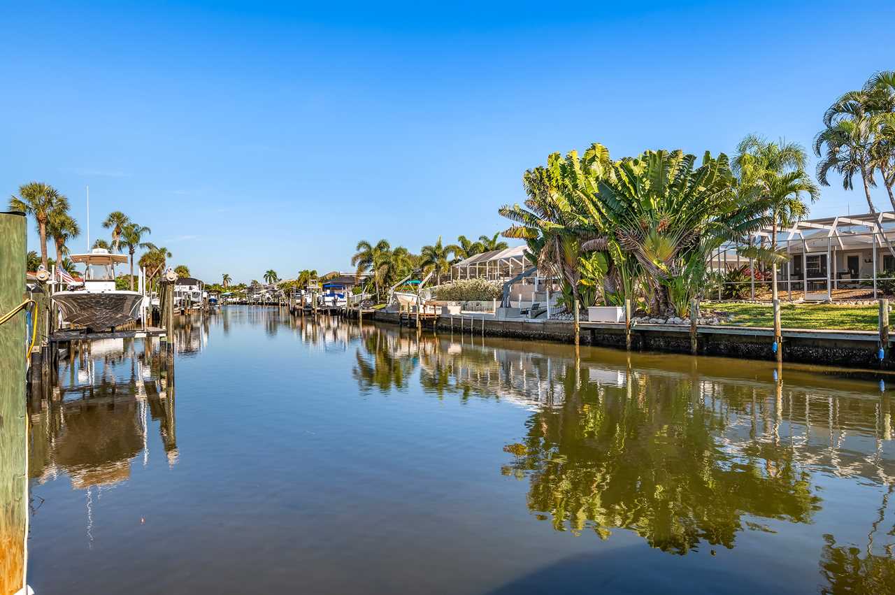 Leading out to the lanai the pool area has a large covered area and also available space to enjoy the sun in the loungers. The private pool can be heated for an additional fee during the colder months of the year. (This property DOES NOT have a spa). Leading out onto the deck is a large brick paver area as well as an extended dock perfect for your boat along with electricity and water.