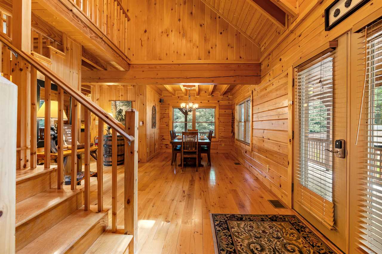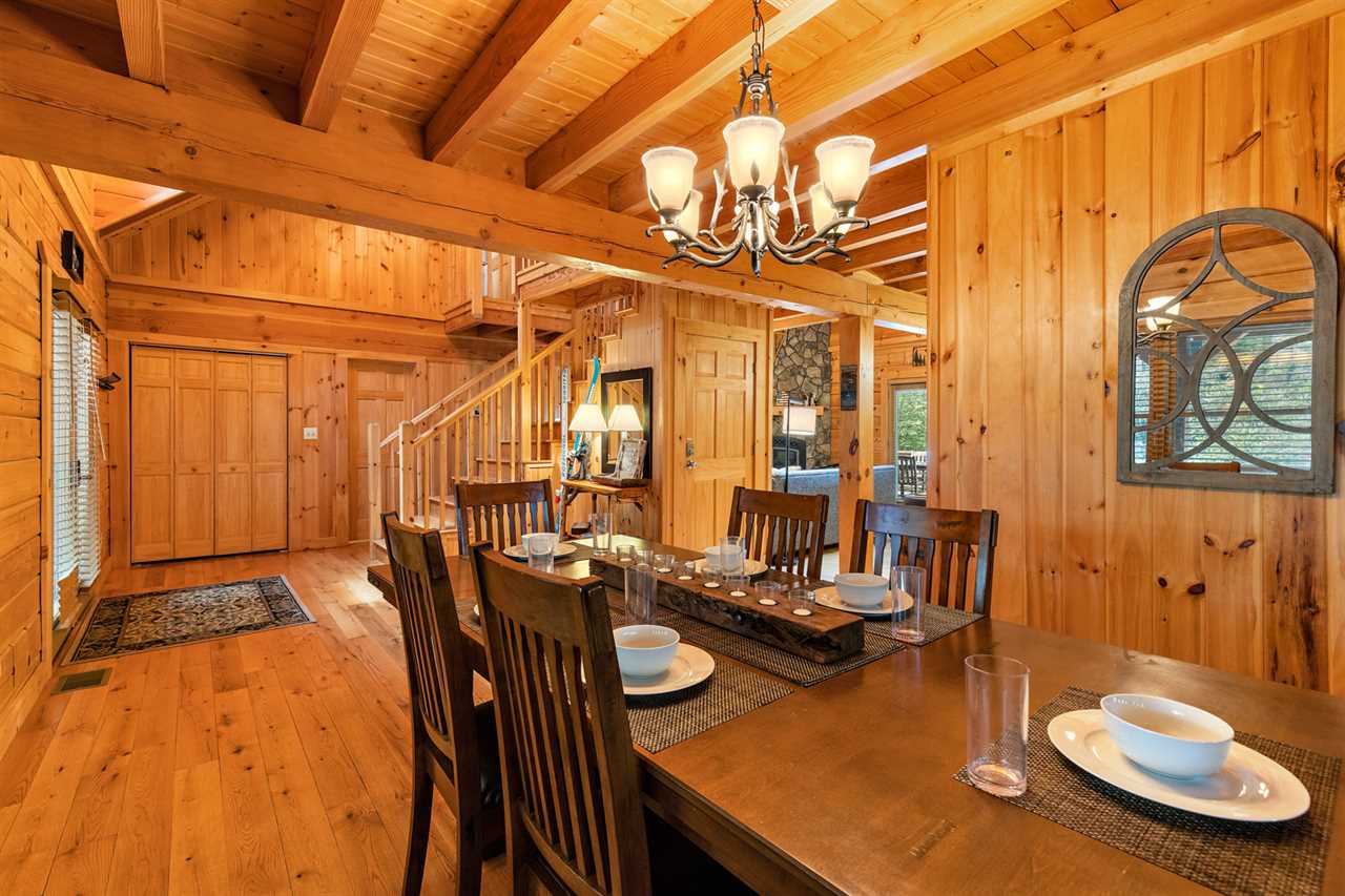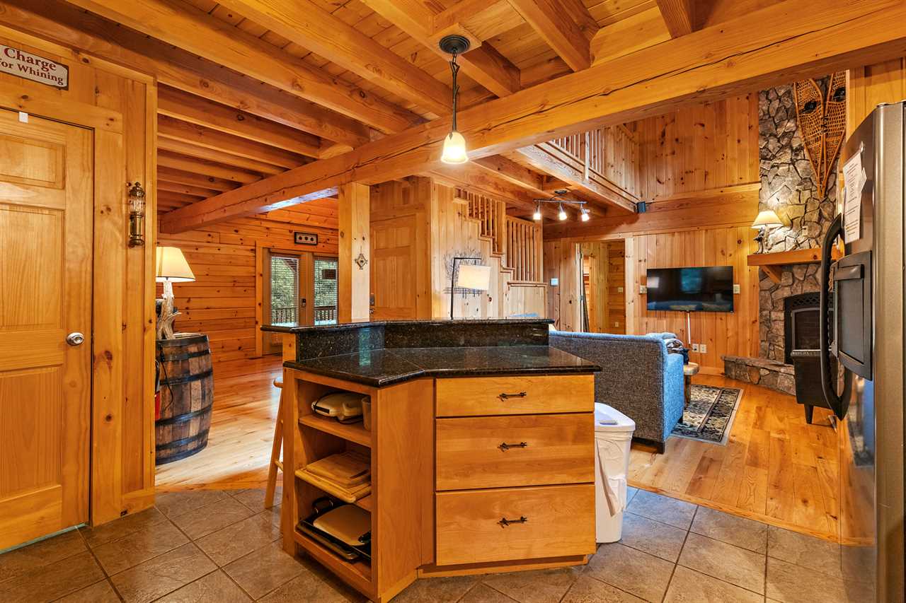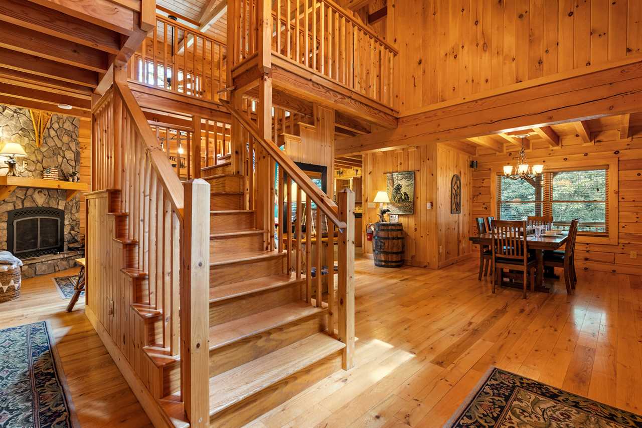 There is a large backyard to play in, with a fire pit where you can roast marshmallows as the sun goes down. The wrap-around deck is perfect for sitting or relaxing in the 5-person hot tub as you listen to the sounds of nature or enjoy dinner by the outdoor wood-burning fireplace.