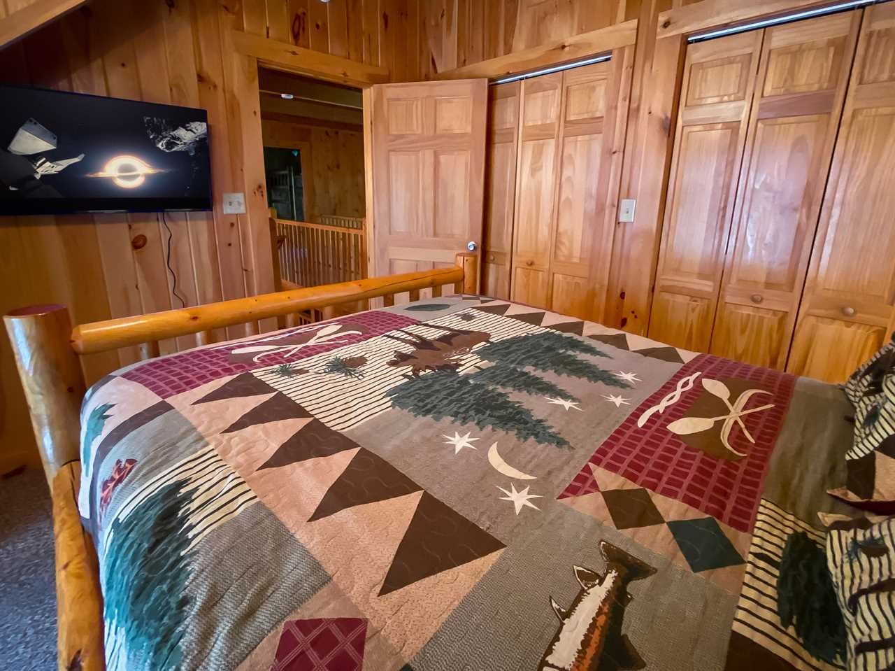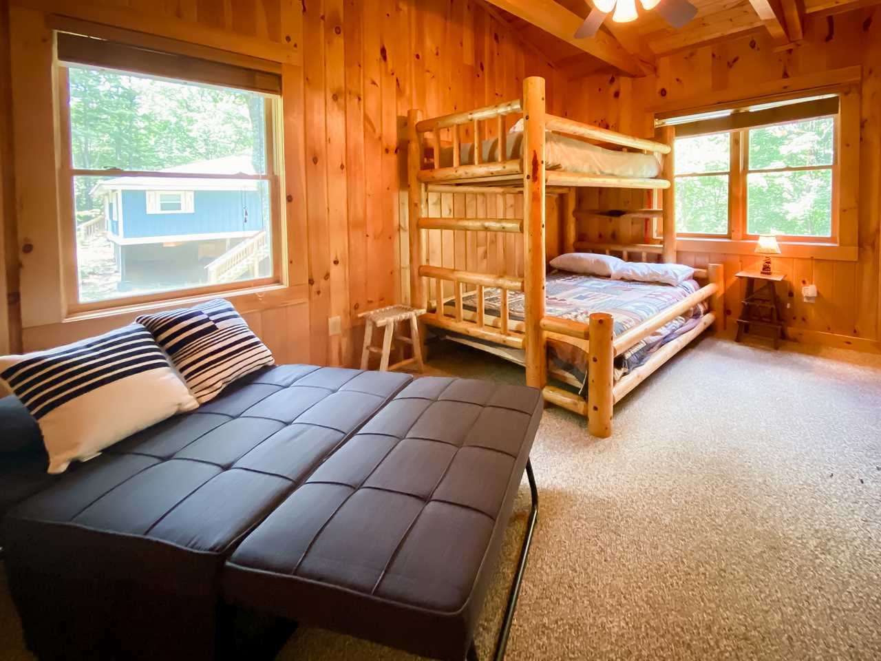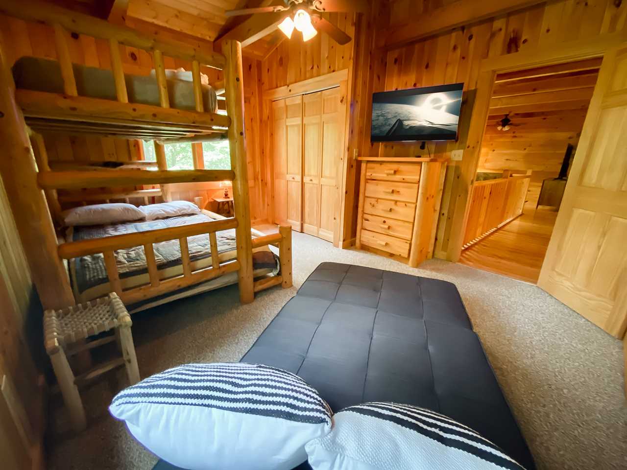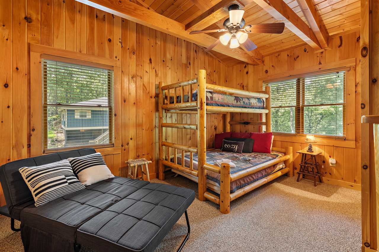 The dining area, kitchen, open two-story living area with a gas fireplace, and a half bath are on the main level. Off the living area is the master bedroom, which features a king-size bed and a master bath with a walk-in shower. Upstairs is a loft with a queen-size leather sleeper sofa, two more bedrooms, and a full bath. One has a queen bed, and the other has a twin-over-full bunk bed. The bunk bedroom also has a sleeper chair. There is a 65-inch Smart TV in the loft.
