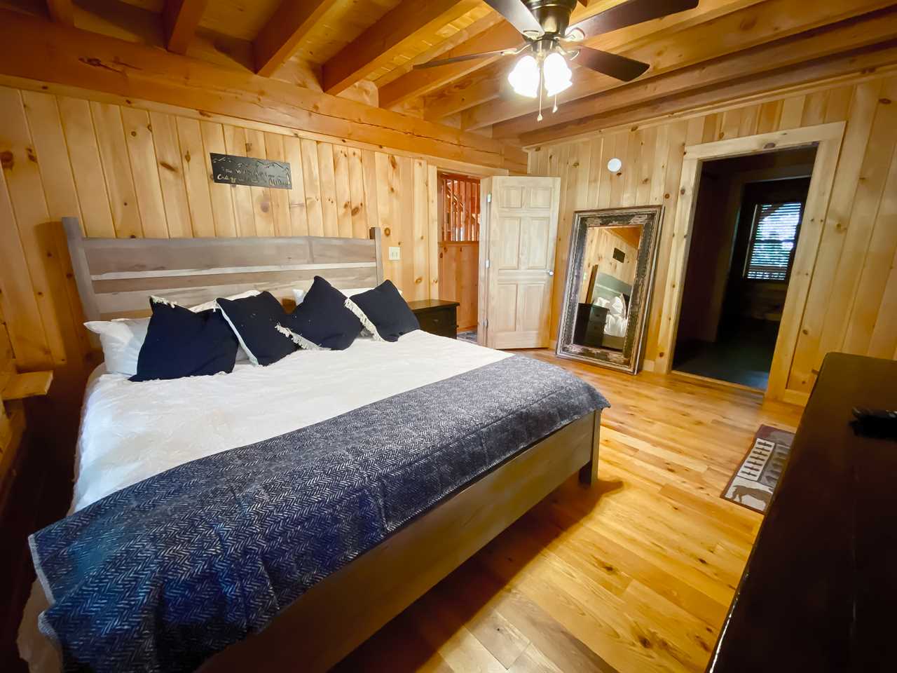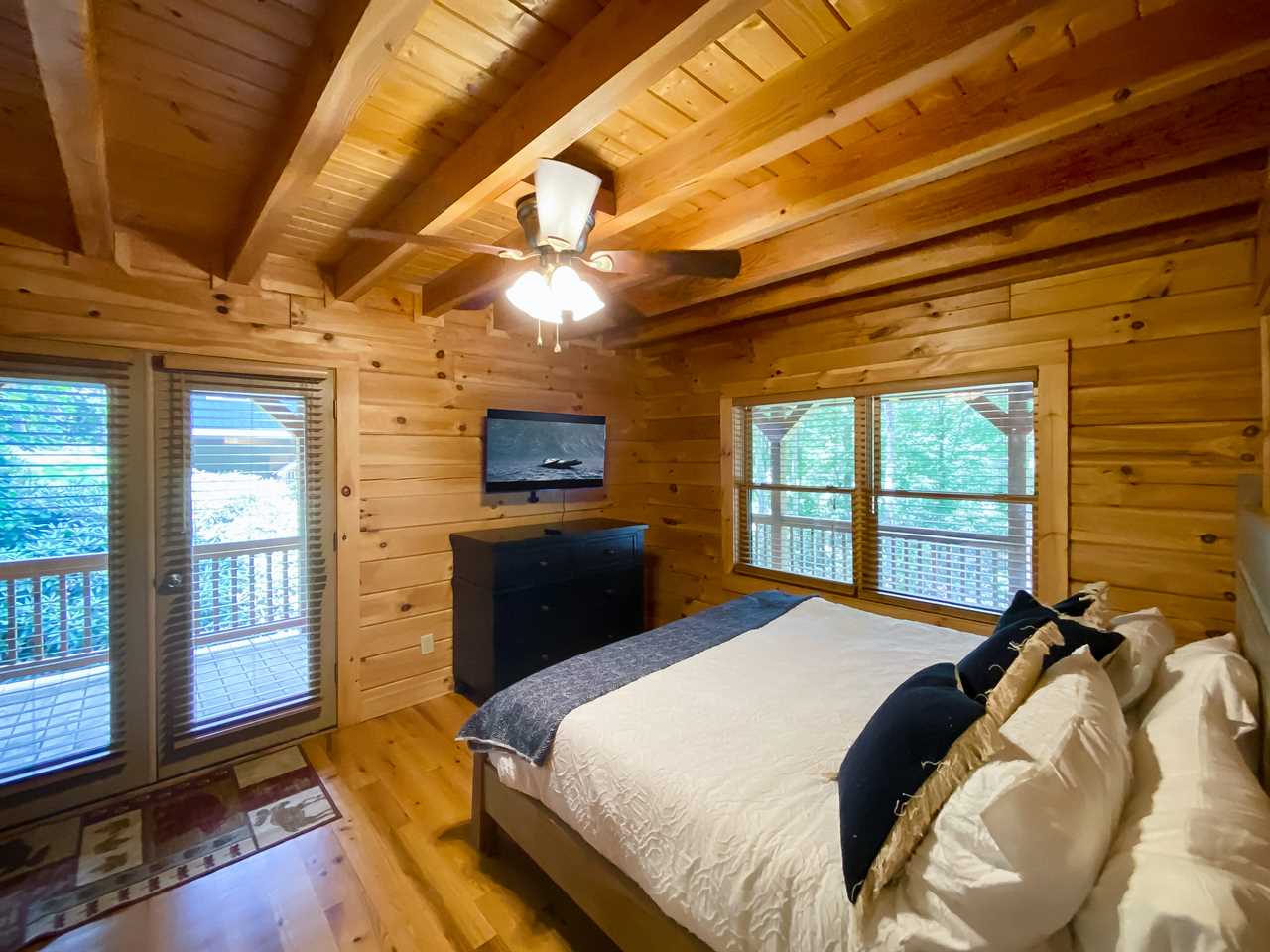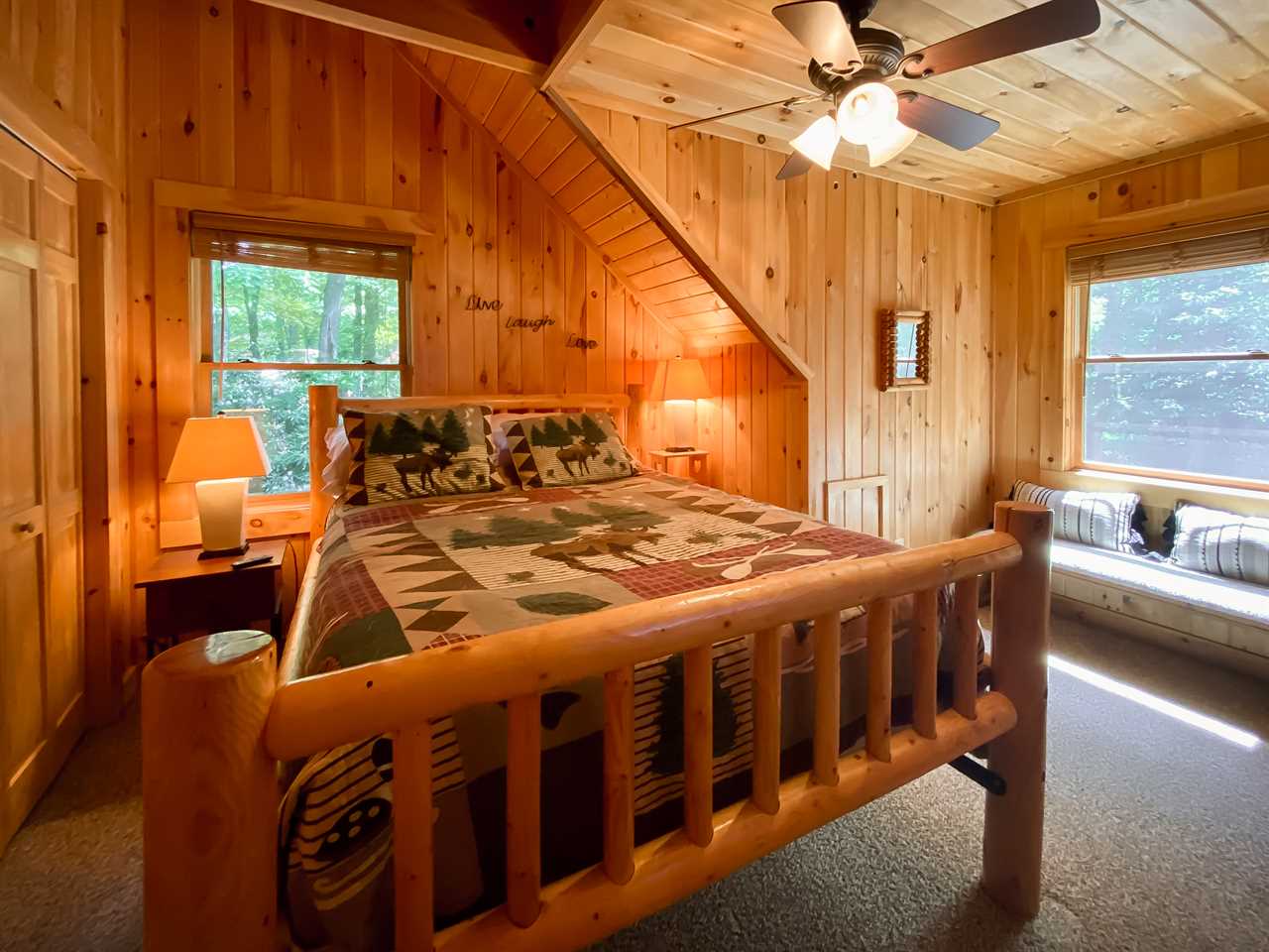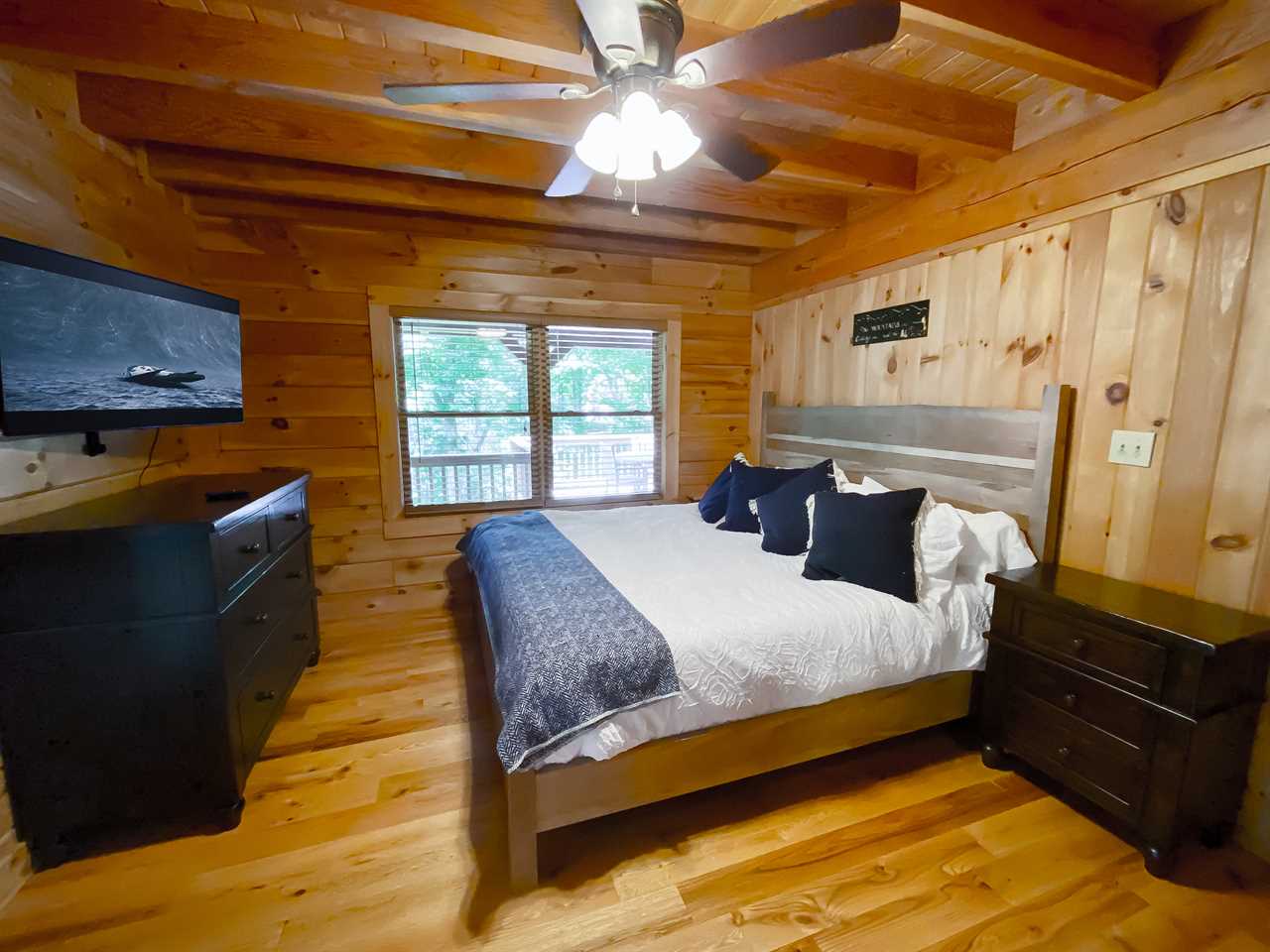 The dining area, kitchen, open two-story living area with a gas fireplace, and a half bath are on the main level. Off the living area is the master bedroom, which features a king-size bed and a master bath with a walk-in shower. Upstairs is a loft with a queen-size leather sleeper sofa, two more bedrooms, and a full bath. One has a queen bed, and the other has a twin-over-full bunk bed. The bunk bedroom also has a sleeper chair. There is a 65-inch Smart TV in the loft.