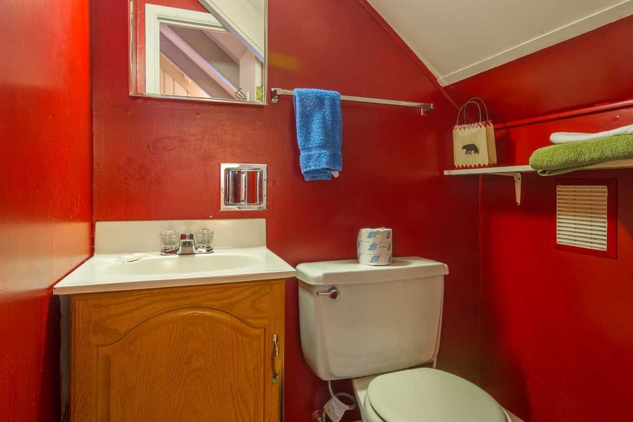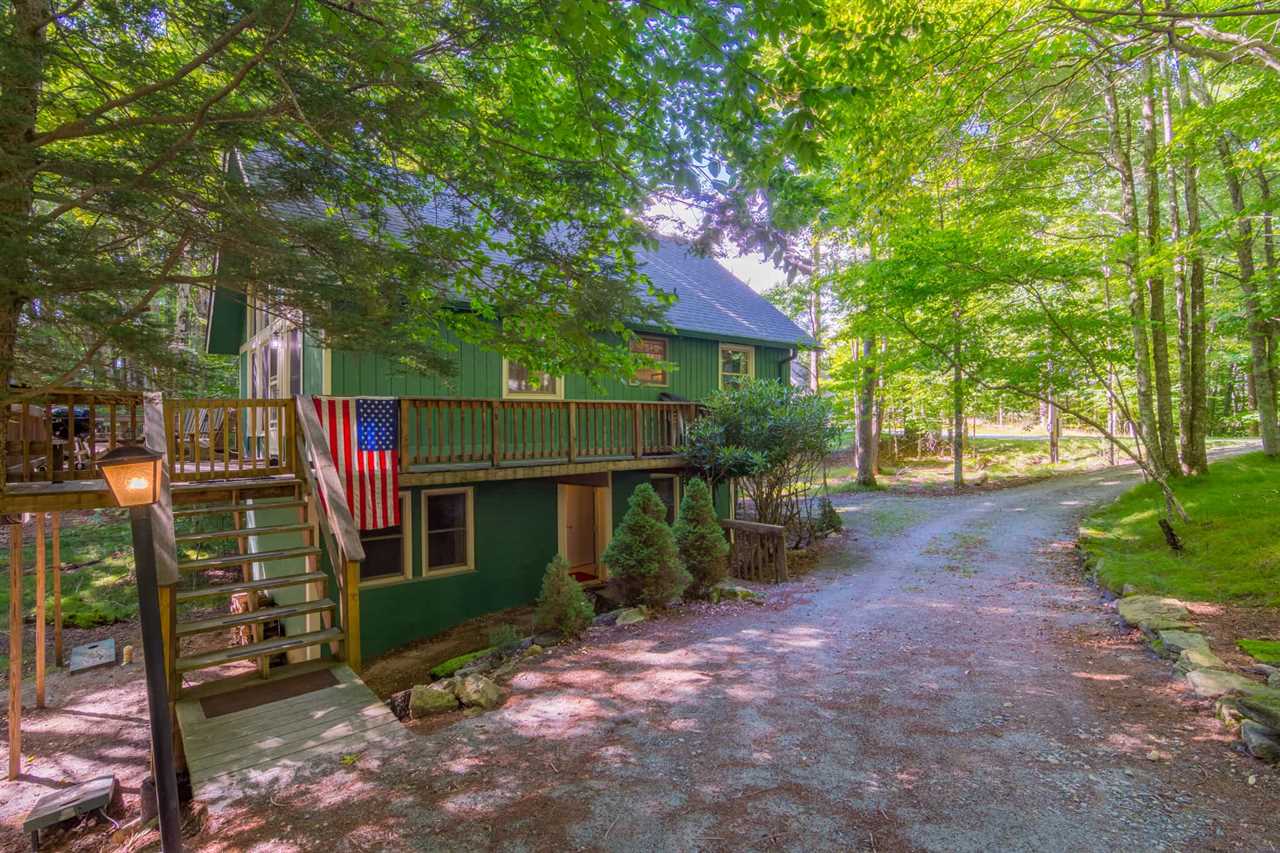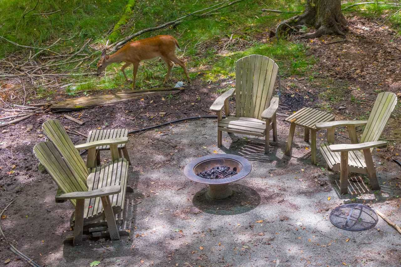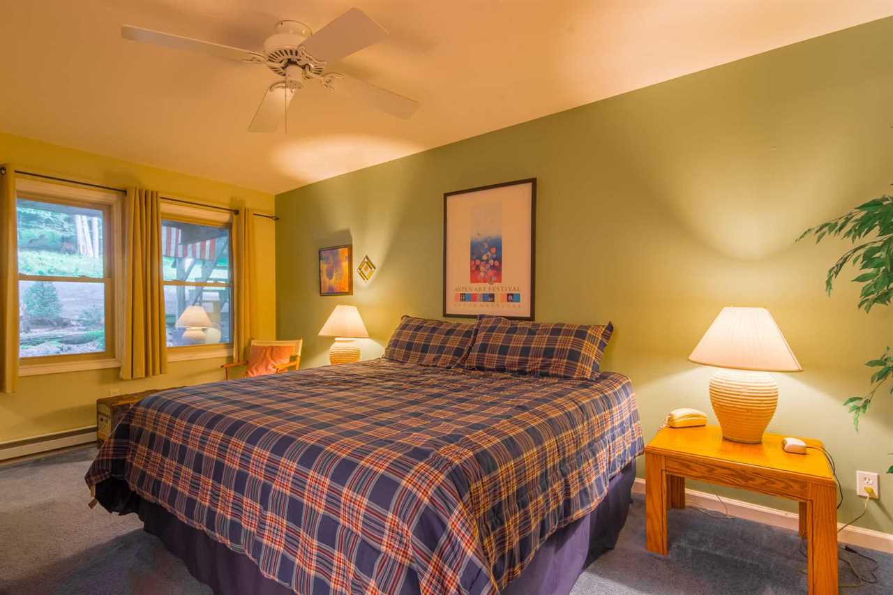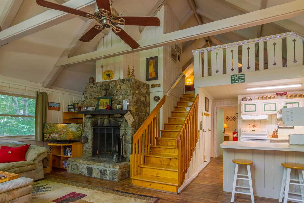 The kitchen, dining, and living areas have an open floor plan with a vaulted ceiling, a wall of windows, and a stone fireplace in the main living area. The home also has access from the parking area to the lower level where the king suite is located. Outside is a fire pit, a horseshoe pitch, and a cornhole game.