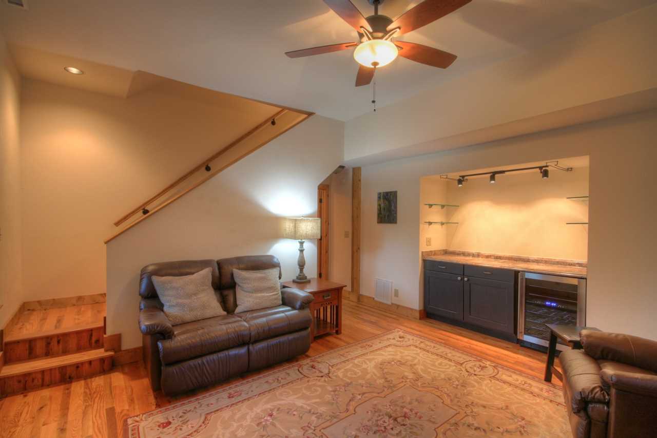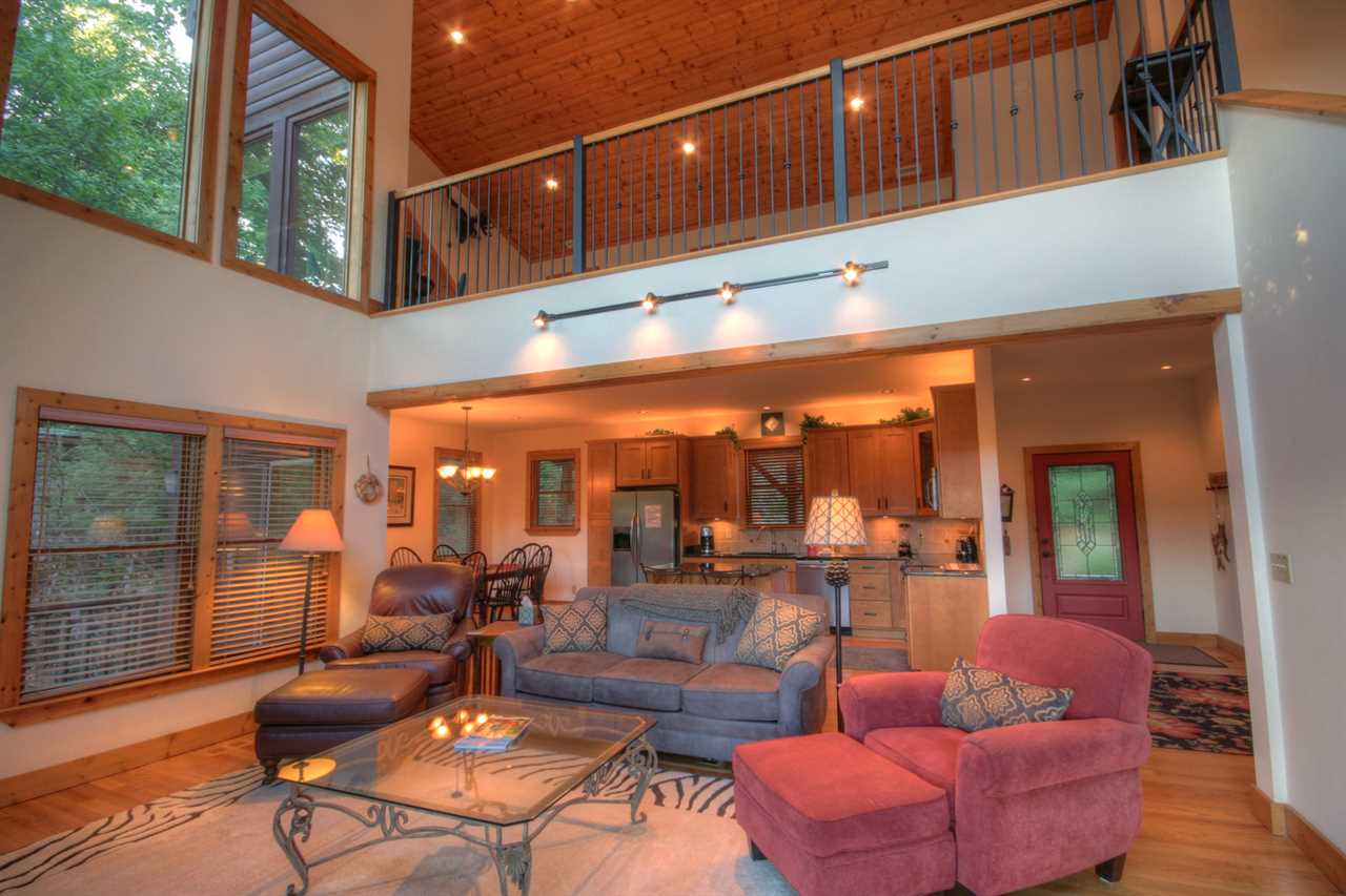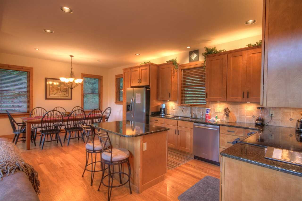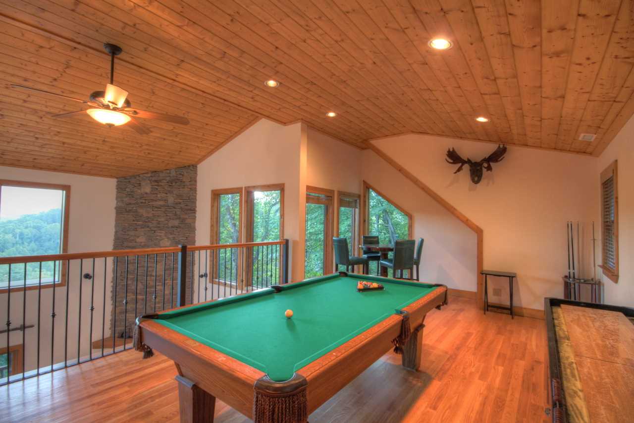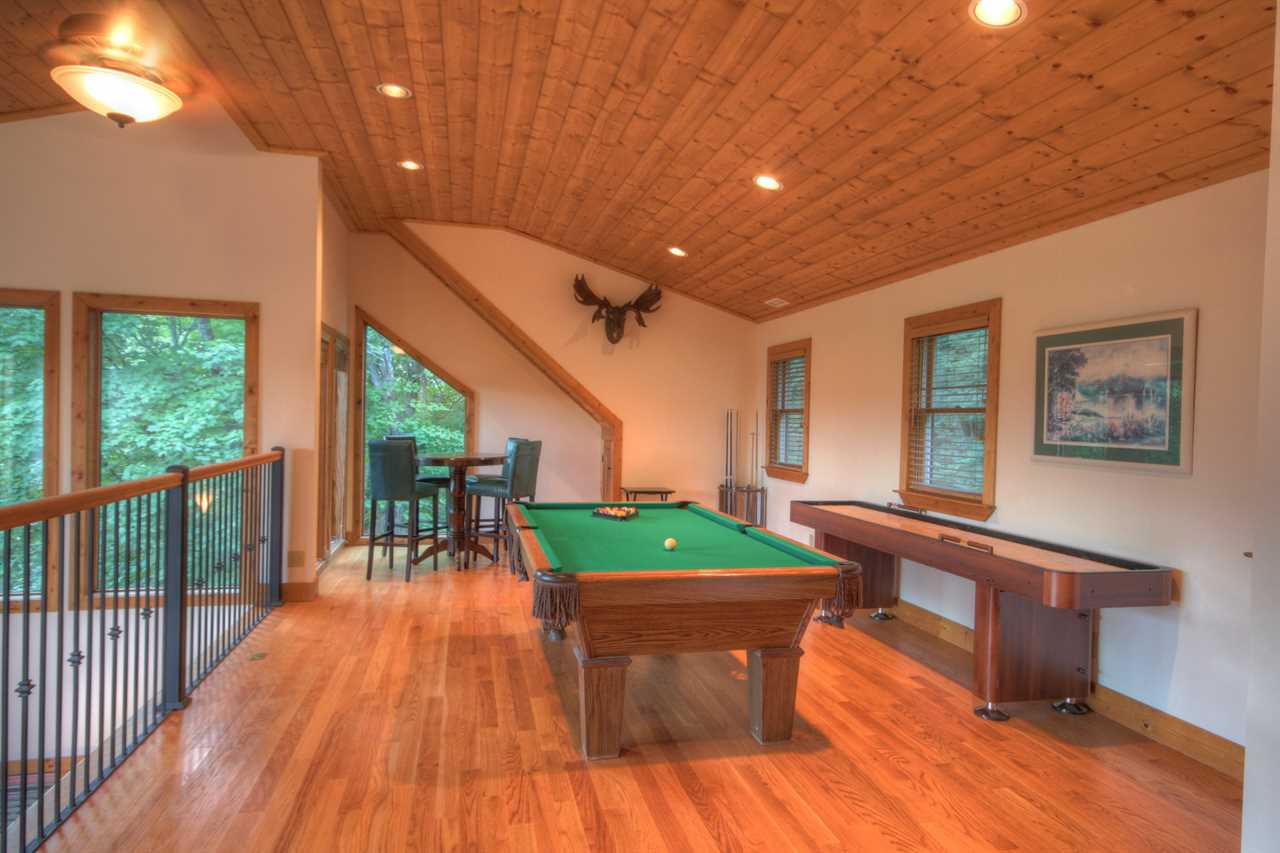 The interior features an open floor plan with hardwood floors, vaulted tongue-and-groove ceilings, and modern touches. The kitchen is updated with stainless steel appliances, granite countertops, custom cabinetry, and a granite island. The dining table seats 8 and 2 more can sit at the nearby island. The upstairs loft has a game space with a pool table, shuffleboard table, and a card table. Downstairs has a media room with a large TV, a Blu-Ray player, comfortable seating, a dry bar, and a wine refrigerator.