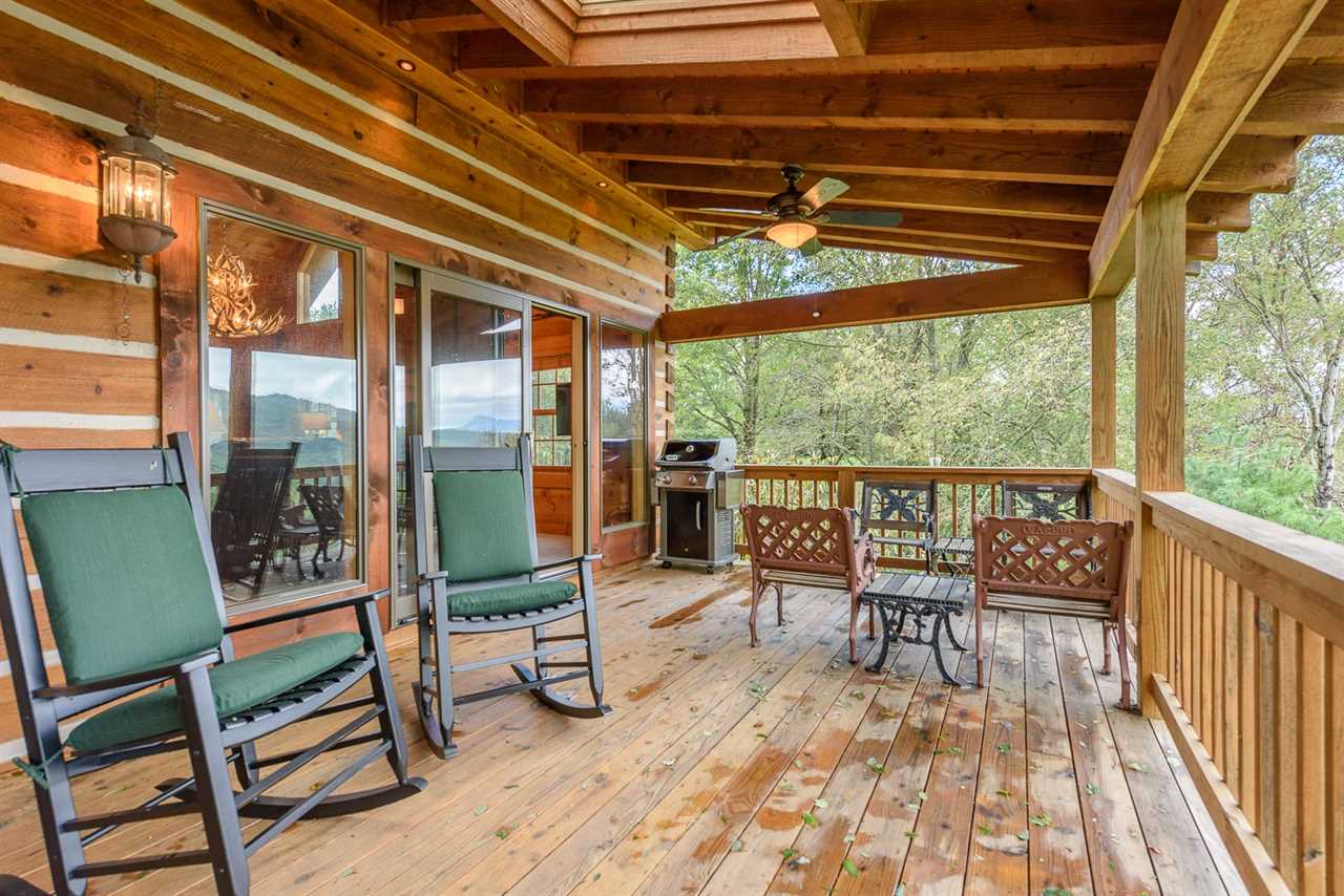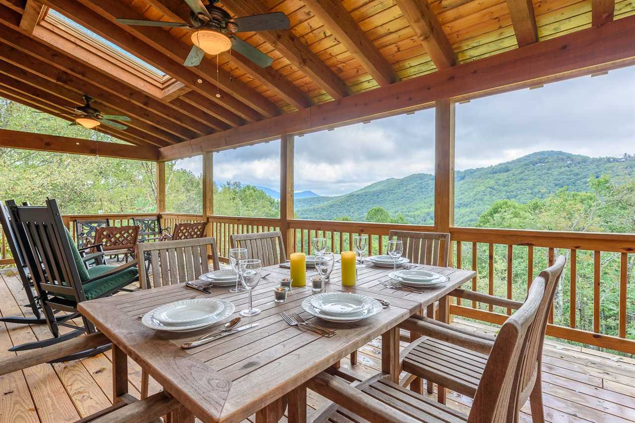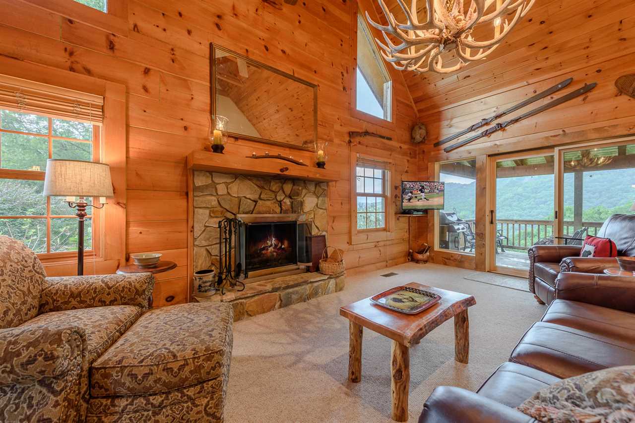 An open-concept great room with vaulted tongue-and-groove ceilings, leather furniture, a stone wood-burning fireplace (not available for use in Summer), and a large HDTV share space with the dining area. The kitchen has stainless appliances and a gas cooktop. The dining area has a banquet-style dining table which can expand to seat up to eight (8) guests. Sliding glass doors open to a large covered porch on the rear with outdoor dining and entertainment furniture, skylights and ceiling fans, a gas grill, and a hot tub, all overlooking miles of unobstructed mountain views.